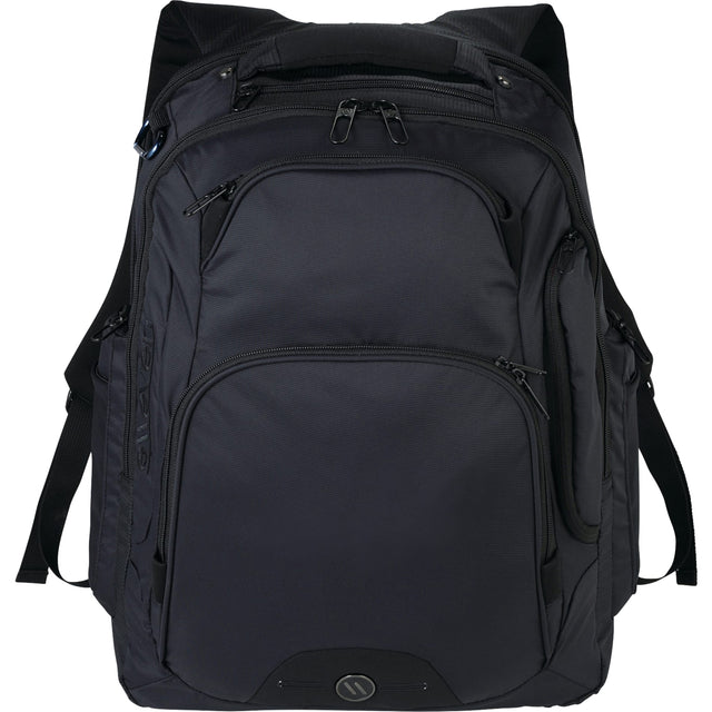 The elleven™ Rutter TSA 17 inch Computer Backpack incorporates executive looks with modern technological and travel needs. Fits most 1 inch laptops in a padded rear computer compartment while the main compartment includes a file divider and dedicated iPad®/tablet pocket. Zippered top nylex-lined pocket fits your iPhone® or other smartphone. Special RFID pocket on the front helps prevent identity theft by shielding your credit card and passport. Additional front pocket includes deluxe organization while the zippered side pockets are perfect for your cables or portable power and the dual mesh side pockets for your water bottle. There is even a hidden mesh pocket on the backpack strap for your phone or ID. Includes a padded neoprene handle, back and adjustable shoulder straps. A trolley handle attachment is integrated into the back panel. Free run charges for embroidery up to 10,000 stitches. Disclaimer: There may be minor variations in color of the actual product.