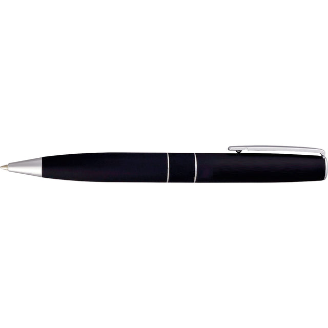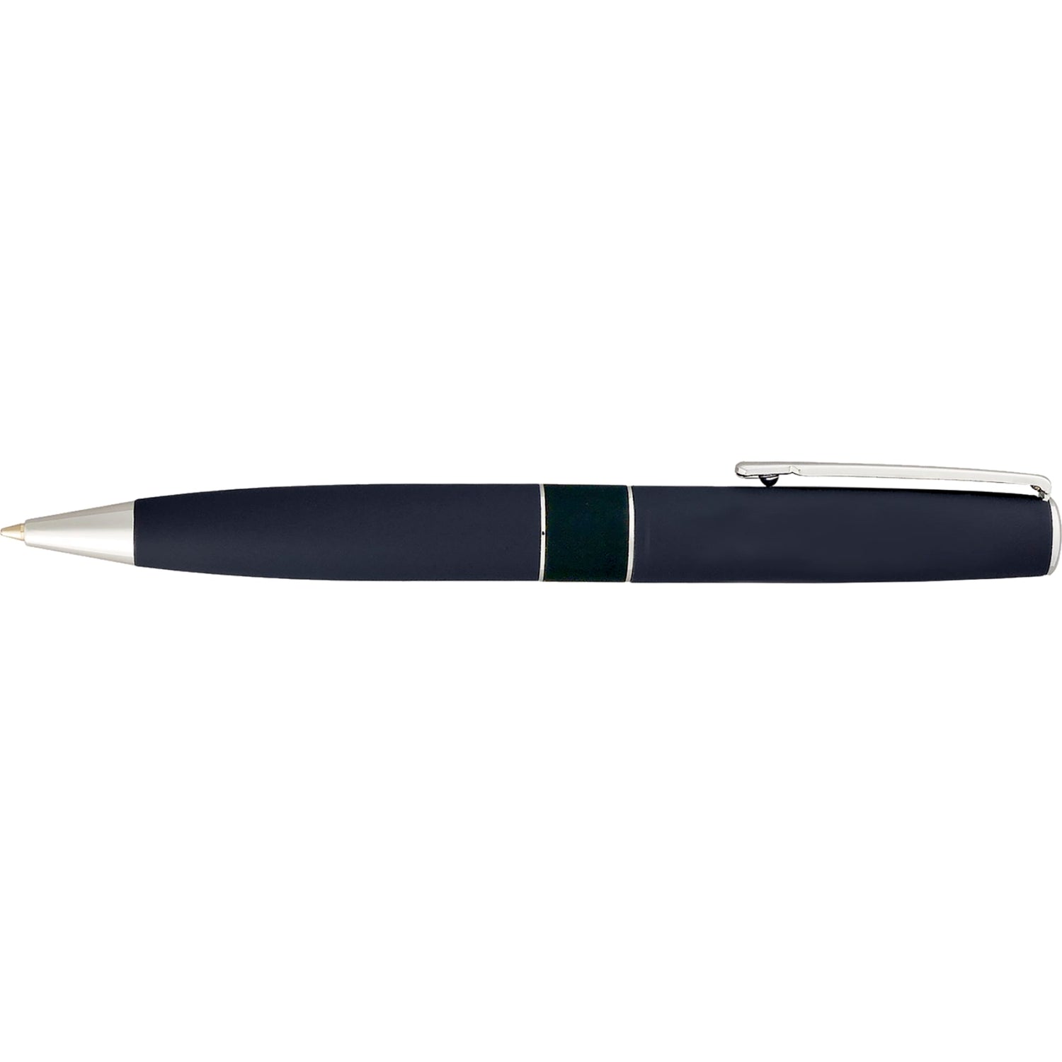 Spray rubber coat finish provides hours of comfort writing. Twist action mechanism. Pen includes premium black ink cartridge. 1.0mm pen tip. Laser finish is shiny chrome.