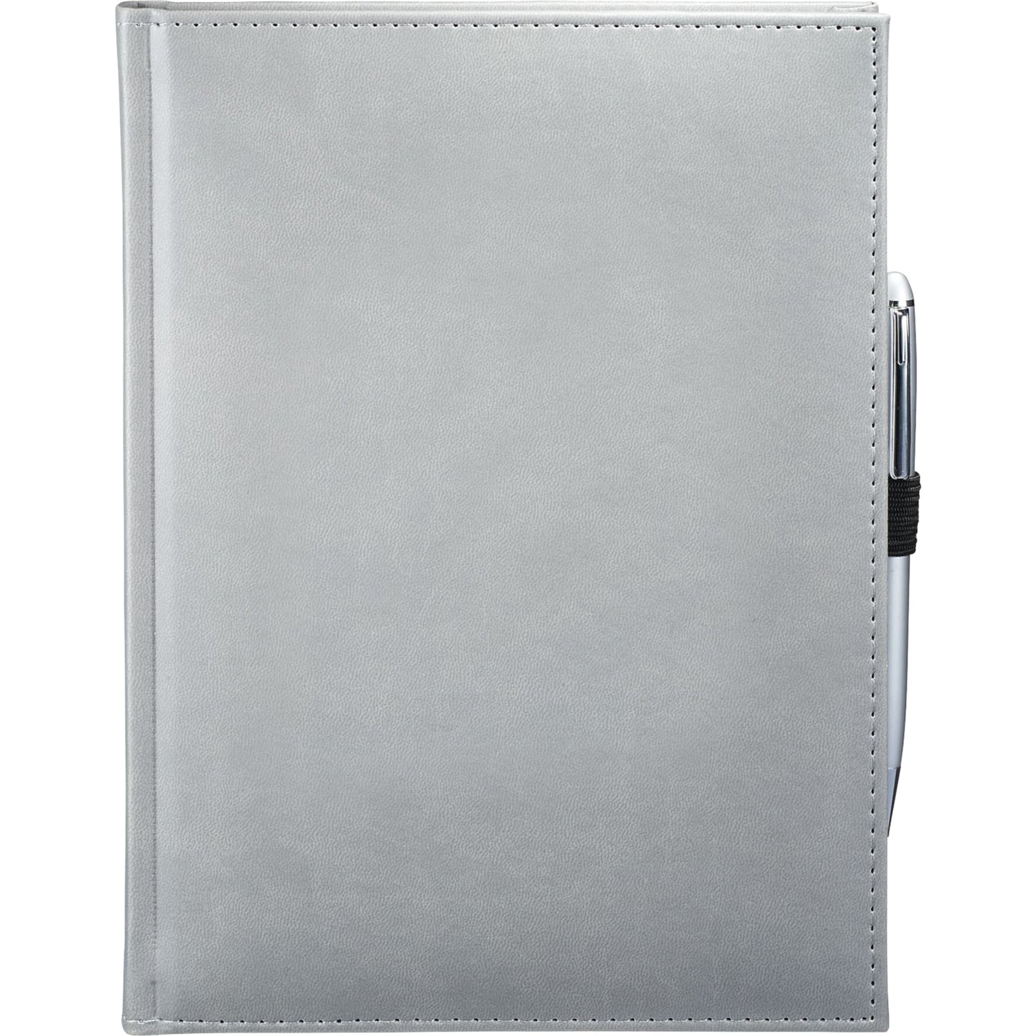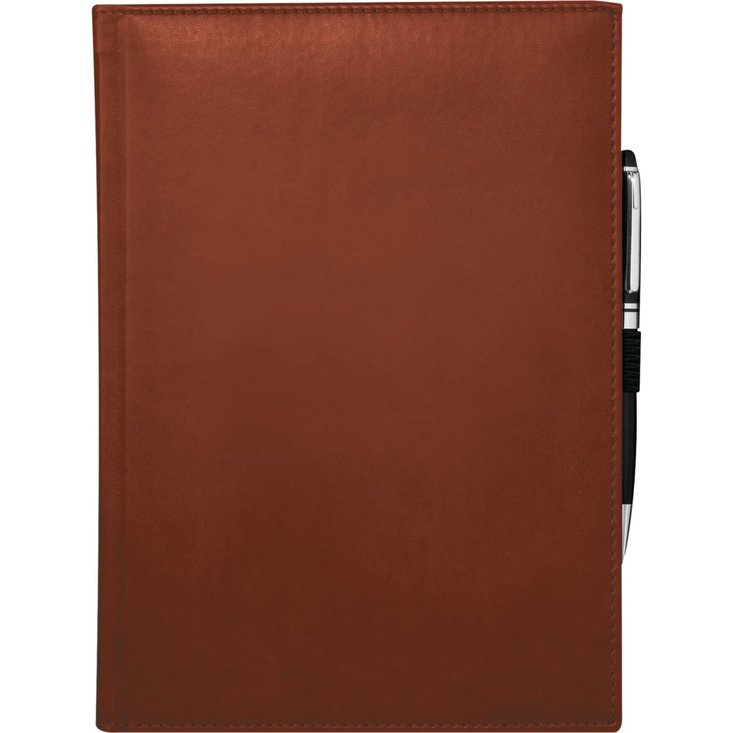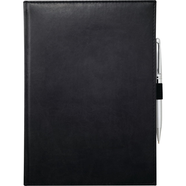 The 7" x 10" FSC® Mix Pedova™ Large Bound Journal is a hardcover bound journal featuring Italian UltraHyde construction. It contains 125 sheets of FSC® Mix white lined paper with built-in ribbon page markers to help hold your place between uses. This stylish notebook also features an elastic pen loop, with pens available to order separately.
