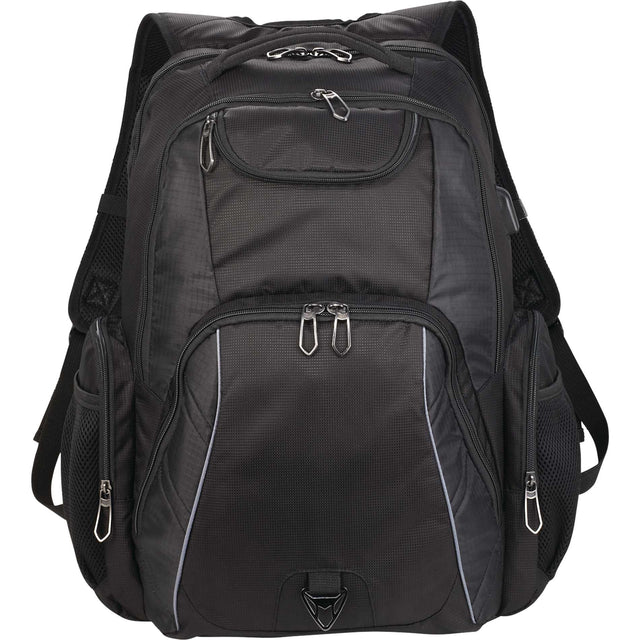 The Rainier TSA 17" Computer Backpack features a large zippered main compartment that offers ample room for all of your tech accessories and tablets. Main compartment has built in USB port and cable which allows for seamless charging capabilities of your tech products inside the backpack. Includes a 17 inch TSA computer compartment that unfolds to lay flat on the X-ray belt to increase speed through security. Additional storage on the front panel of the bag include a deluxe organizational panel, easy access top pocket compartment and two zippered side pockets with mesh water bottle pockets. Custom zipper pullers, padded back panel, chest strap and trolley sleeve.