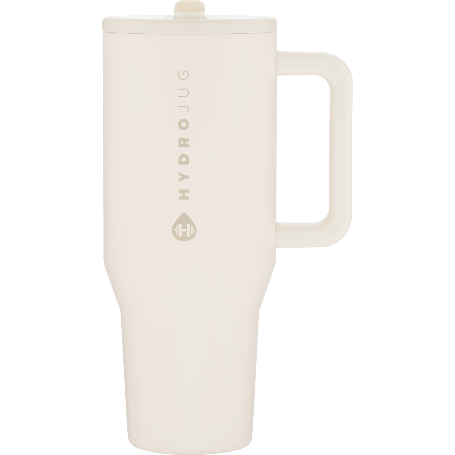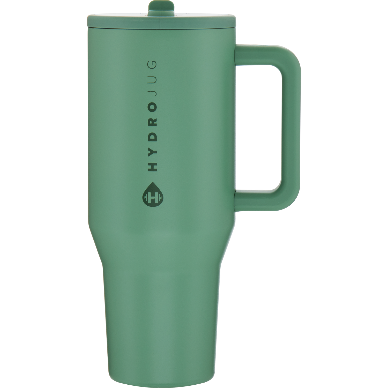 The HydroJug Traveler 32 oz thermal mug is made for serious hydration with durable performance. Constructed from 18/8 stainless steel with double wall construction and copper vacuum insulation, it keeps cold beverages chilled for hours. It features an ambidextrous threaded lid with a matching flip-up spout, a soft straw for easy sipping, and a wide ergonomic handle for effortless carrying. Finished with a durable powder coated exterior for a secure, stylish grip.