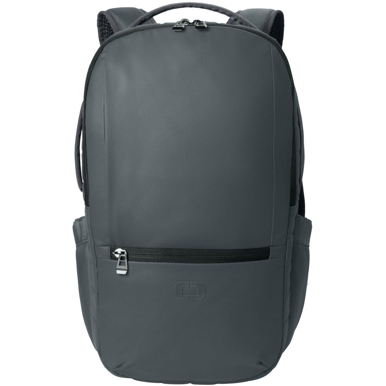 400D x 400D recycled RPET ballistic poly PU/600D ballistic poly 200D recycled RPET poly debossed lining Large main compartment with interior mesh pockets Dedicated laptop compartment Interior mesh gear pockets and headphone storage Interior office Vertical zippered front pocket Zippered front bottom pocket Expandable side pockets Luggage trolley pass through on back Padded top and side grab handles Padded air mesh shoulder straps with webbing and stash pocket Raised O icon heat transfer on front Laptop sleeve dimensions: 18.5'h x 12'w; fits most 18' laptops Dimensions: 19'h x 12'w x 8'd Capacity: 1,220.5 cu. in./20 L Weight: 2.6 lbs./1.2 kg Note: Bags not intended for use by children 12 and under.