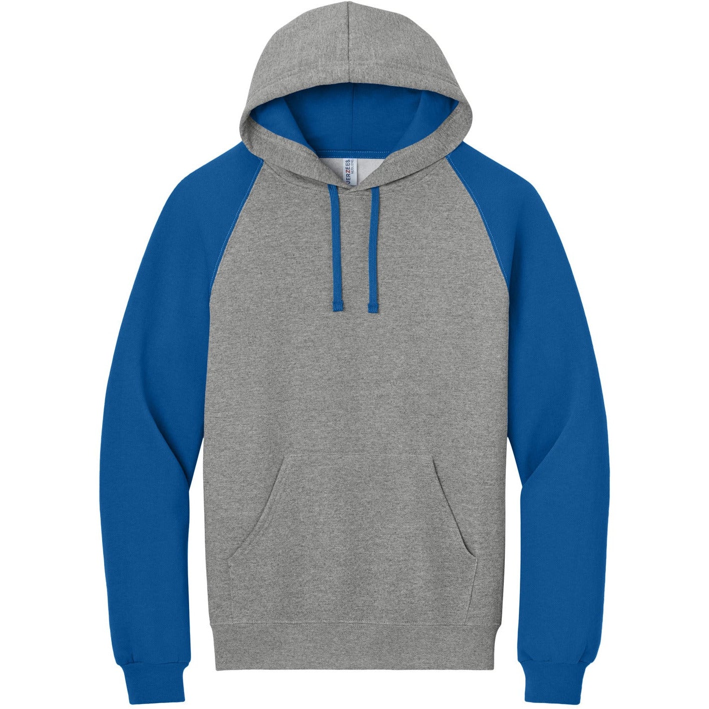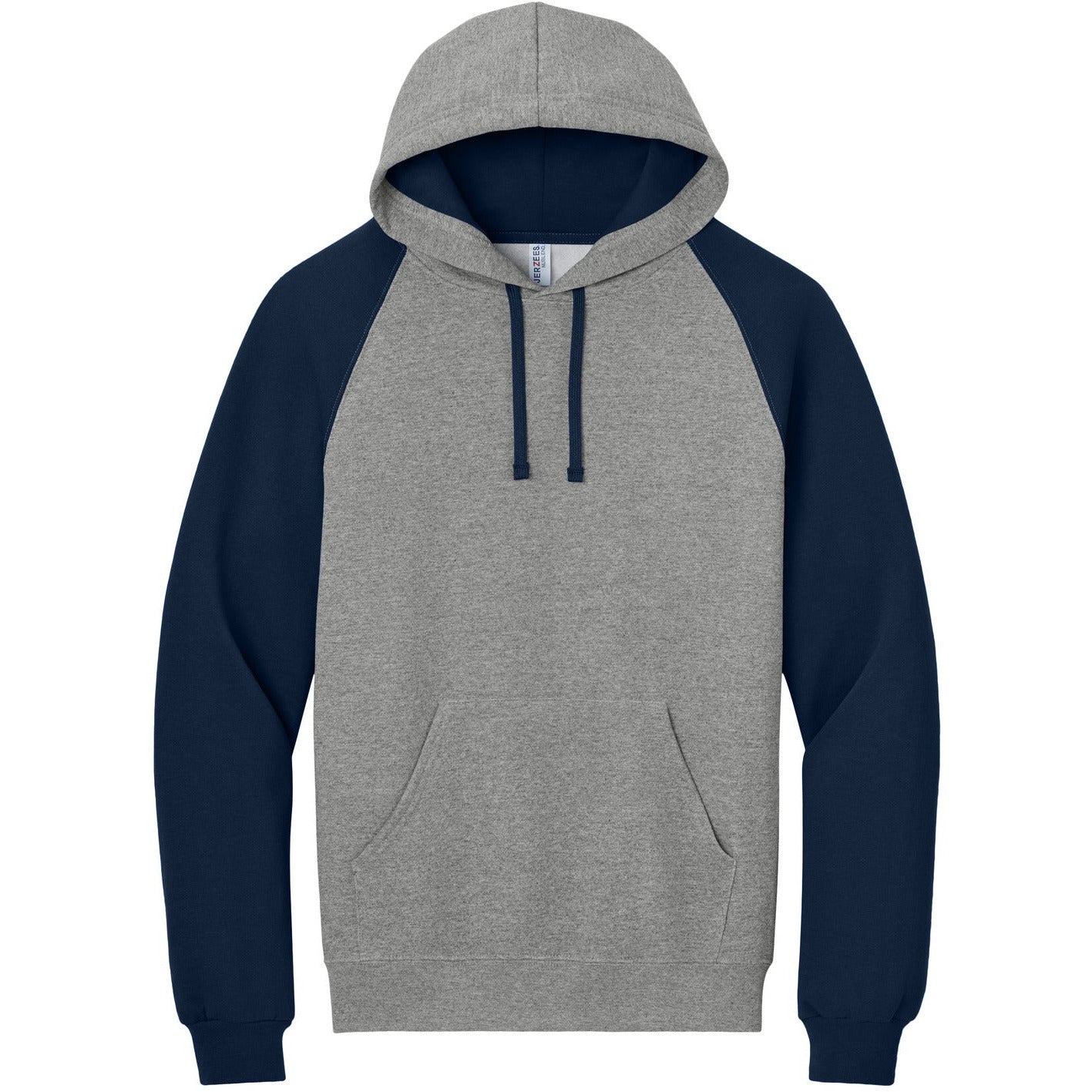 8-ounce, 50/50 cotton/polyester NuBlend pill-resistant fleece 48/52 cotton/polyester (Oxford) Made with sustainably sourced USA-grown cotton High stitch density for a smooth printing surface Two-ply hood with grommets Single-needle topstitch on front neck Contrast tipped and knotted flat drawcords Contrast raglan sleeves Front pouch pocket 1x1 rib knit cuffs and hem Double-needle coverstitching on armholes and hem Tear-away label