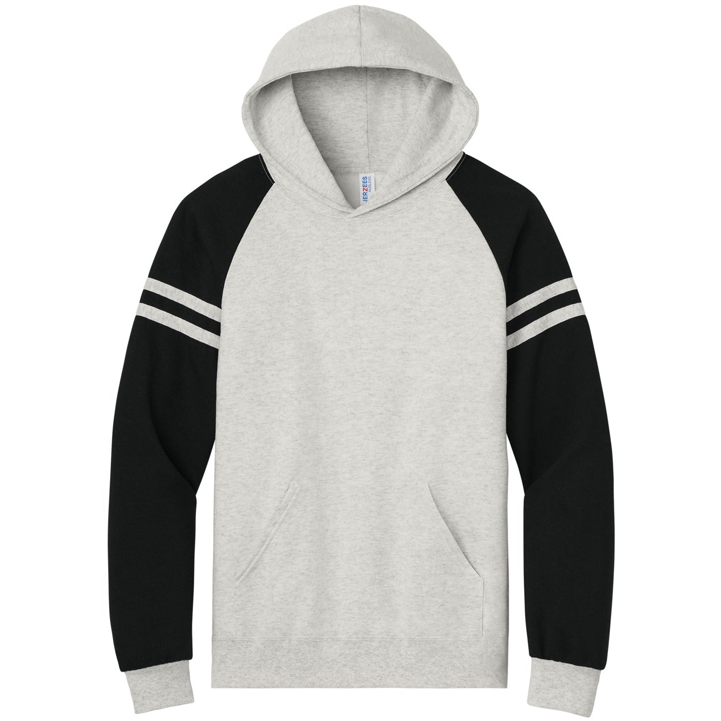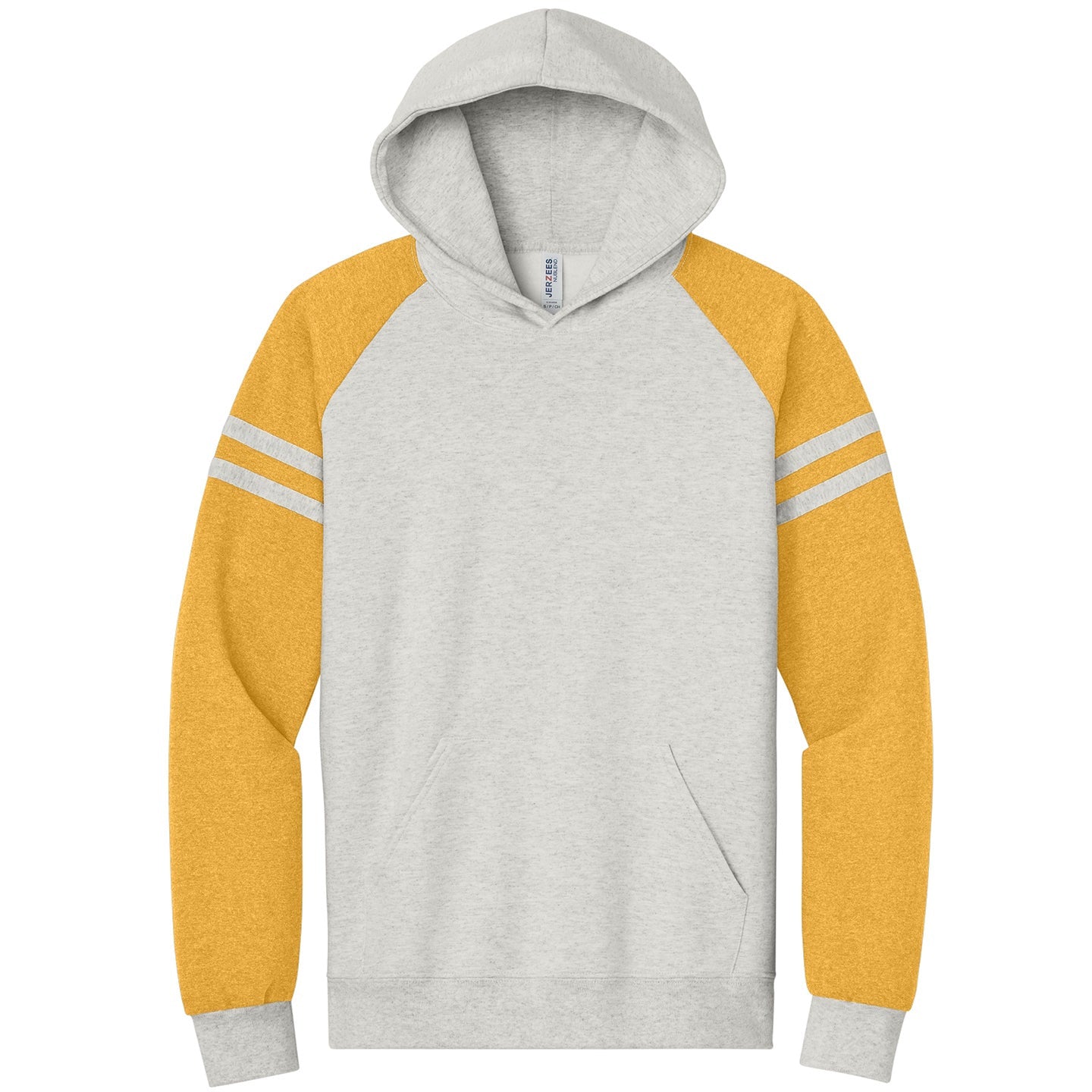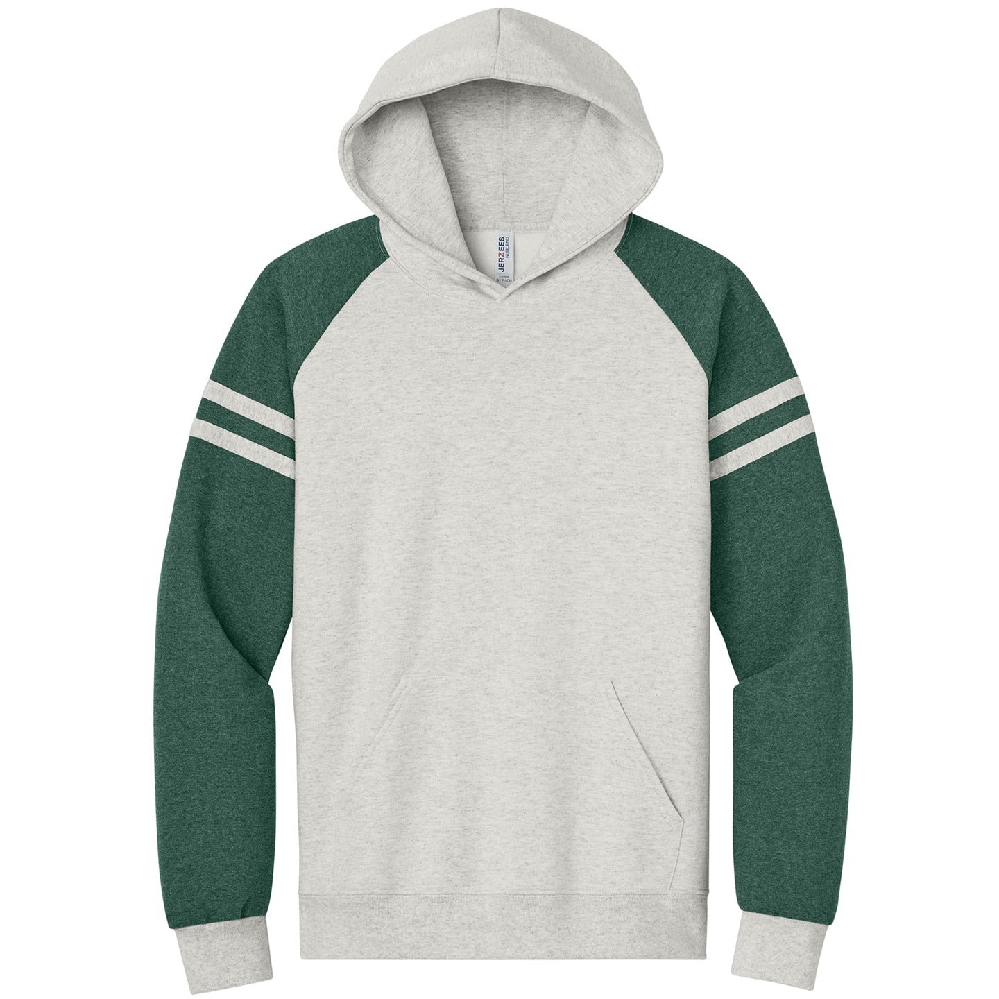 8-ounce, 50/50 cotton/polyester NuBlend pill-resistant fleece Made with sustainably sourced USA-grown cotton High stitch density for a smooth printing surface Jersey-lined hood No drawcord in hood Contrast raglan sleeves Athletic-inspired varsity stripes on sleeves Front pouch pocket 1x1 rib knit cuffs and hem Double-needle coverstitching on armholes and hem Tear-away label