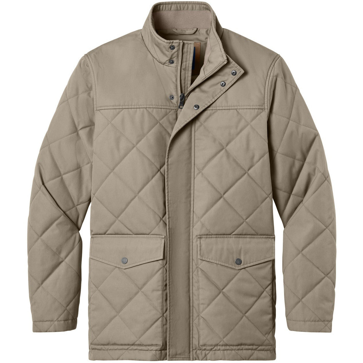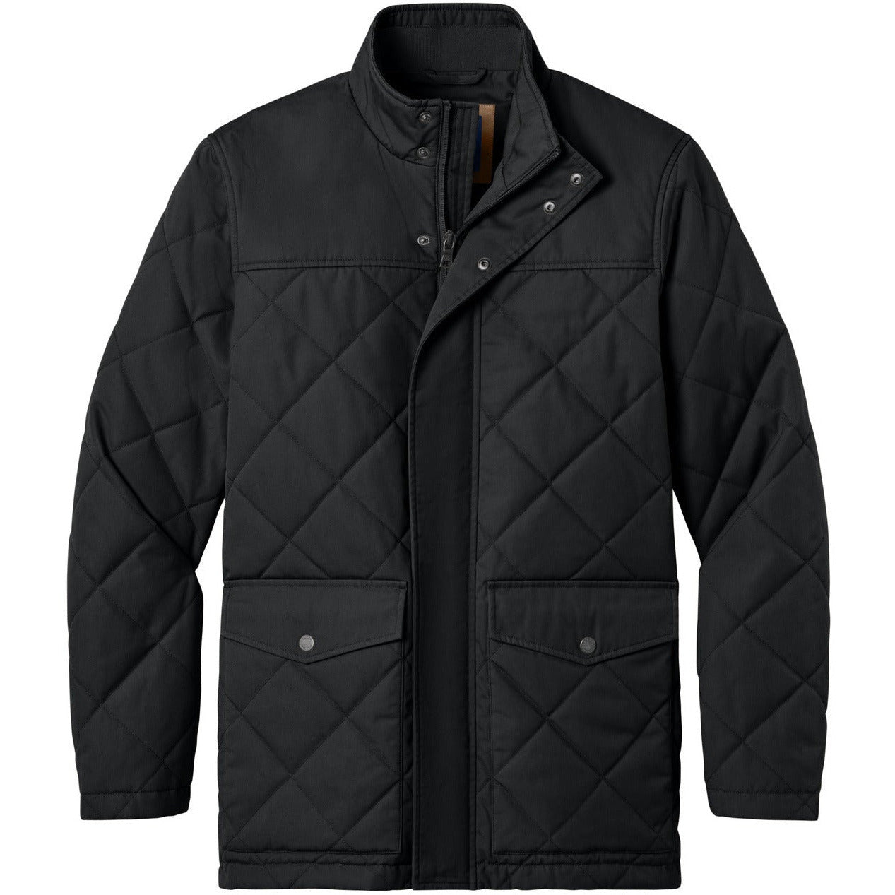 Blending contemporary with classic, this beautifully diamond-quilted coat delivers water-resistant performance and polished style for year-round layering. 65/35 polyester/cotton with a durable water-repellent (DWR) finish 3.5-ounce polyfill insulation Faux leather Brooks Brothers logo patch Self-fabric hanging loop Zip-through, rib knit lined collar Reverse coil 2-way front zipper with metal Brooks Brothers Golden Fleece logo zipper pull Storm flap Interior snap chest pocket Dual-entry hand pockets secured with flaps and Brooks Brothers logo snaps Decoration access pocket