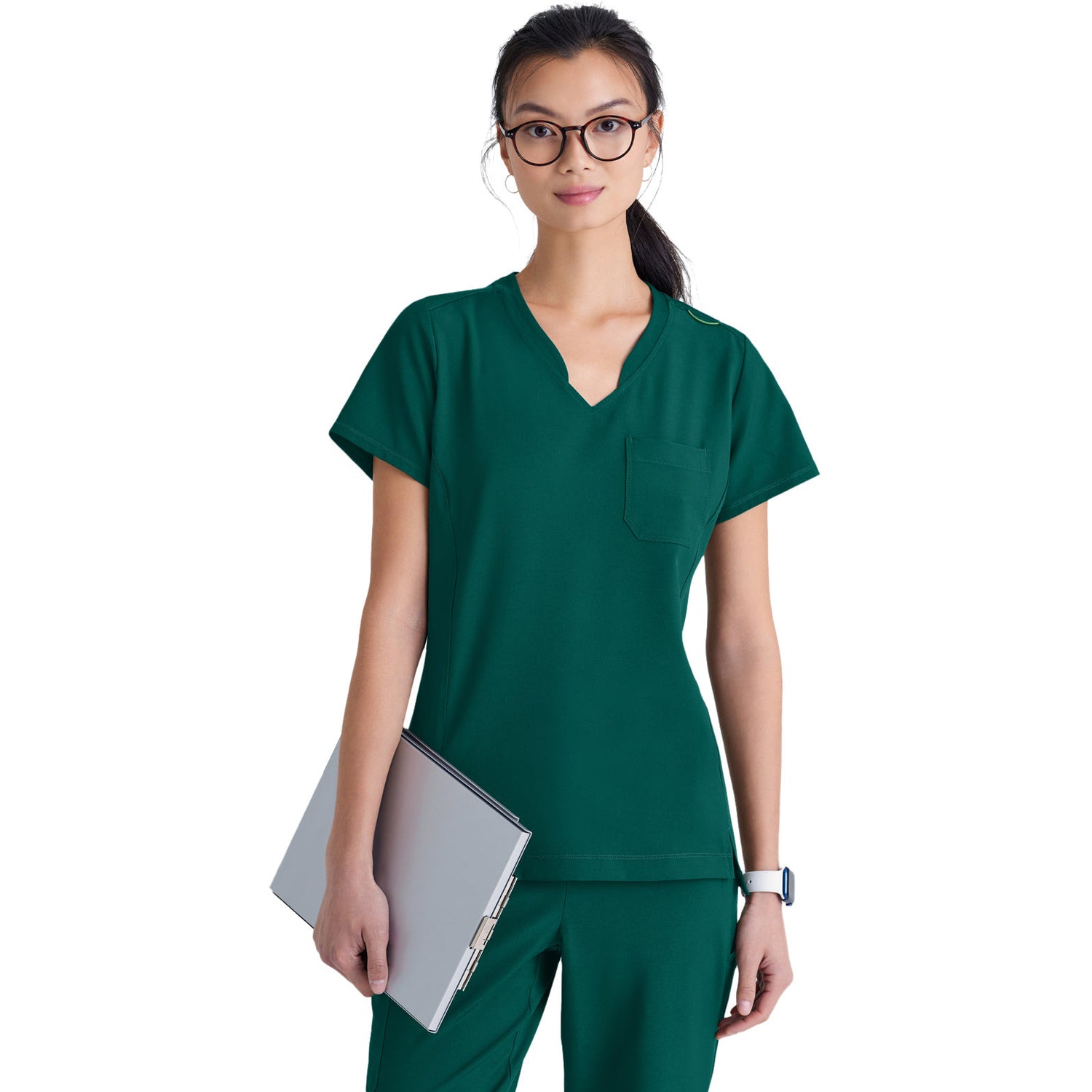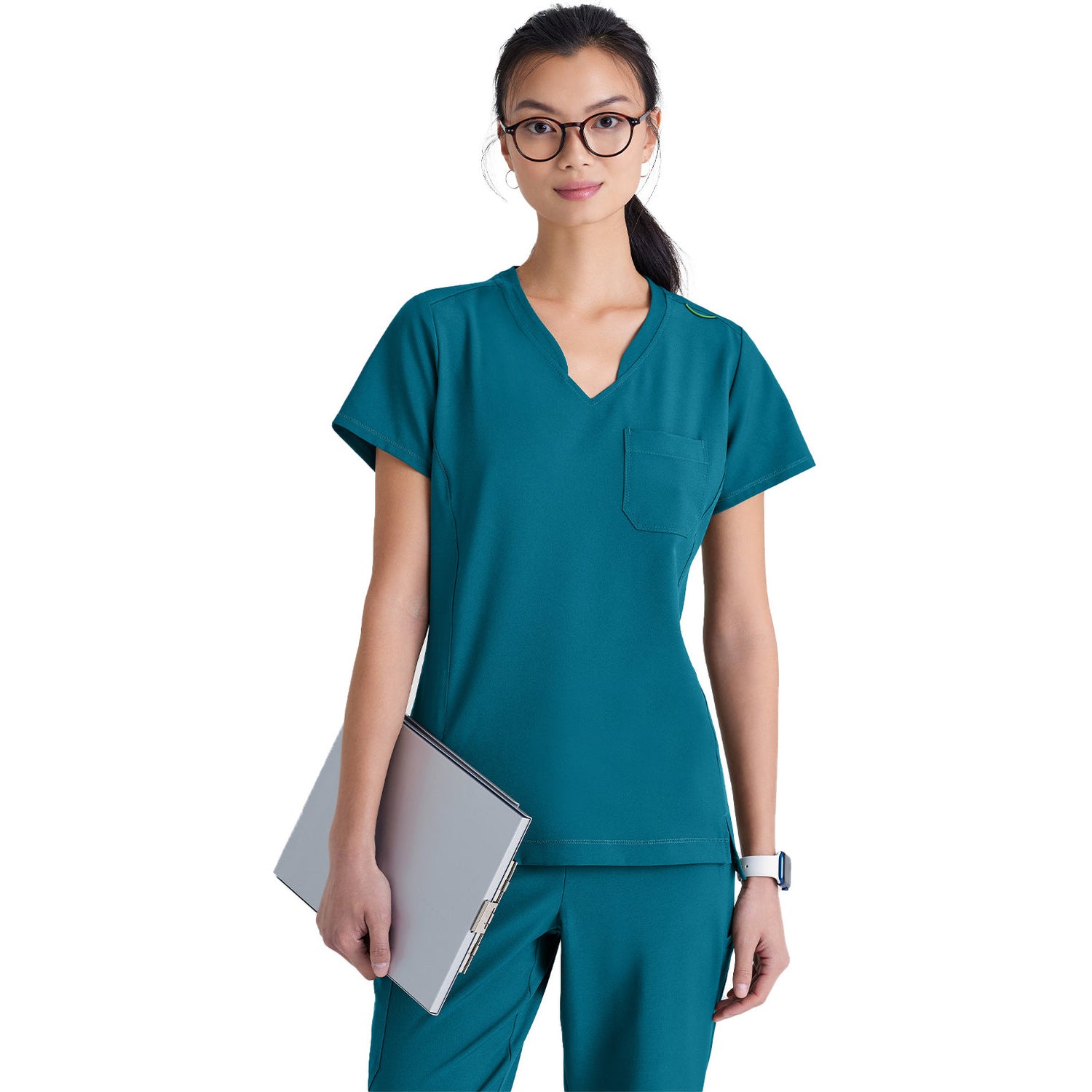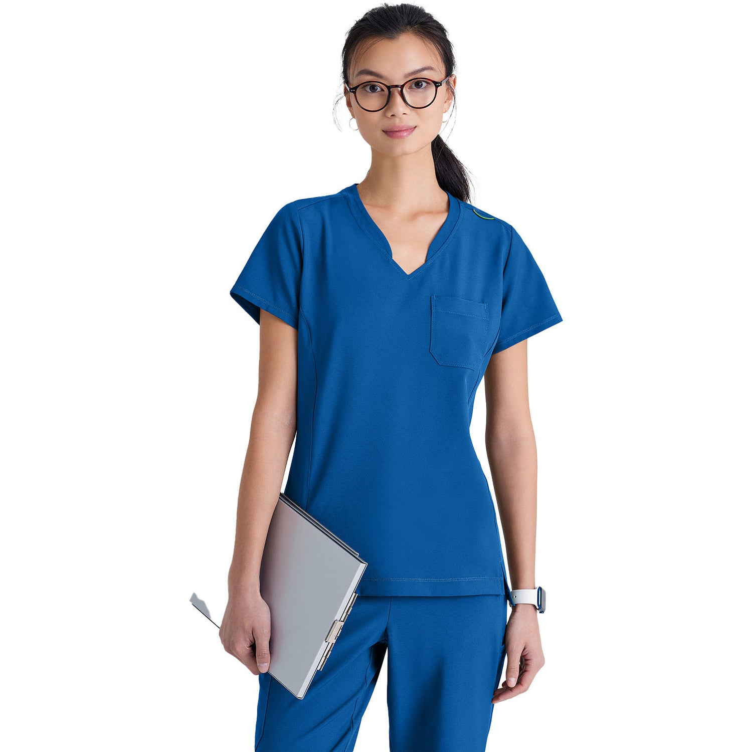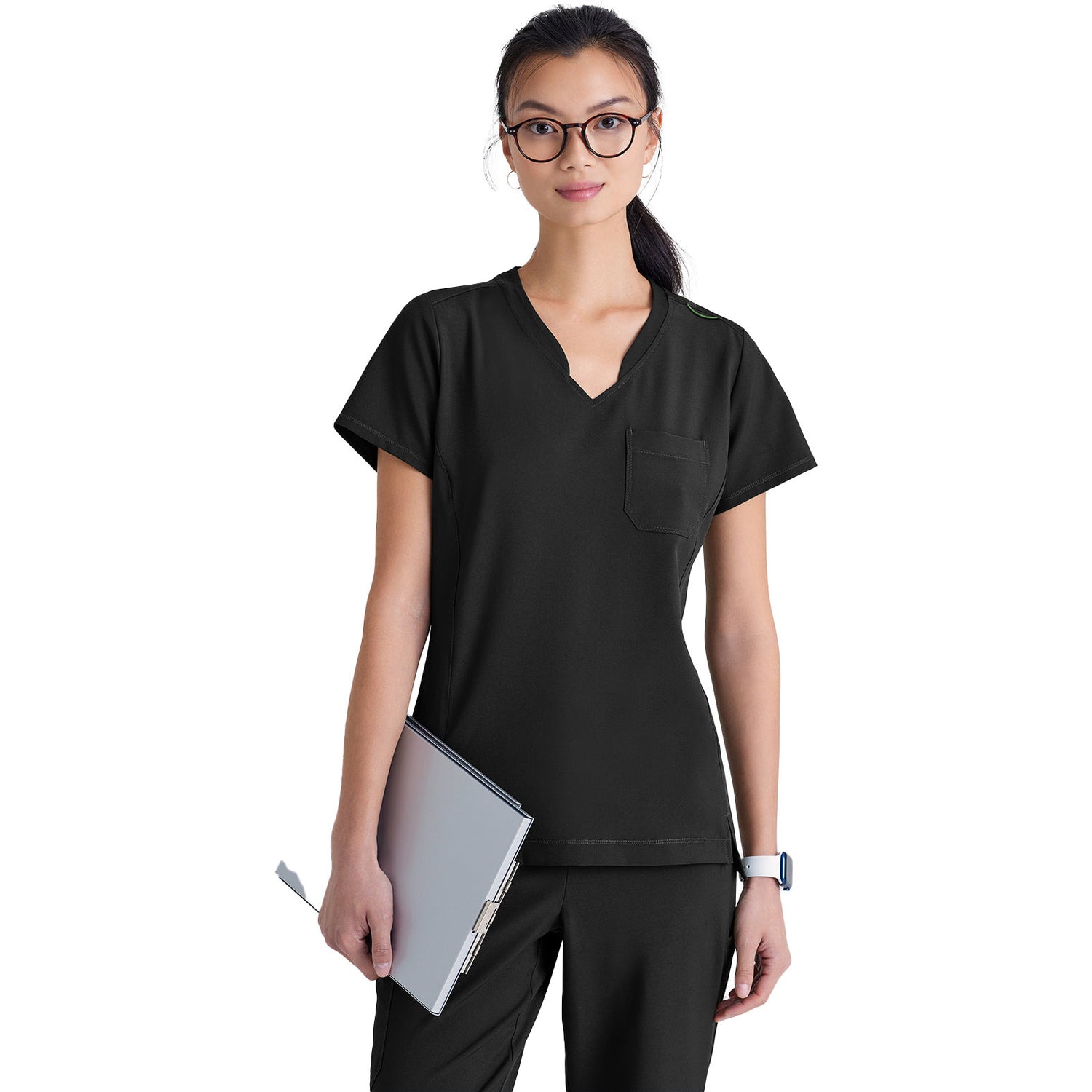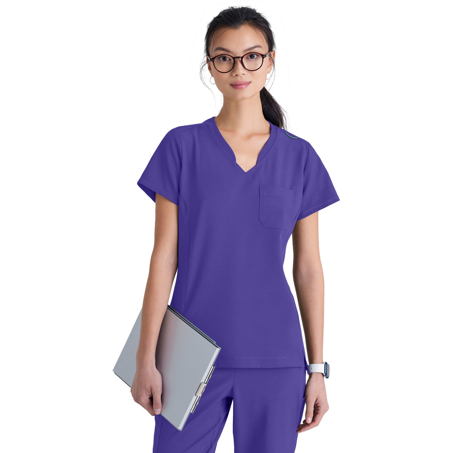 Set yourself up for success with this modern top from Grey's Anatomy by Barco Evolve. The clean design features a banded v-neck that complements the high-low step hem, while princess seams provide a flattering fit. Plus, the signature green loop offers a convenient place for your badge. The sustainable fabric is soft, stretchy, and breathable for all-day comfort.