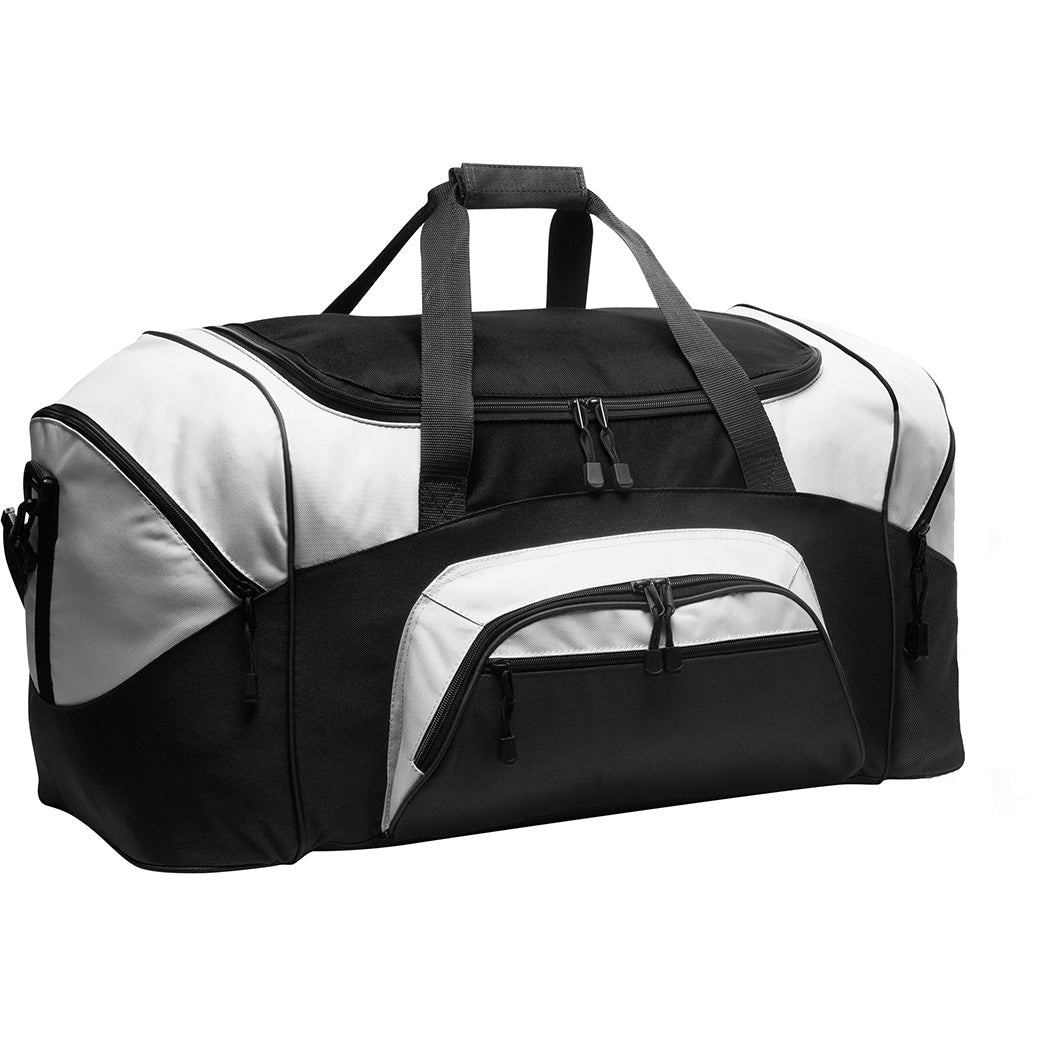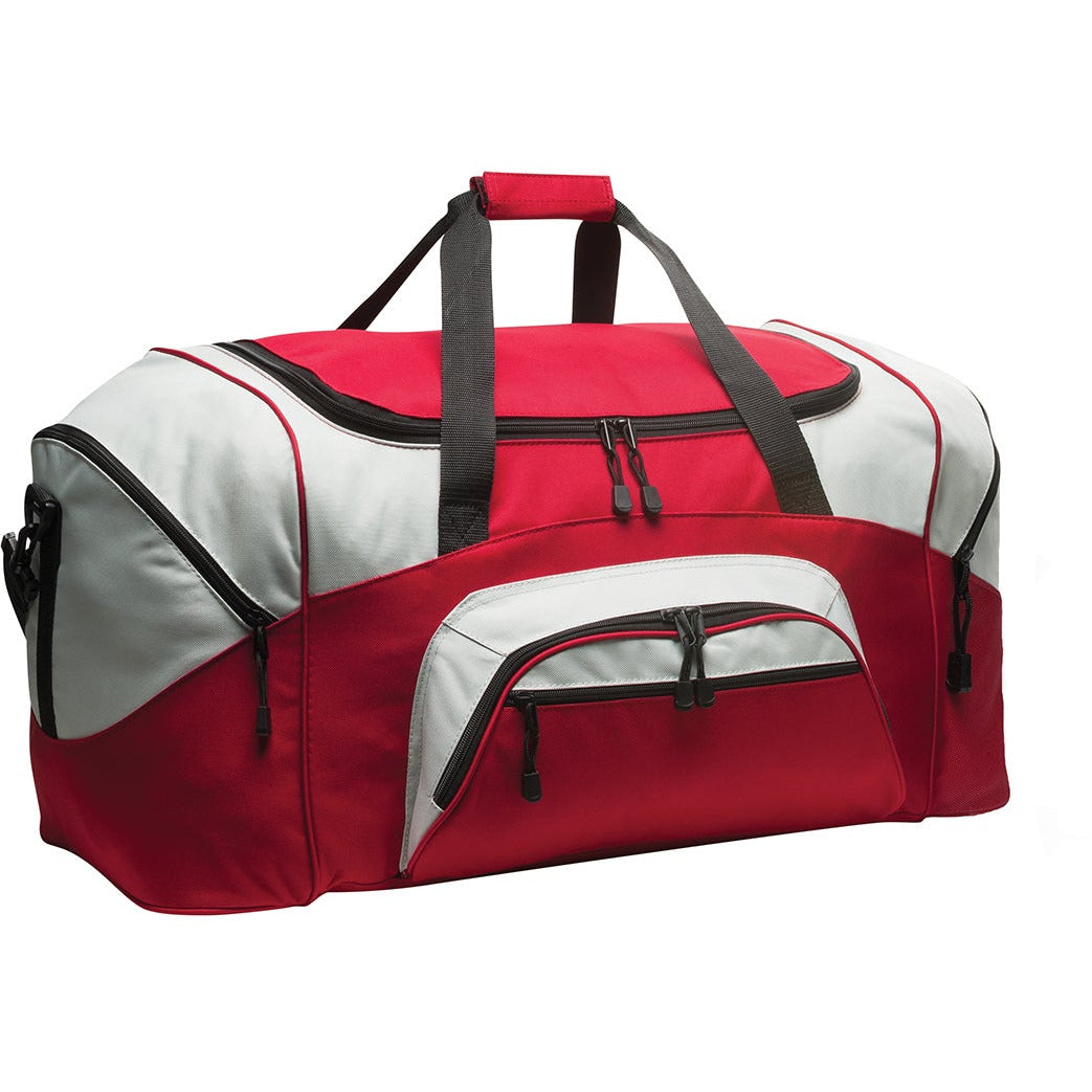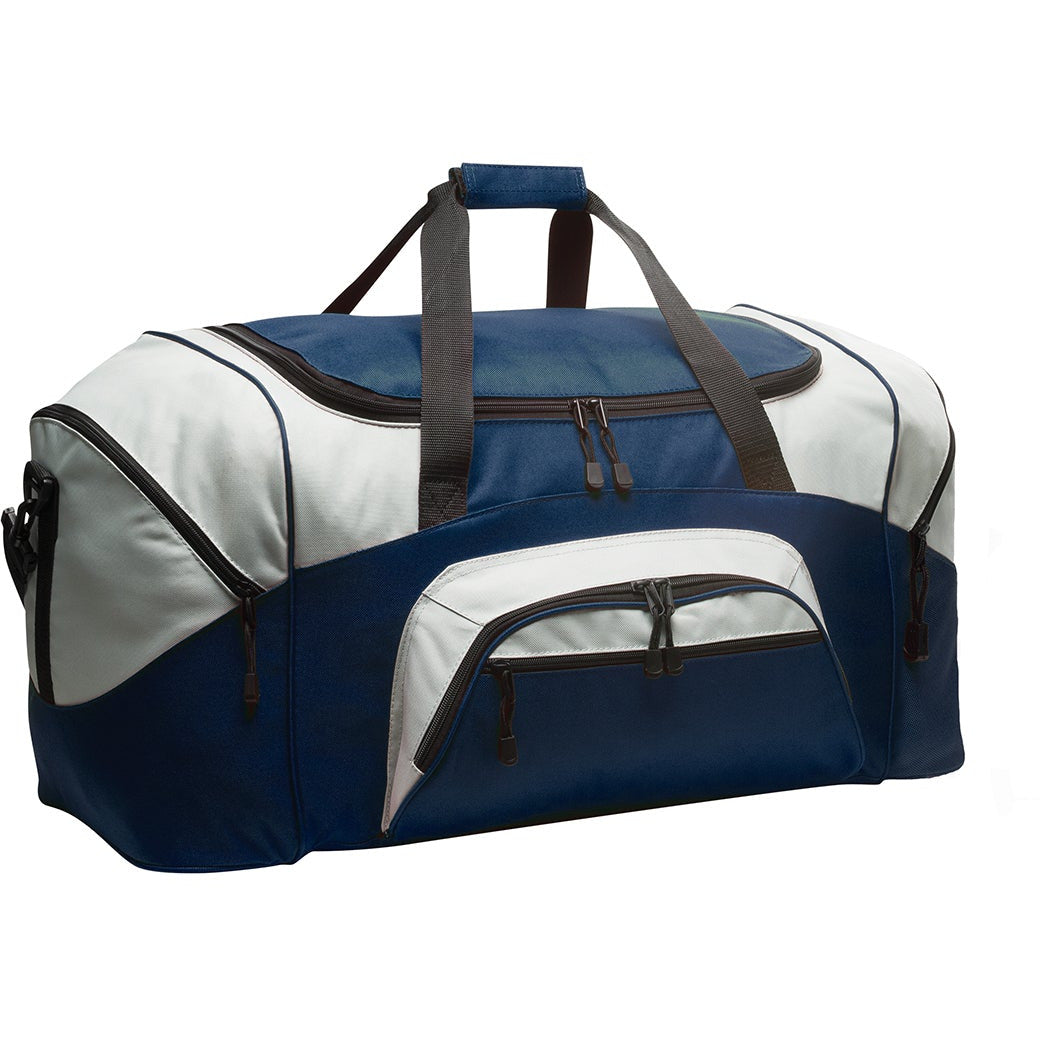 Our best-selling, budget-friendly duffel is sized for for sport gear. | 600 denier polyester canvas with 210 denier polyester lining D-shaped zippered entry for easy access in main compartment Two large zippered end pockets Two exterior zippered pockets on front Padded handle Detachable, adjustable shoulder strap Two front zippered pockets Two large side pockets Dimensions: 12.75'h x 27.25'w x 13.5'd; Approx. 4,690 cubic inches Note: Bags not intended for use by children 12 and under. Includes a California Prop 65 and social responsibility hangtag.
