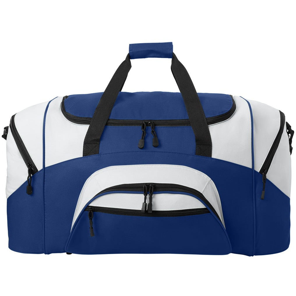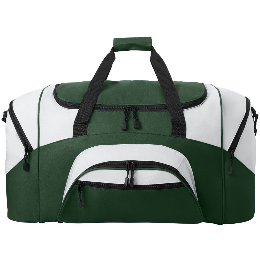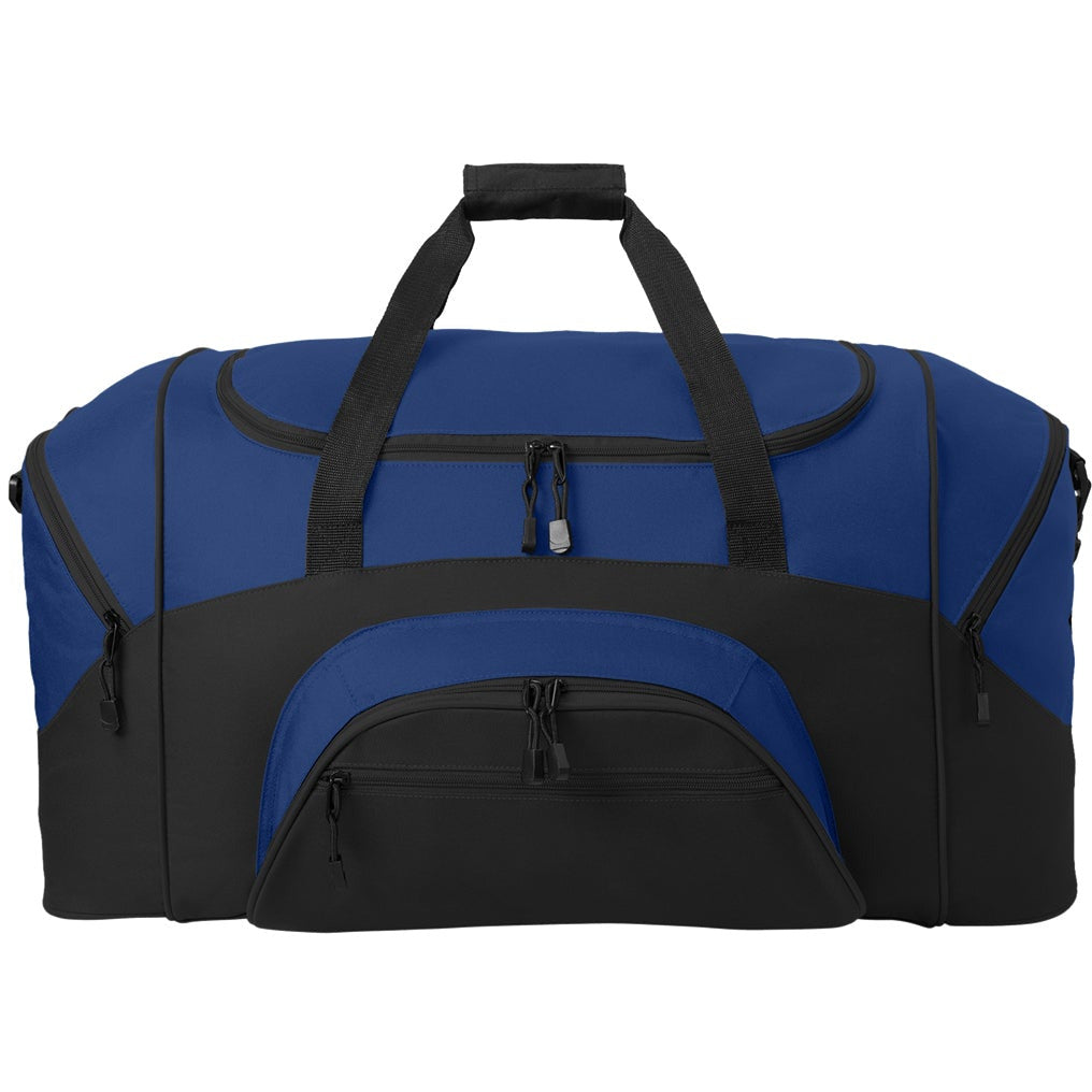 Our best-selling, budget-friendly duffel is sized for for sport gear. | 600 denier polyester canvas with 210 denier polyester lining D-shaped zippered entry for easy access in main compartment Two large zippered end pockets Two exterior zippered pockets on front Padded handle Detachable, adjustable shoulder strap Two front zippered pockets Two large side pockets Dimensions: 12.75'h x 27.25'w x 13.5'd; Approx. 4,690 cubic inches Note: Bags not intended for use by children 12 and under. Includes a California Prop 65 and social responsibility hangtag.