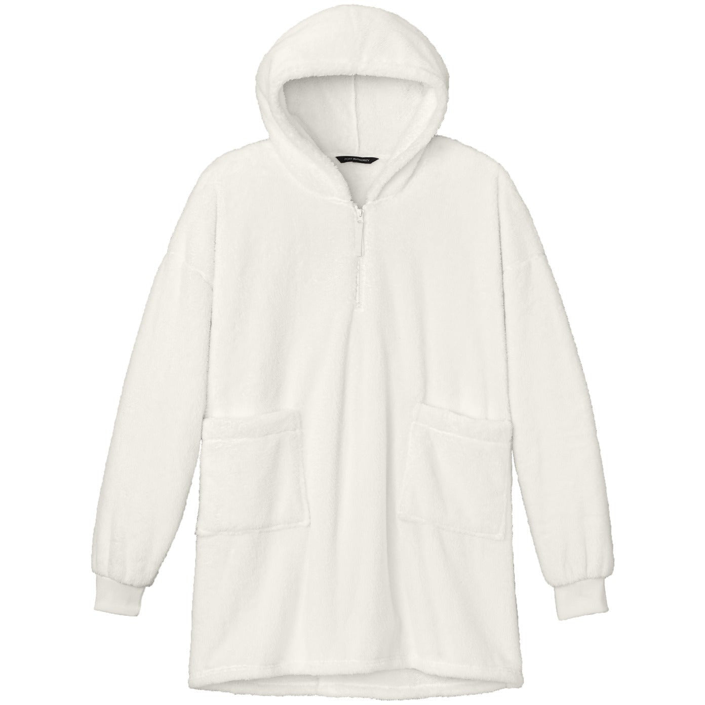 This two-sided brushed fleece poncho is simply fluffy and fun. Perfect for lounging, it offers a warm retreat any time of year. 7.9-ounce, 100% polyester fleece 1/2-zip popover style Generous hood Rib knit cuffs Patch pockets Drop tail hem Oversized fit