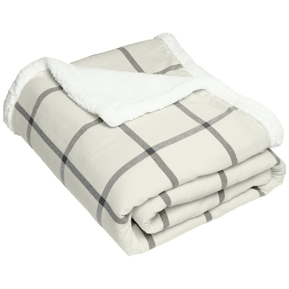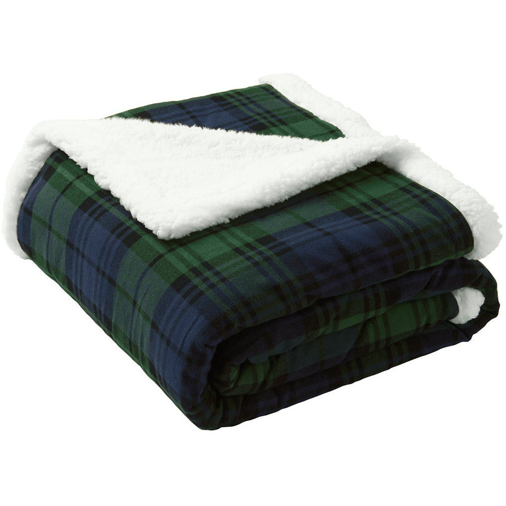 Classic, soft flannel on the front with cozy sherpa fleece on the back, this blanket is perfect for bundling up beside a fire on a chilly day. 10.4-ounce linear, 100% cotton flannel; 12.6 ounce linear yard, 100% polyester sherpa Fully hemmed Port Pocket for decoration access Dimensions: 50' x 60'