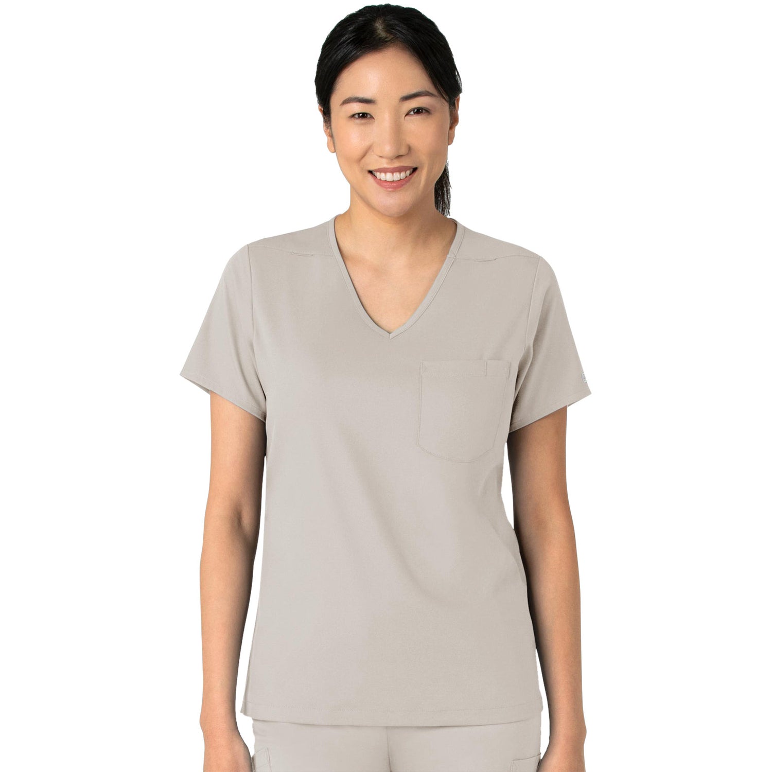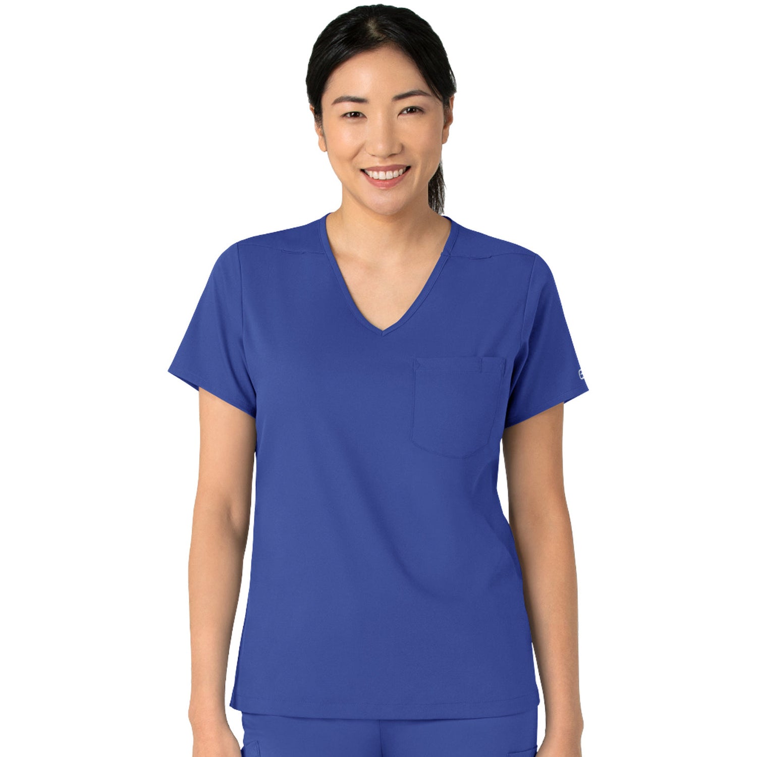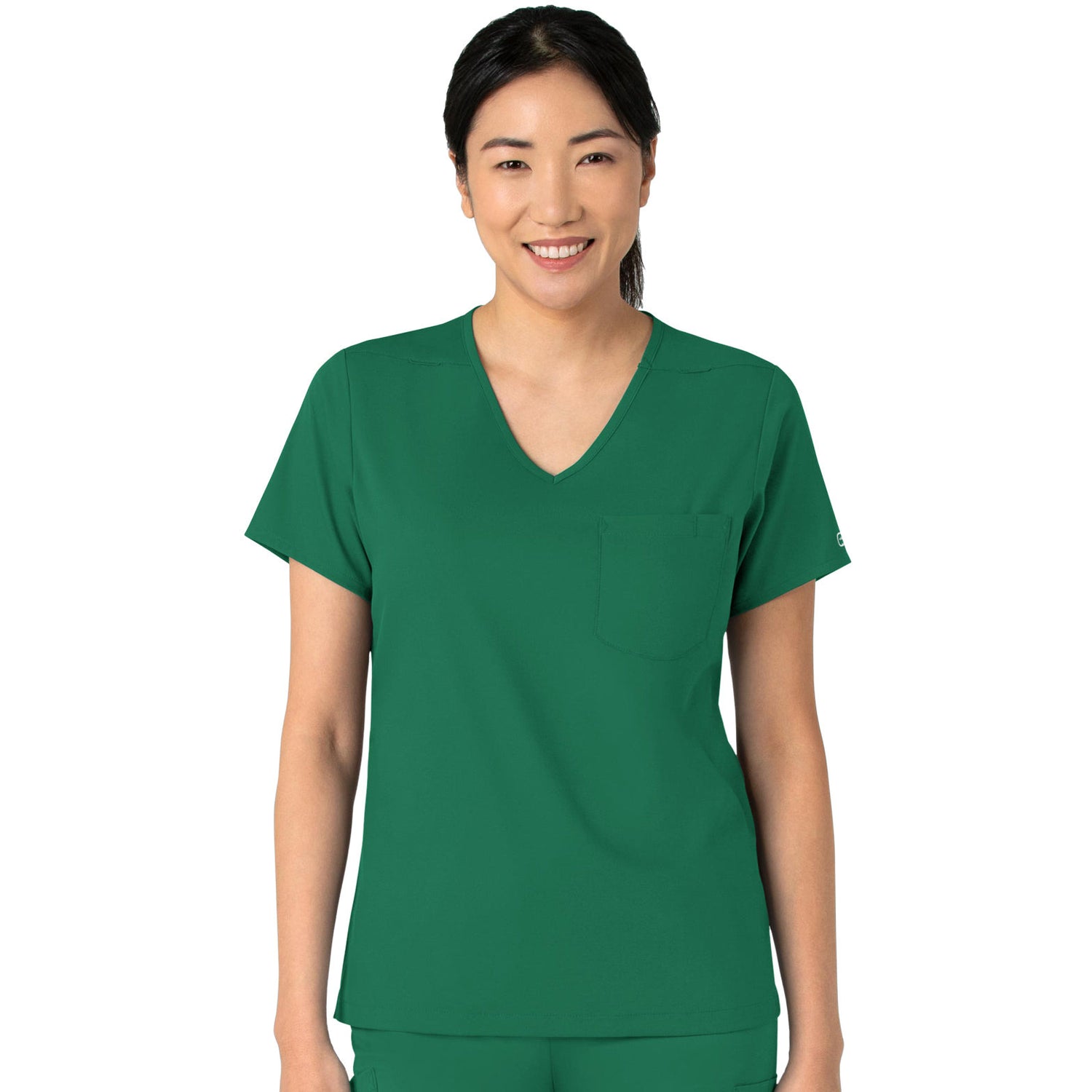 Introducing our Women's Tuck-In Scrub Top, a perfect blend of style, functionality, and sustainability. Crafted with a modern fit, this V-neck scrub top features a sleek curved neckline adorned with shoulder badges on both sides. Designed with convenience in mind, it boasts two pockets—a chest pocket with a bartack stitch for pens and a back card pocket secured with a zipper. The high-low hem and side vents ensure ease of movement throughout your busy day. Made from a comfortable and stretchy sustainable fabric, this scrub top not only feels great but also supports eco-friendly practices. Easy to care for with machine wash cold and gentle tumble dry instructions, it's a go-to choice for healthcare professionals seeking style and functionality.
