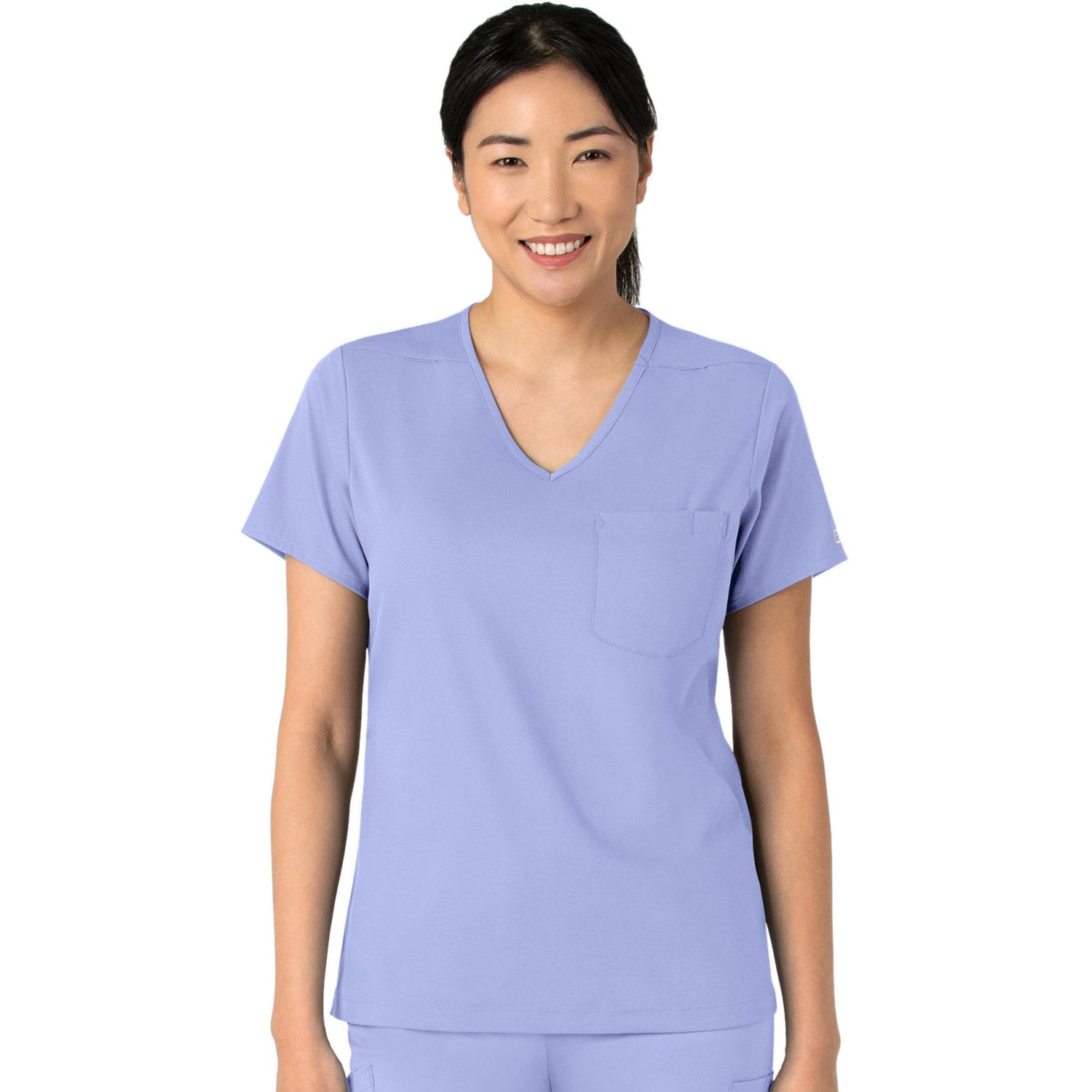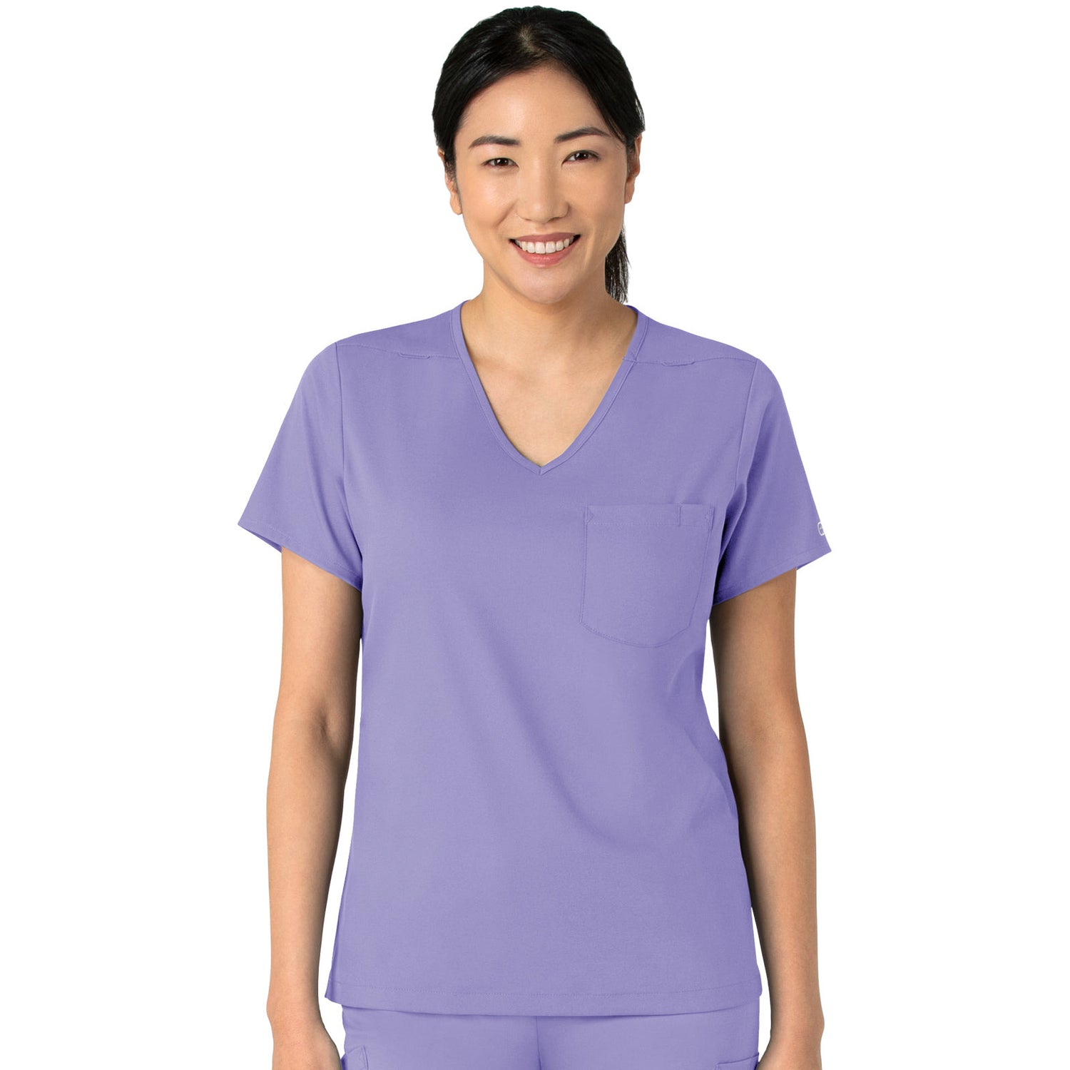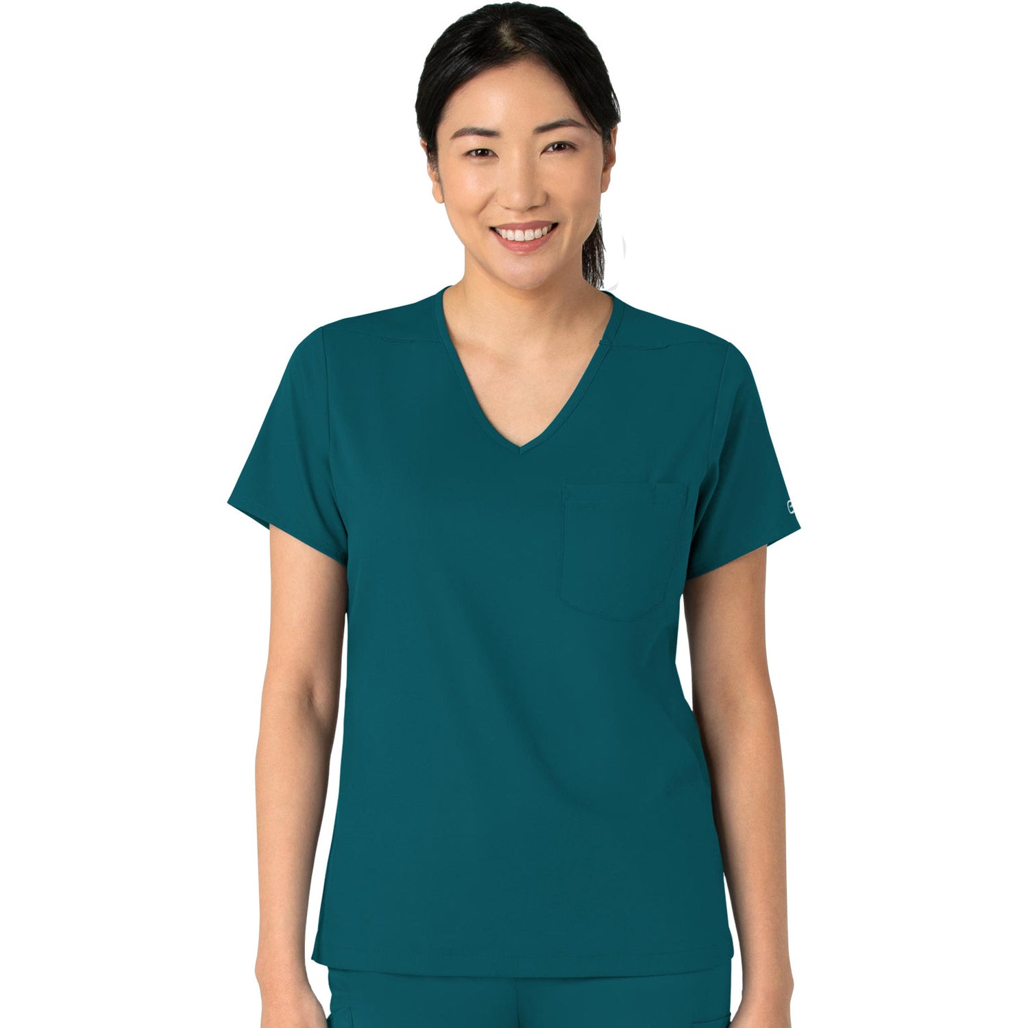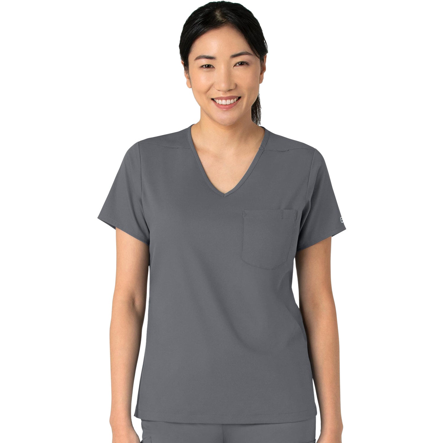 Introducing our Women's Tuck-In Scrub Top, a perfect blend of style, functionality, and sustainability. Crafted with a modern fit, this V-neck scrub top features a sleek curved neckline adorned with shoulder badges on both sides. Designed with convenience in mind, it boasts two pockets—a chest pocket with a bartack stitch for pens and a back card pocket secured with a zipper. The high-low hem and side vents ensure ease of movement throughout your busy day. Made from a comfortable and stretchy sustainable fabric, this scrub top not only feels great but also supports eco-friendly practices. Easy to care for with machine wash cold and gentle tumble dry instructions, it's a go-to choice for healthcare professionals seeking style and functionality.
