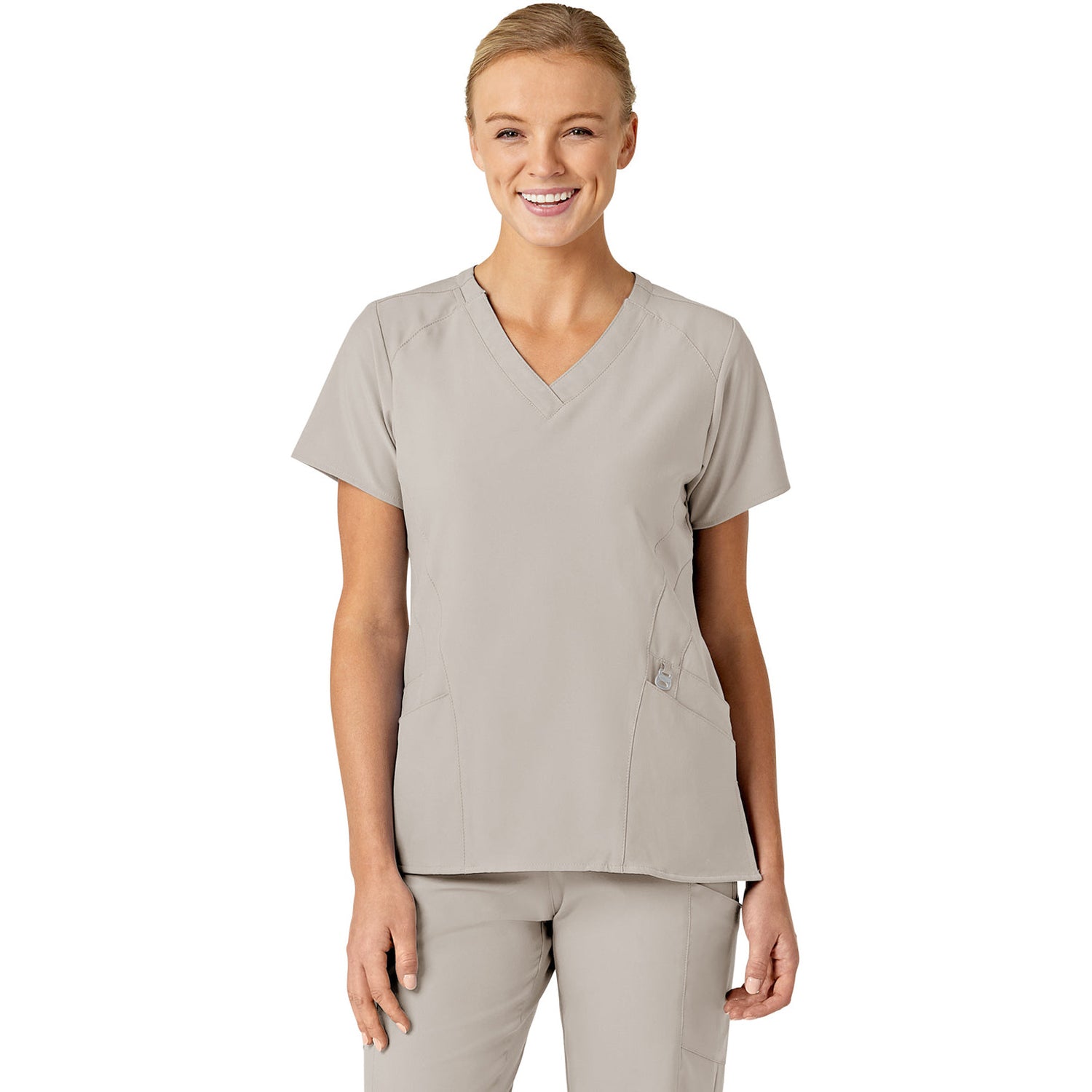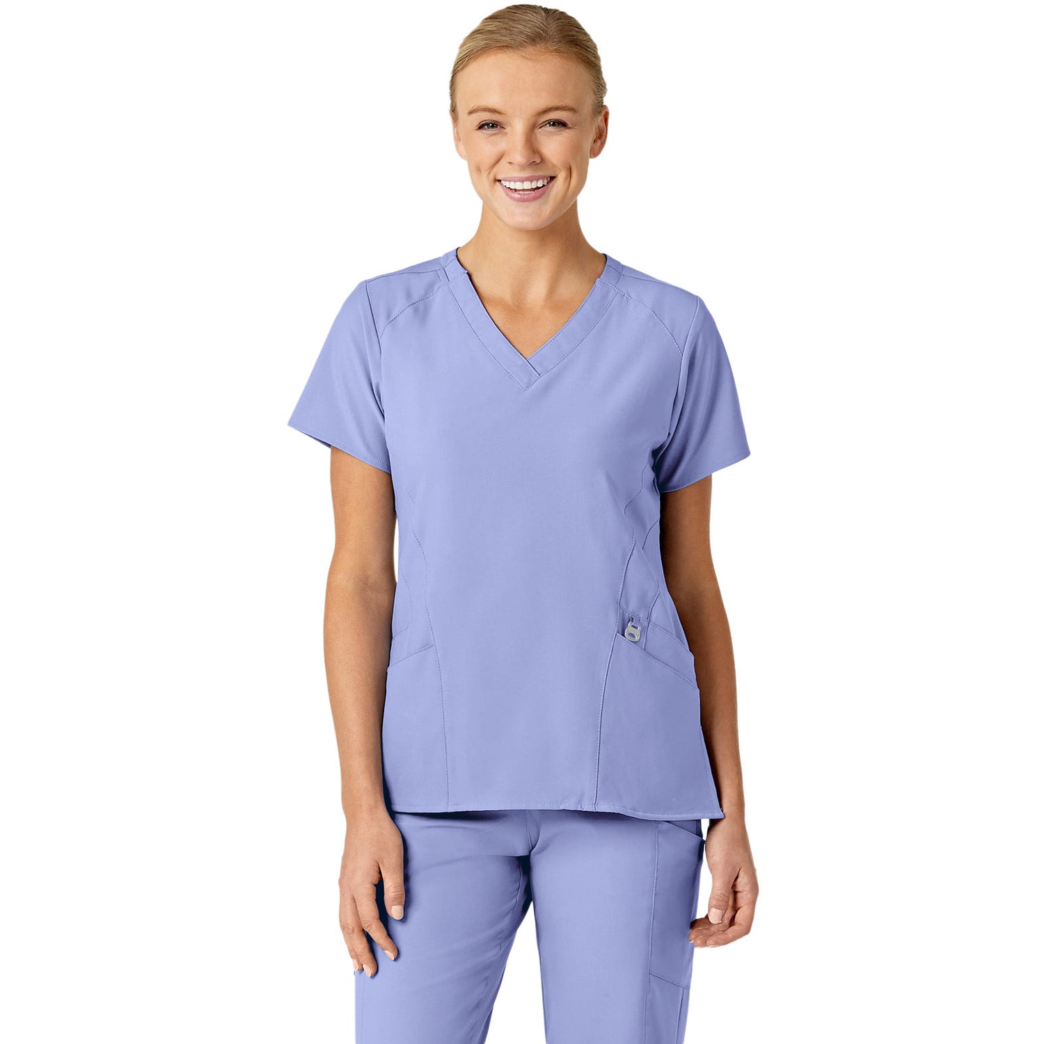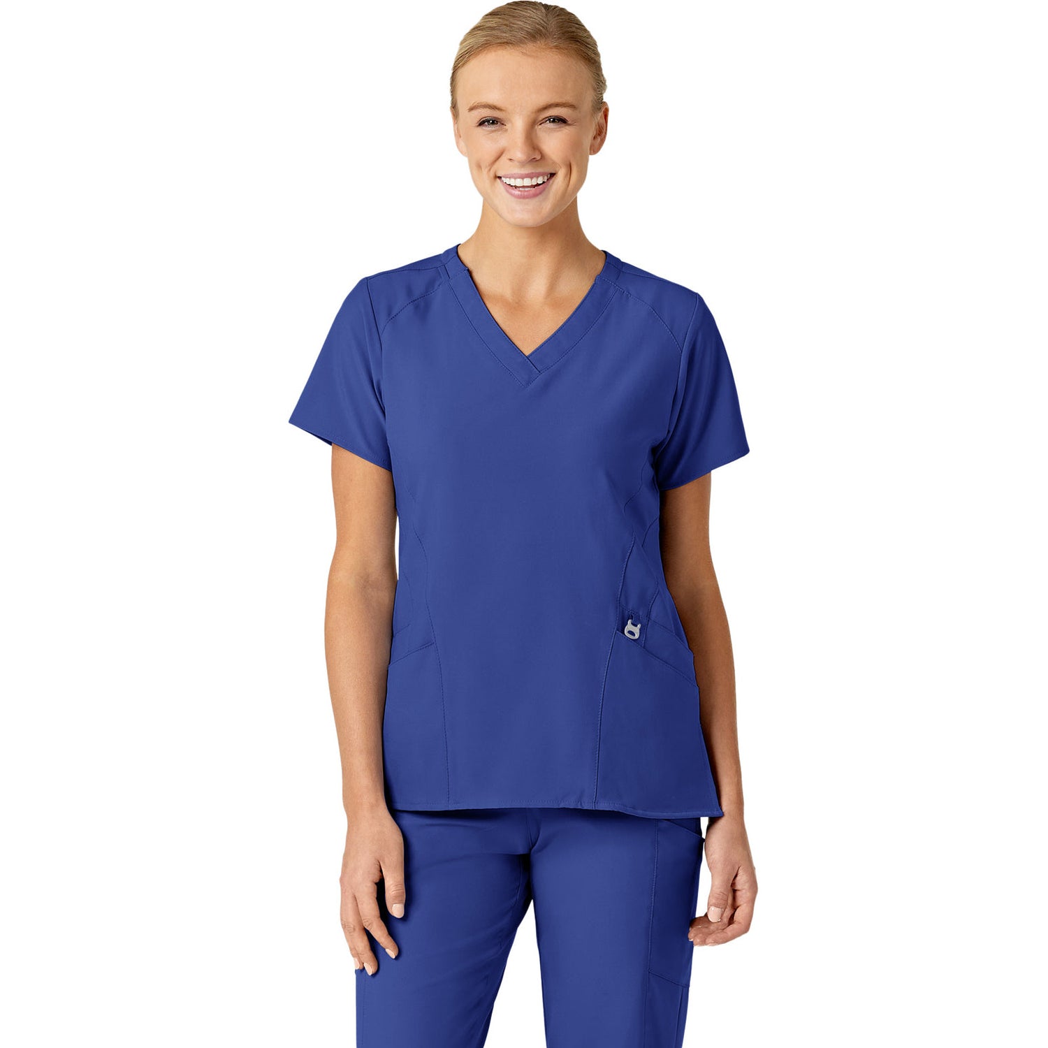 The WonderWink W123 Women's Stylized V-Neck Top features two front lower top loading double pockets, with a sectional pocket, cell phone pocket, and hidden three part utility loop! This top also features a WonderWink silicone rint, shoulder badge loop, and vented sides for added comfort. Center back length: 27 1/4"