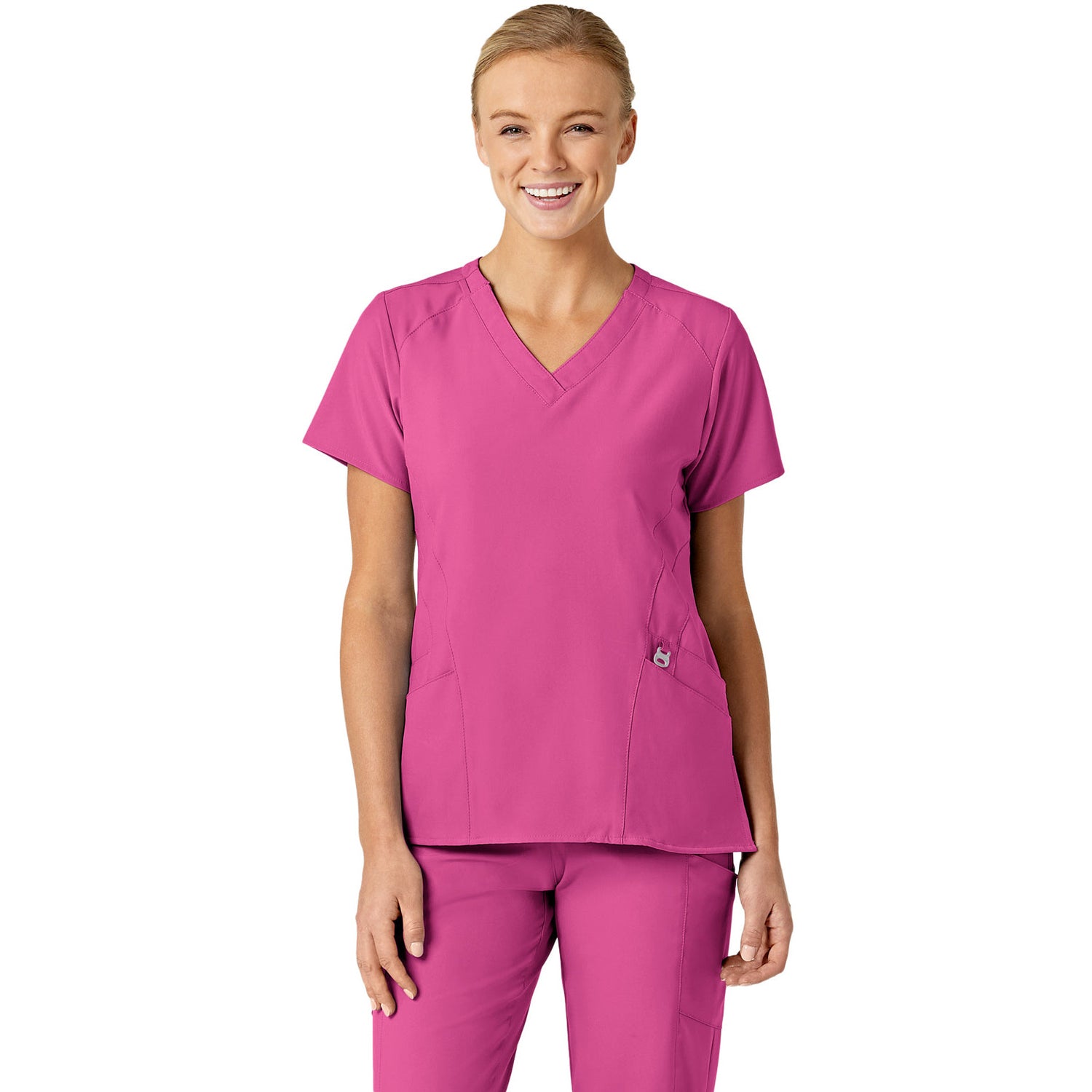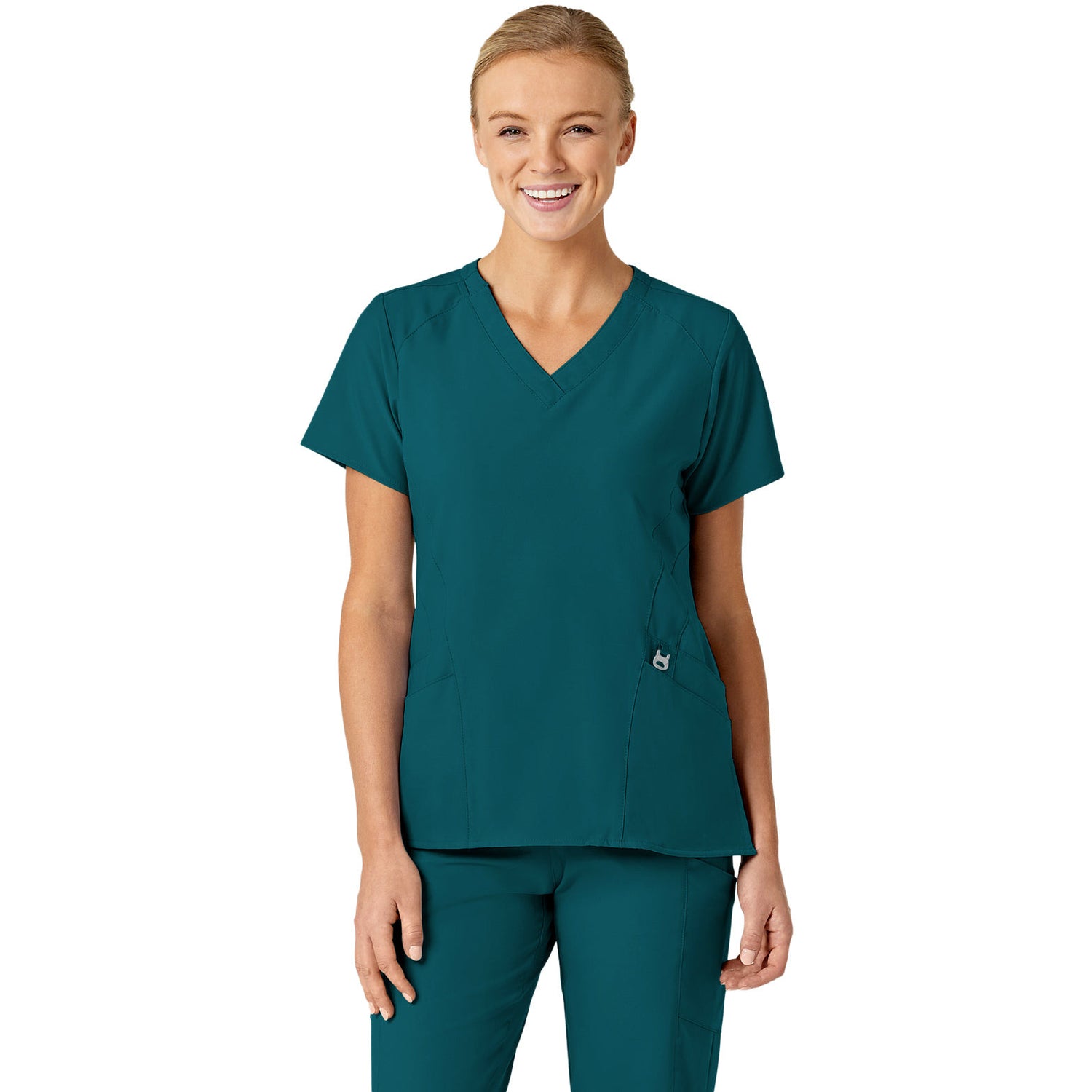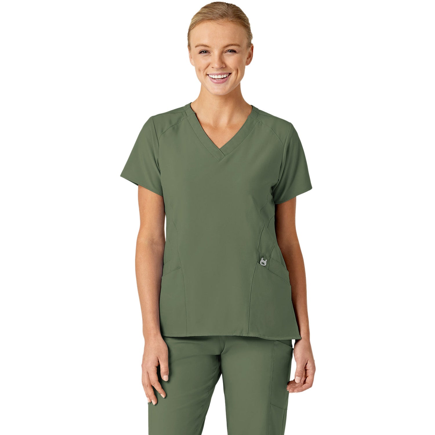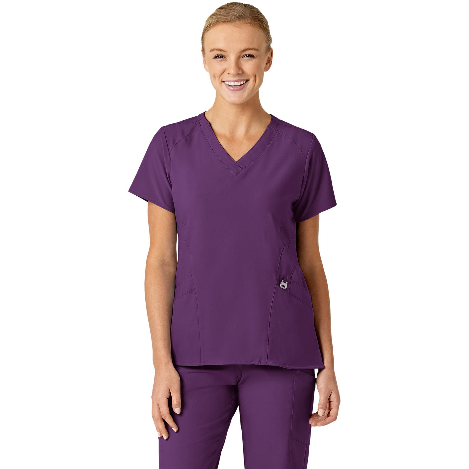 The WonderWink W123 Women's Stylized V-Neck Top features two front lower top loading double pockets, with a sectional pocket, cell phone pocket, and hidden three part utility loop! This top also features a WonderWink silicone rint, shoulder badge loop, and vented sides for added comfort. Center back length: 27 1/4"