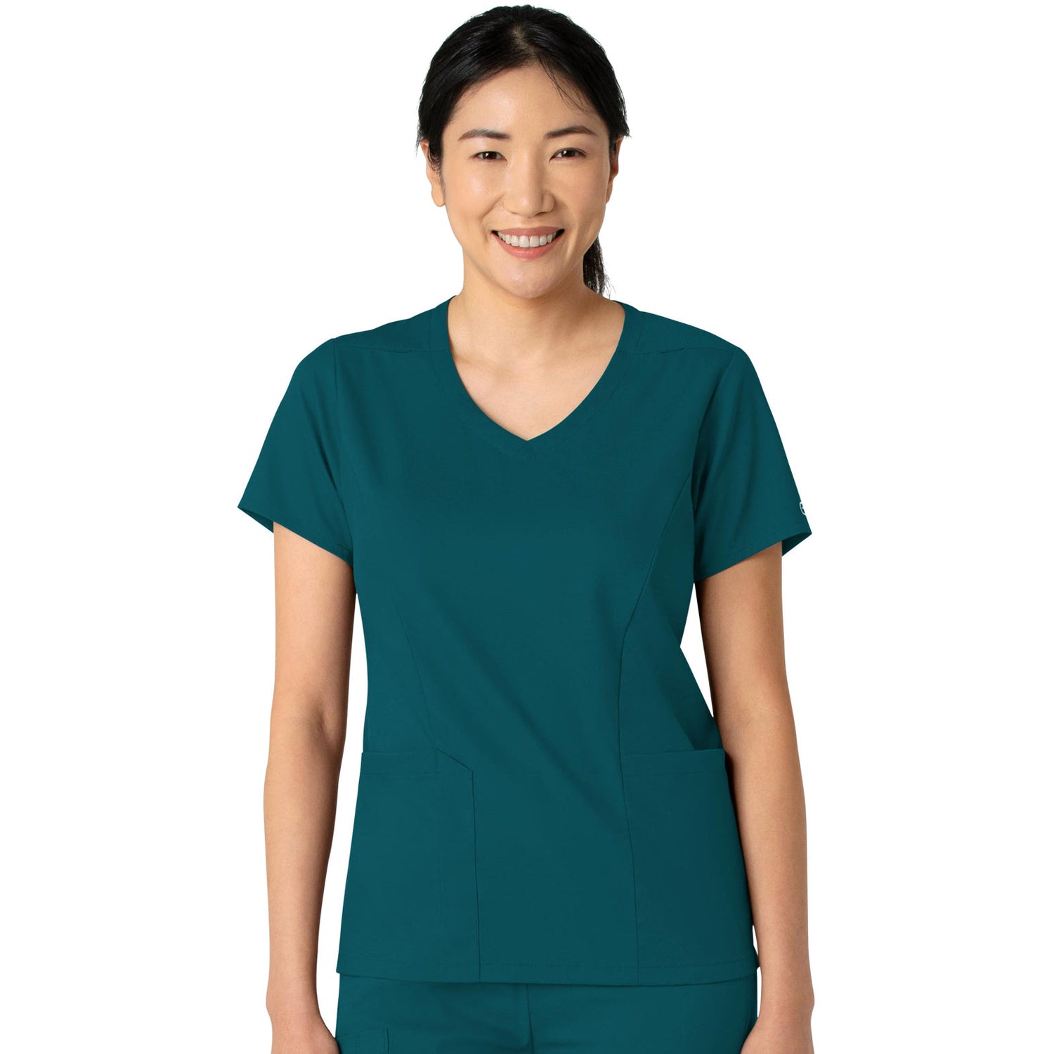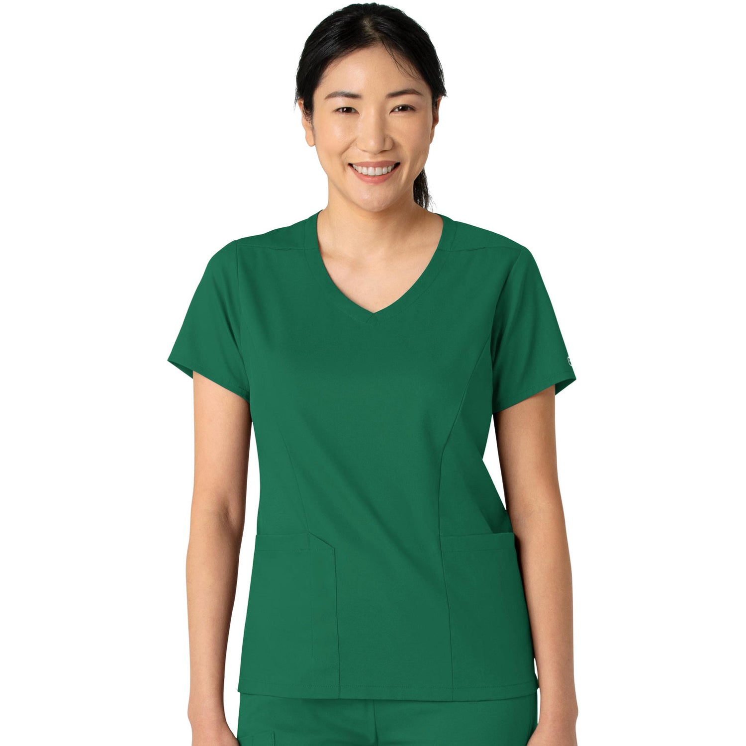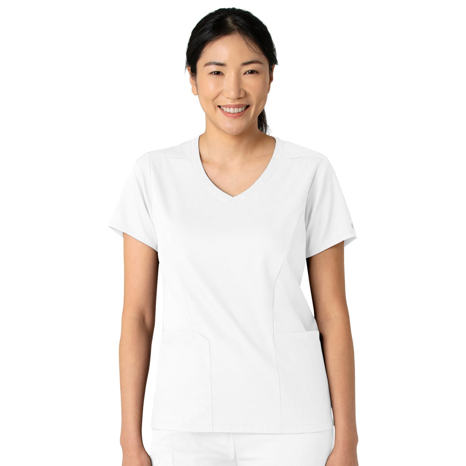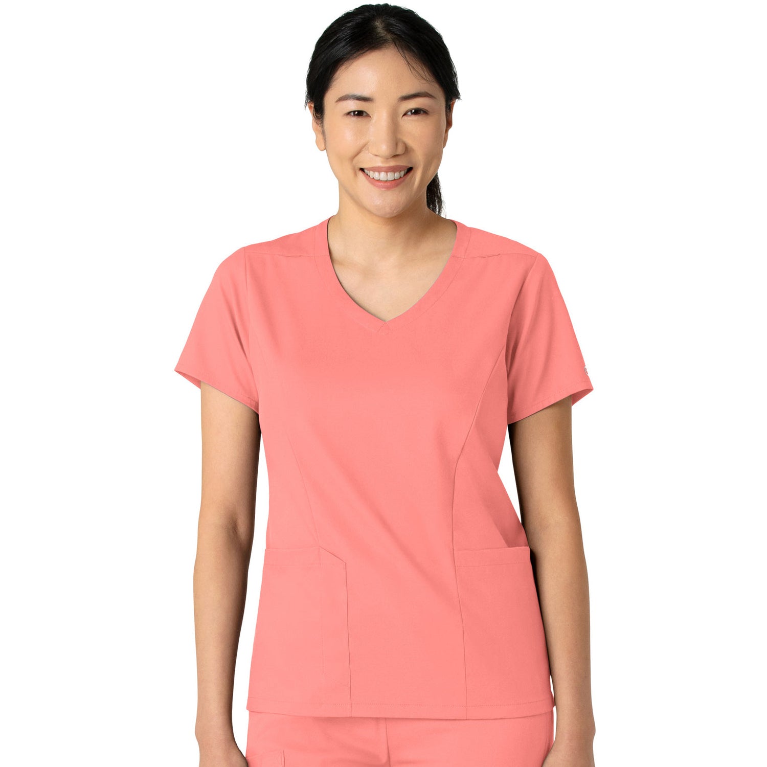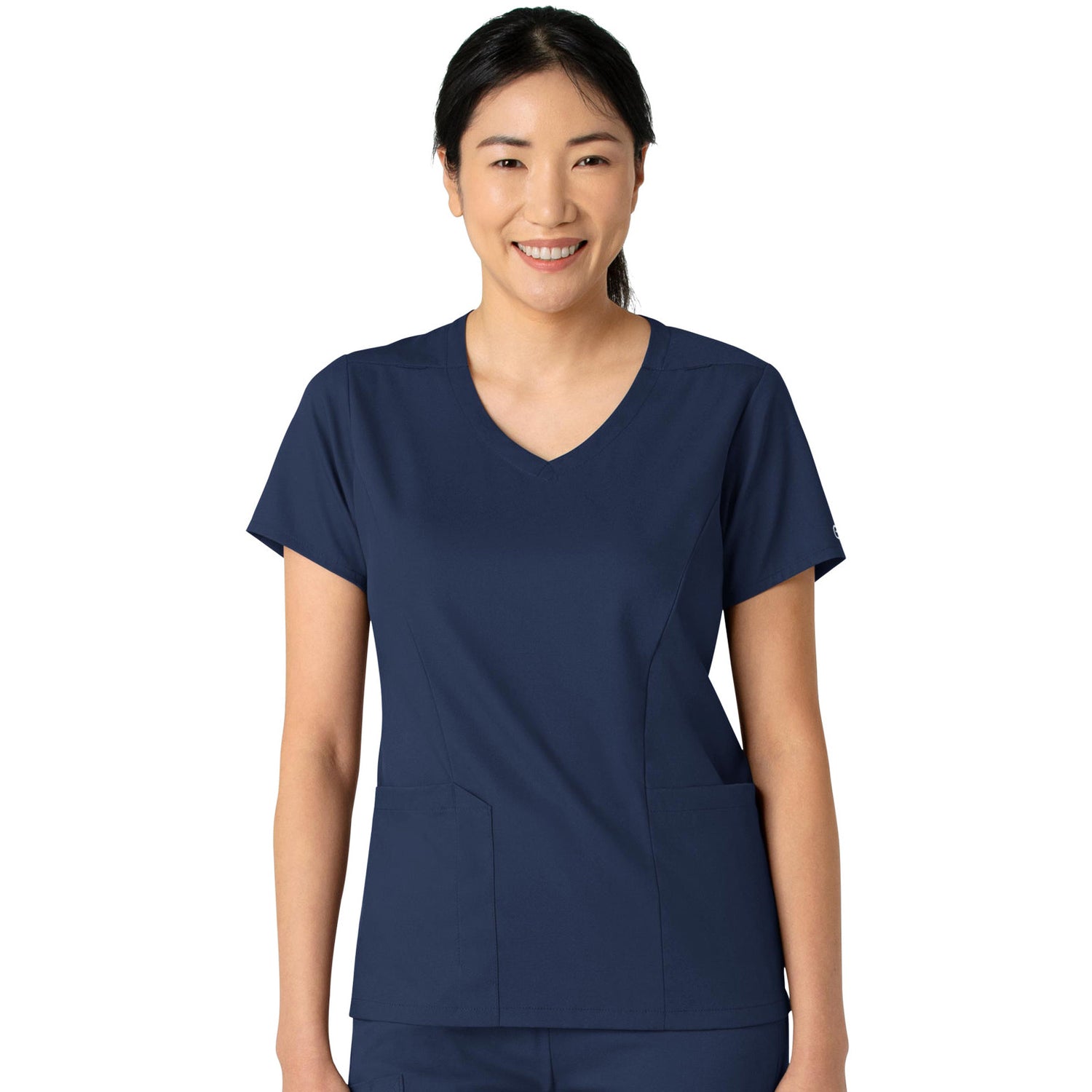 Introducing our Women's 2-Pocket V-Neck Scrub Top, the epitome of style, functionality, and sustainability. Crafted with a modern fit, this scrub top boasts a sleek V-neck design with badge loops adorning both shoulders for added utility. With three convenient pockets, including two top-loading pockets and a dedicated cellphone pocket, keeping your essentials close has never been easier. The notched pen slot on the wearer's right side ensures easy access to your writing utensils. Featuring a curved clean finished hem, this scrub top offers a polished look that's perfect for any healthcare professional. Made from a comfortable and stretchy sustainable fabric, it not only feels great but also supports eco-friendly practices. Easy to care for with machine wash cold and gentle tumble dry instructions, it's a must-have addition to your work wardrobe.