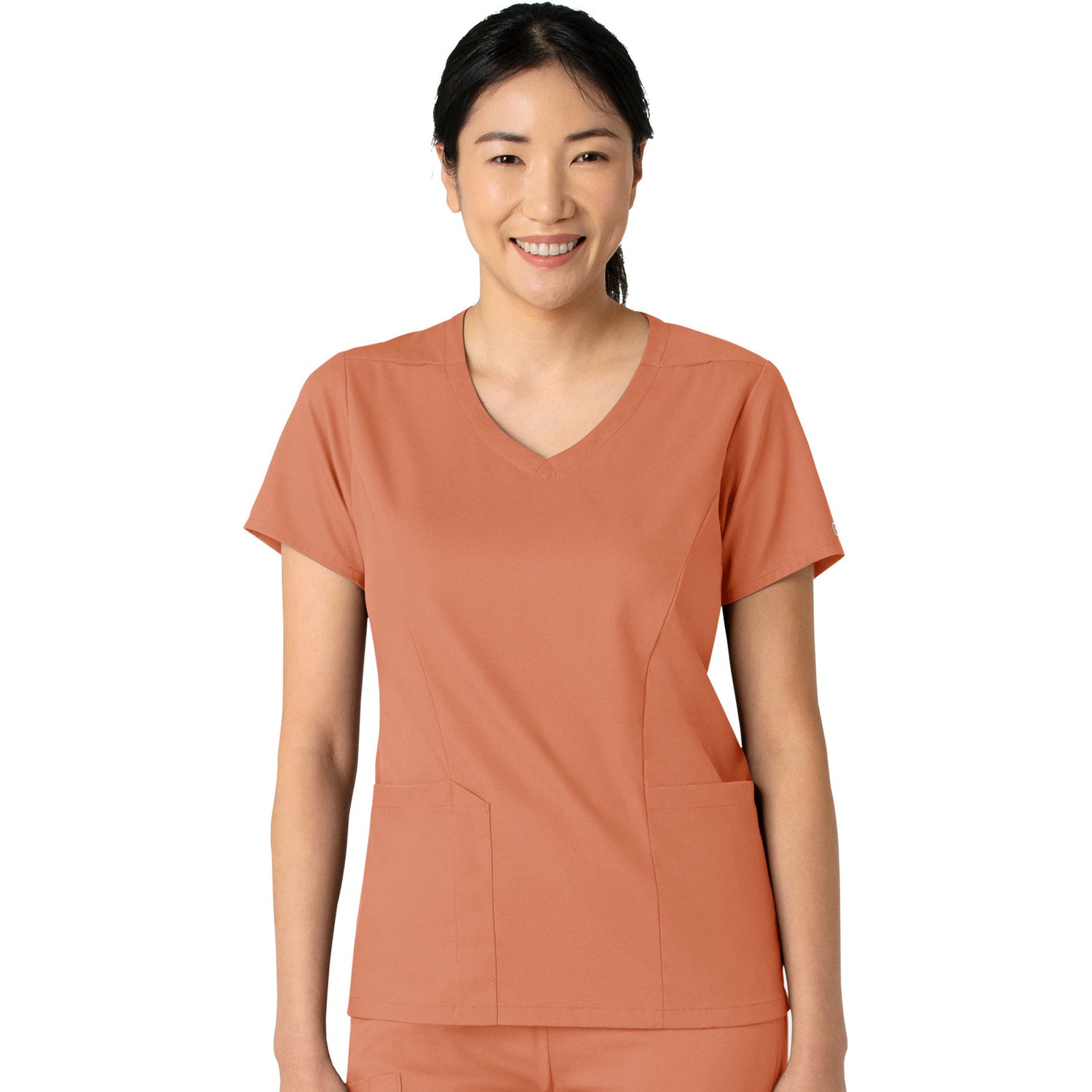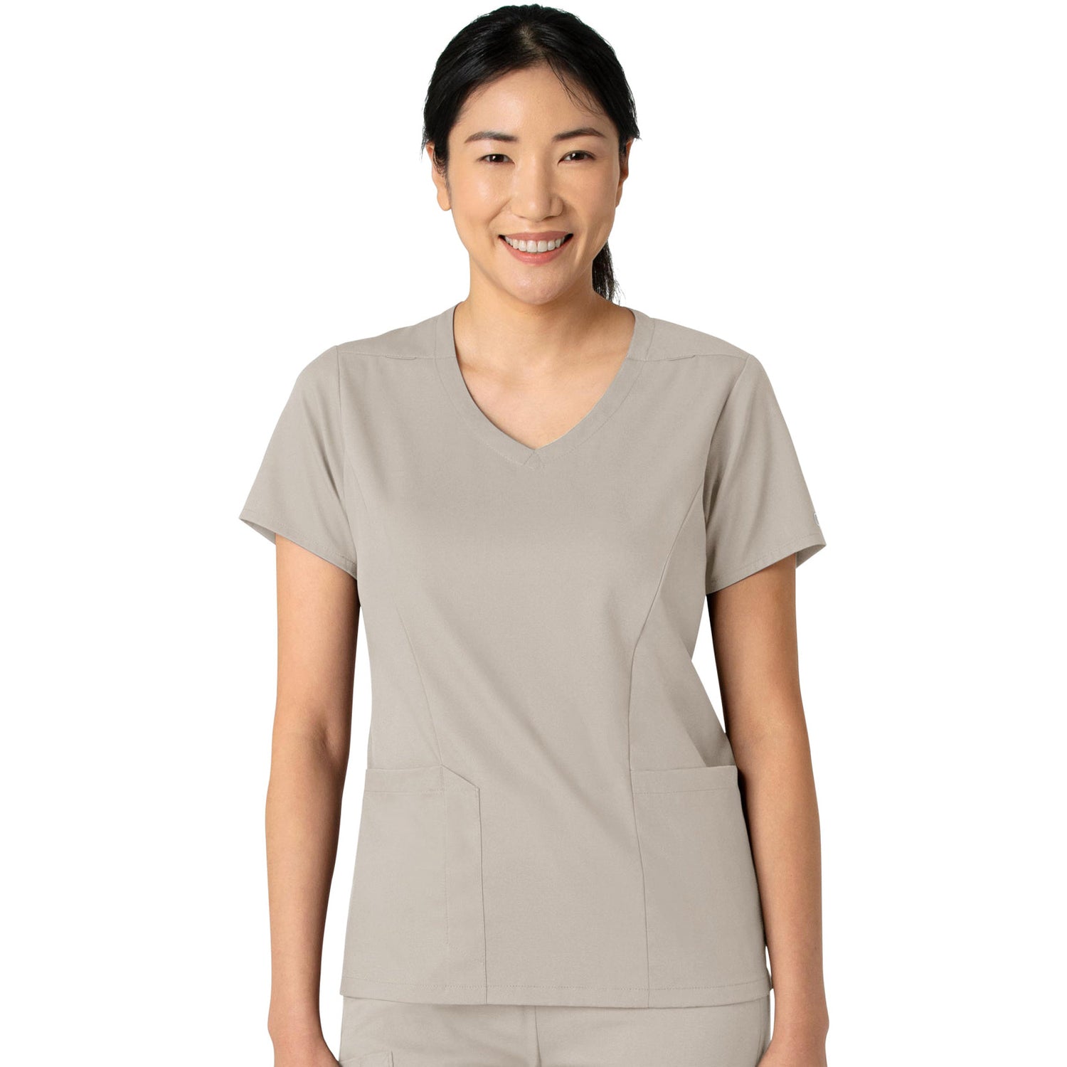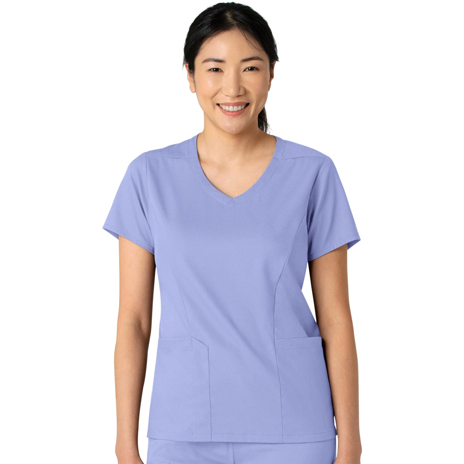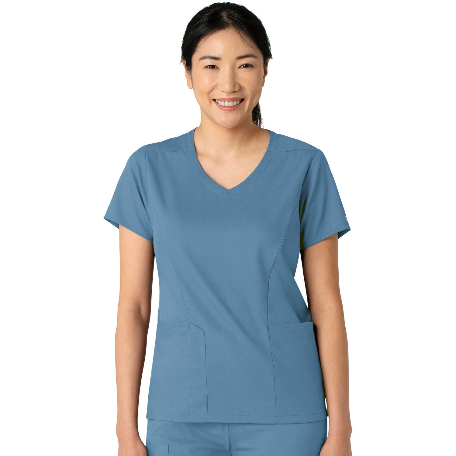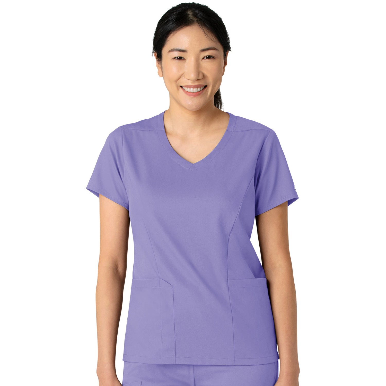 Introducing our Women's 2-Pocket V-Neck Scrub Top, the epitome of style, functionality, and sustainability. Crafted with a modern fit, this scrub top boasts a sleek V-neck design with badge loops adorning both shoulders for added utility. With three convenient pockets, including two top-loading pockets and a dedicated cellphone pocket, keeping your essentials close has never been easier. The notched pen slot on the wearer's right side ensures easy access to your writing utensils. Featuring a curved clean finished hem, this scrub top offers a polished look that's perfect for any healthcare professional. Made from a comfortable and stretchy sustainable fabric, it not only feels great but also supports eco-friendly practices. Easy to care for with machine wash cold and gentle tumble dry instructions, it's a must-have addition to your work wardrobe.