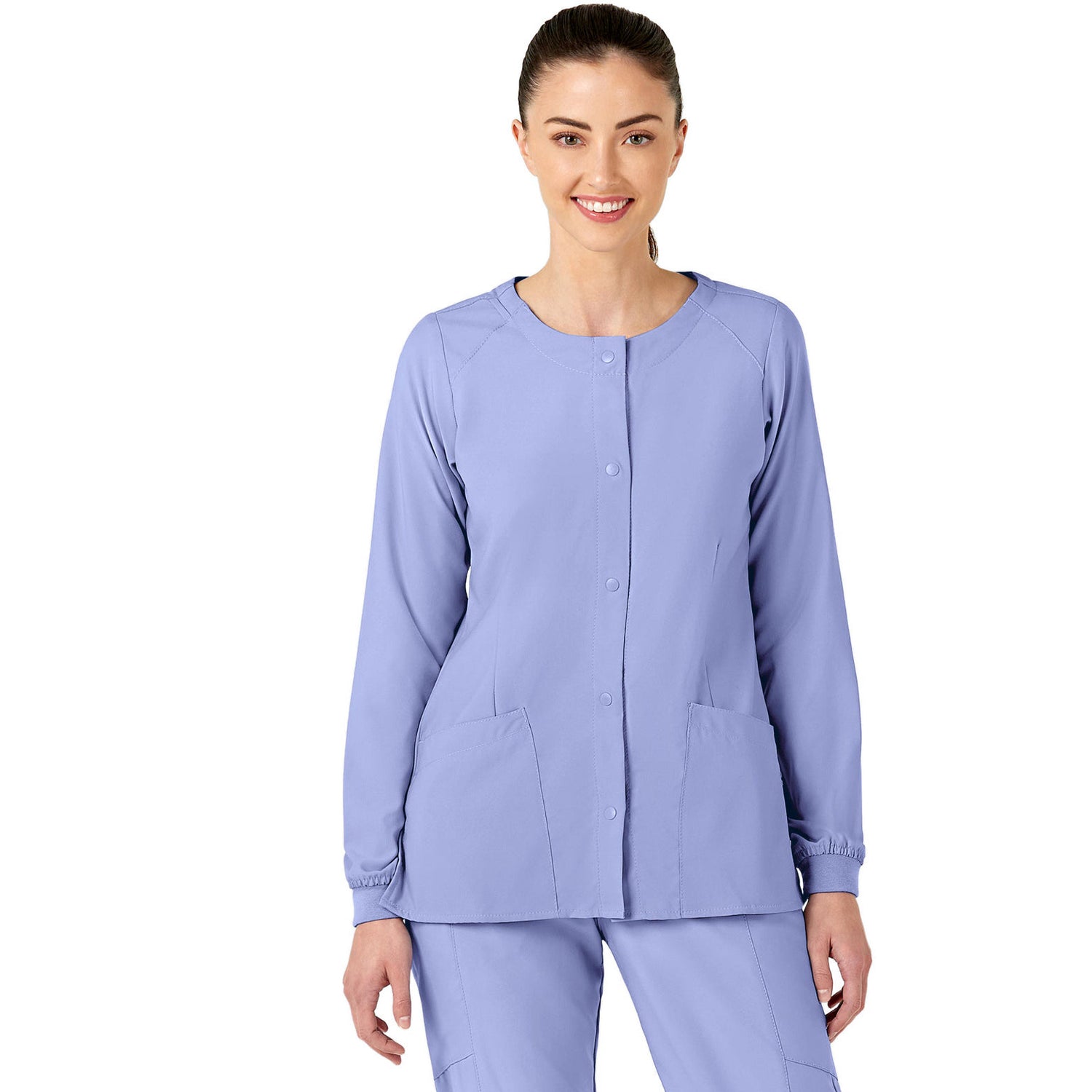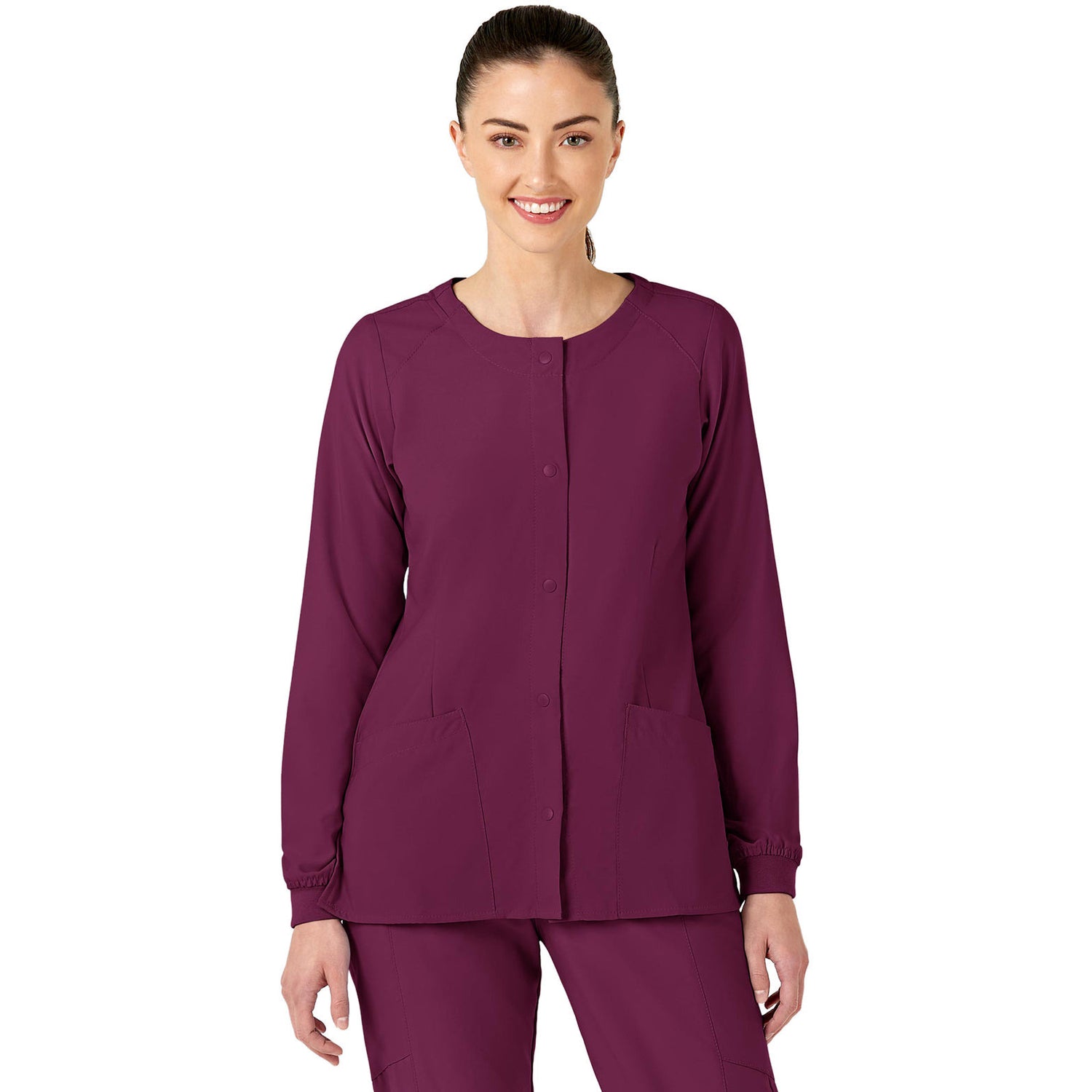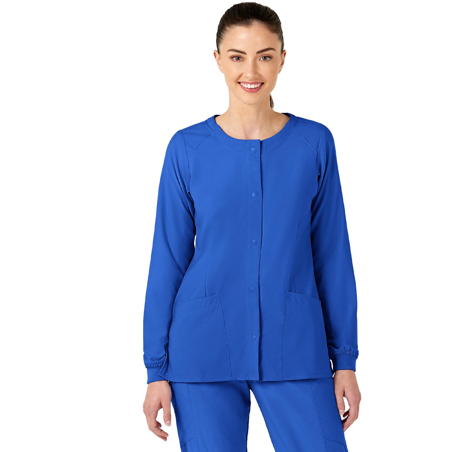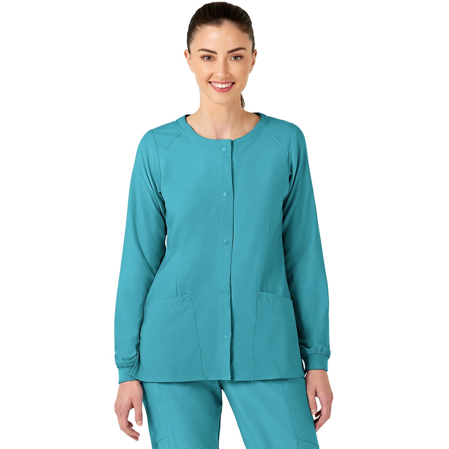 The WonderWink W123 Women's Warm Up Jacket features a crew neckline and snap button closure. Keep everything organized with two front lower top loading pockets with a hidden three part utility loop. This top also features a WonderWink silicone ring, shoulder badge loop, and vented sides. Center back length: 28 1/4"