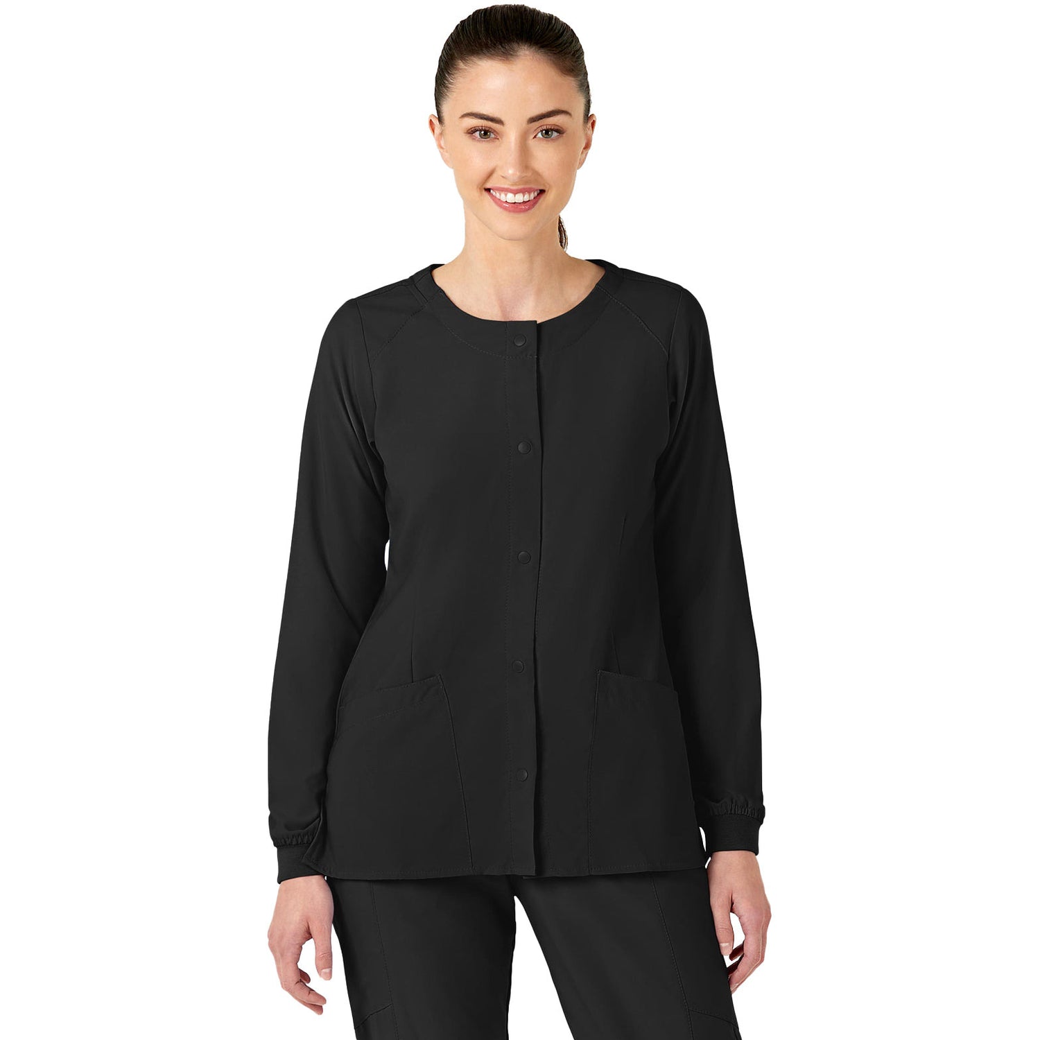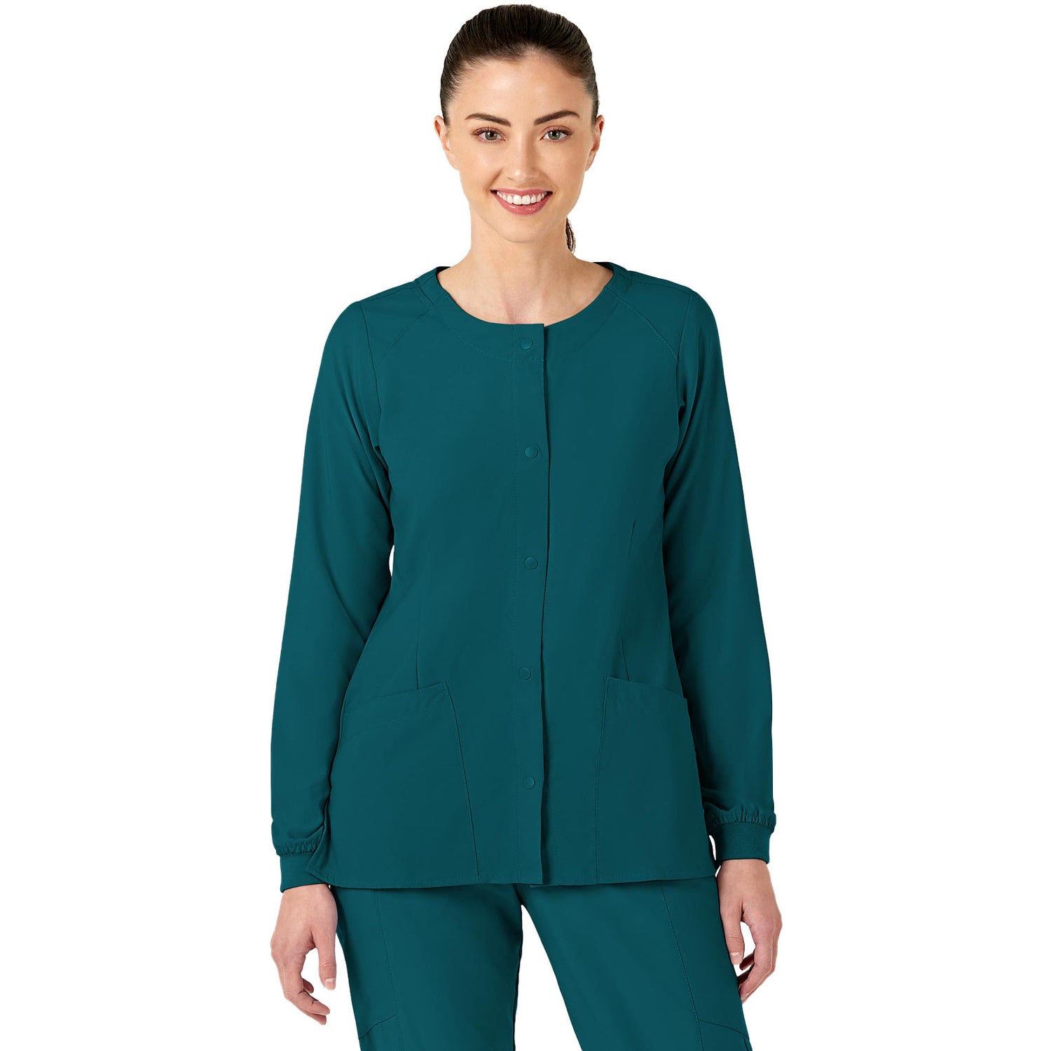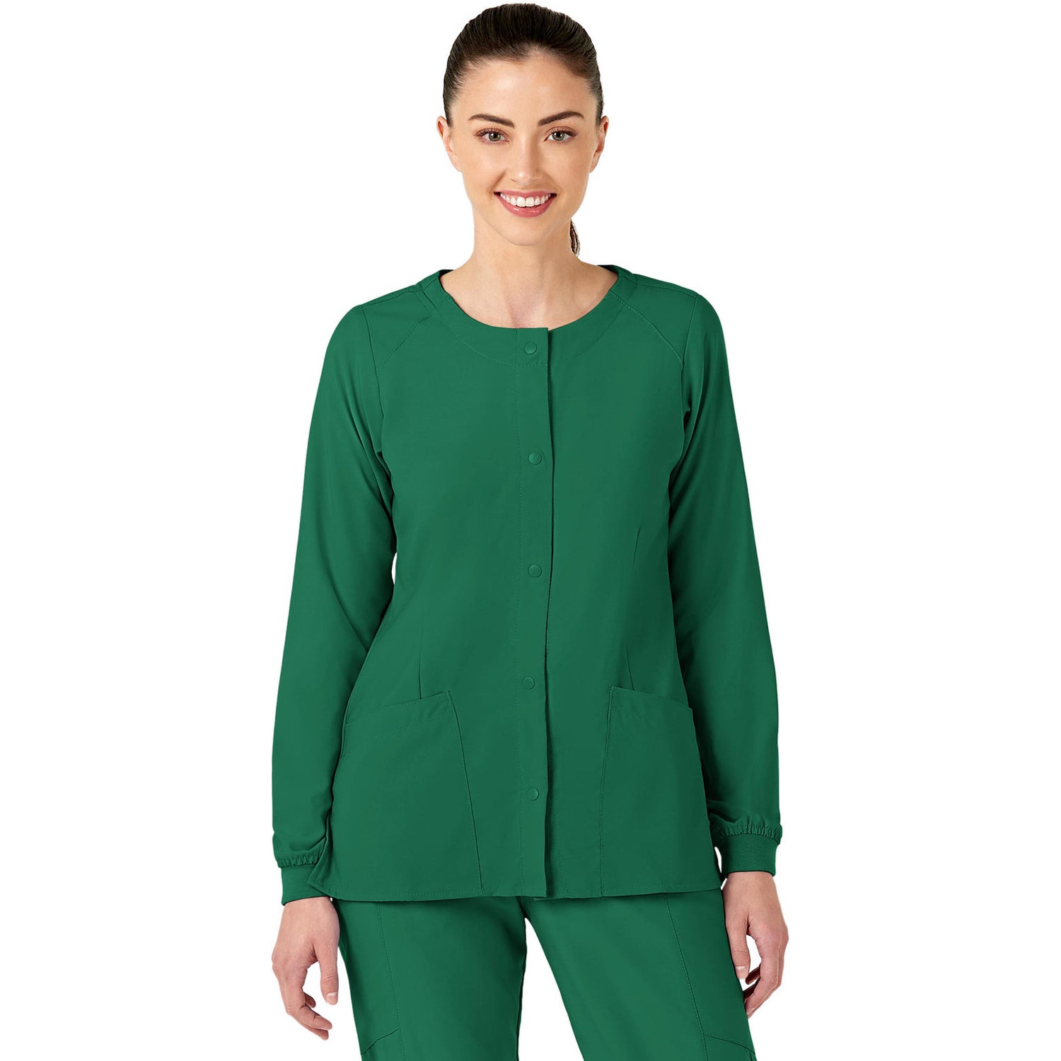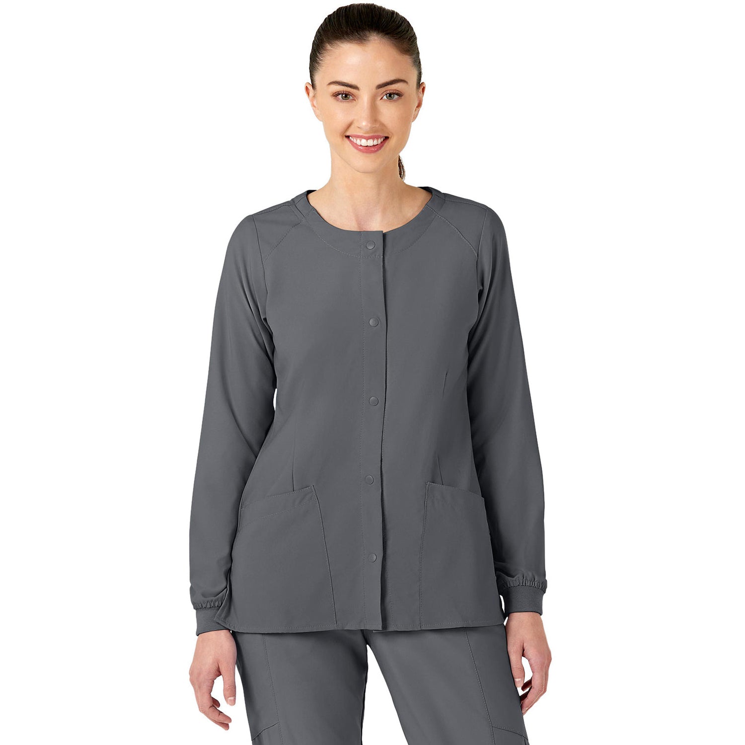 The WonderWink W123 Women's Warm Up Jacket features a crew neckline and snap button closure. Keep everything organized with two front lower top loading pockets with a hidden three part utility loop. This top also features a WonderWink silicone ring, shoulder badge loop, and vented sides. Center back length: 28 1/4"