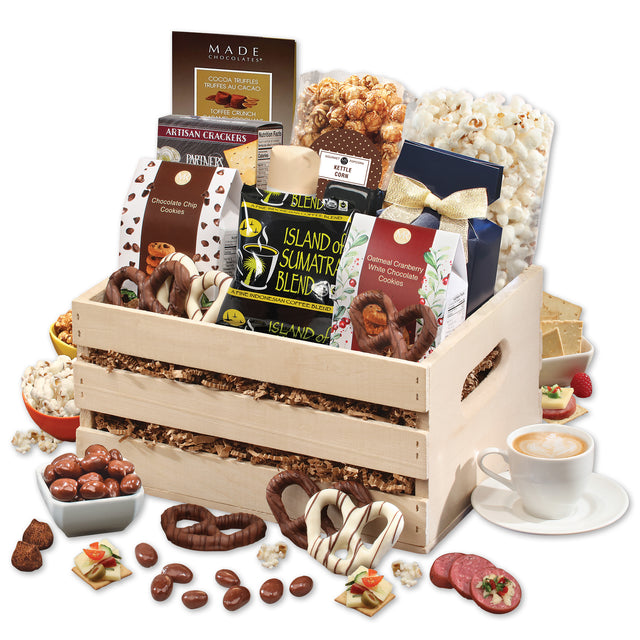 This large, reusable wooden crate is packed with a hearty assortment of gourmet treats. Show your appreciation to your valued customers and loyal employees by sending this incredible gourmet gift. The sturdy crate (Made in USA) is great for storing magazines, kitchen gadgets or children’s toys. This impressive gift is a great way to say “thank you” to your best customers and employees. We firebrand your logo on the crate’s top slat. Contents: Olive Oil & Sea Salt Crackers, 2 oz.