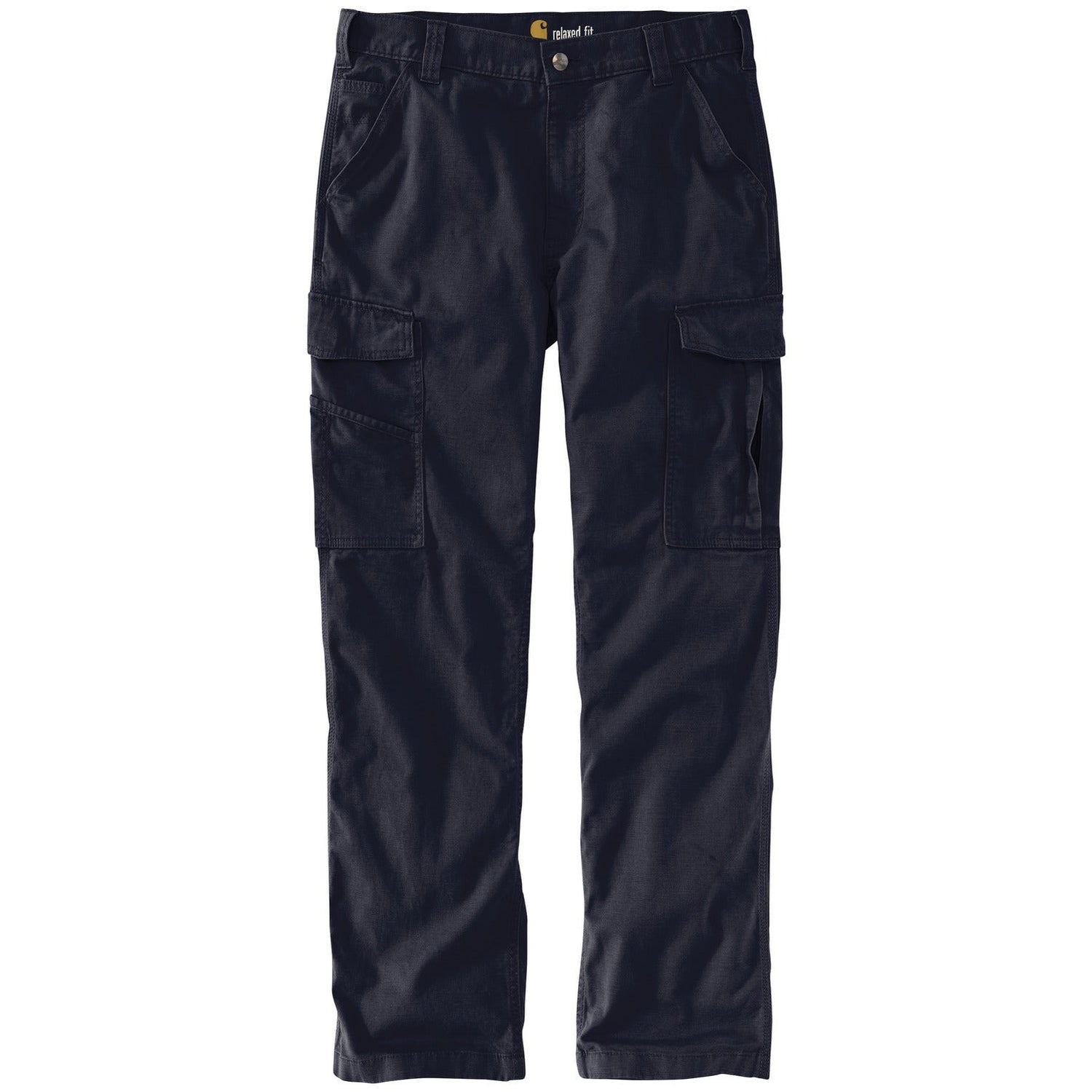 These cargo pants have enough flex that you can easily crouch down to fix a busted taillight. They move with you, not against you. 8.5-ounce, 98/2 cotton/spandex canvas Rugged Flex durable stretch technology for ease of movement Sits at the waist Comfortable fit through the seat and thigh with room to move Left-leg cargo pocket with secure cell phone storage Right-leg cargo pocket with utility pocket Stronger sewn-on-seam belt loops Heavy hauling reinforced back pockets Hidden hook and loop closures on cargo and back pocket flaps Straight leg opening fits over boots Carhartt label sewn on right rear pocket Relaxed fit