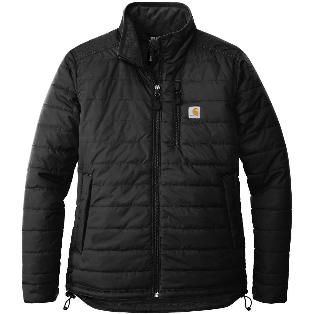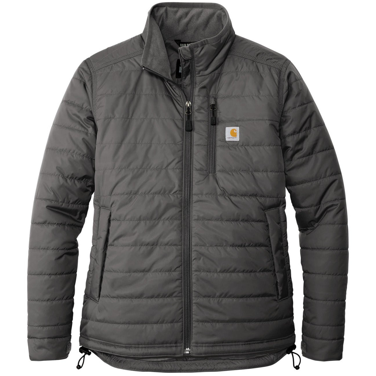 Keep working through cold, wet weather in this women's version of our popular Gilliam Jacket. 1.75-ounce, 100% nylon Cordura shell Rain Defender durable water repellent Wind Fighter technology tames wind Nylon lining quilted to 100-gram, 100% polyester insulation for warmth Reverse coil center front zipper Zip-through collar Left chest map pocket with reverse coil zipper Two hand pockets with hidden snap closures Two interior pockets: one zippered, one hook and loop closure Hook and loop adjustable cuffs Drawcord adjustable drop tail hem Carhartt-strong, triple-stitched main seams Carhartt label sewn on chest pocket Relaxed fit