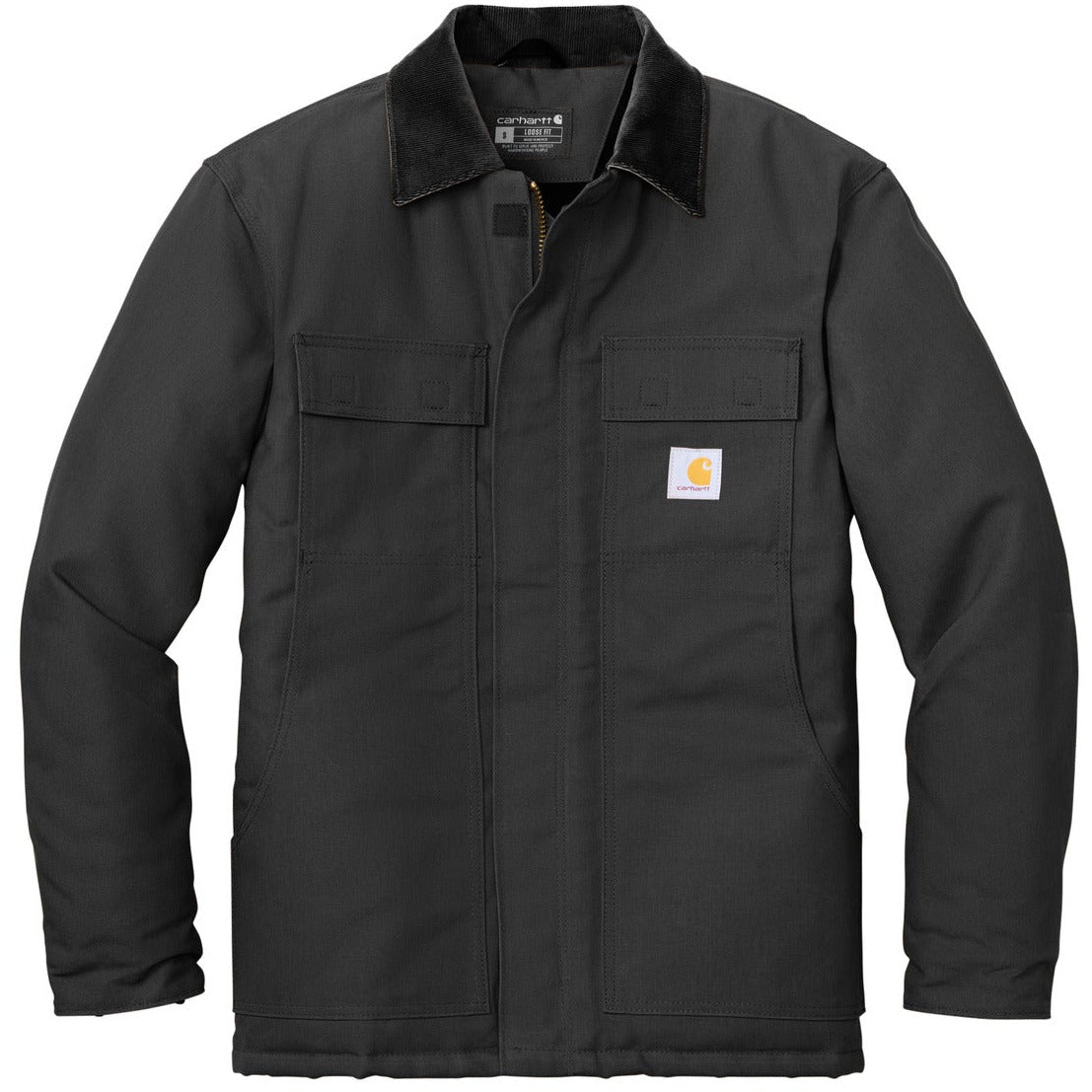 Gear up for the cold with Carhartt's Duck Traditional Coat featuring a quilted nylon lining with arctic-weight polyester insulation. 12-ounce, firm hand, 100% ring spun cotton duck canvas Wind Fighter technology tames wind Quilted nylon lining for easy on and off; arctic-weight 100% polyester insulation for ultimate warmth Corduroy-trimmed collar Two-way brass center-front zipper plus storm flap with hook and loop closure Two chest pockets with flaps and hook and loop closures Two interior pockets Two large lower-front pockets Articulated elbows Inner sleeve, rib knit storm cuffs Split-back construction Pleated bi-swing back Carhartt-strong, triple-stitched main seams Carhartt label sewn on left chest pocket Loose fit