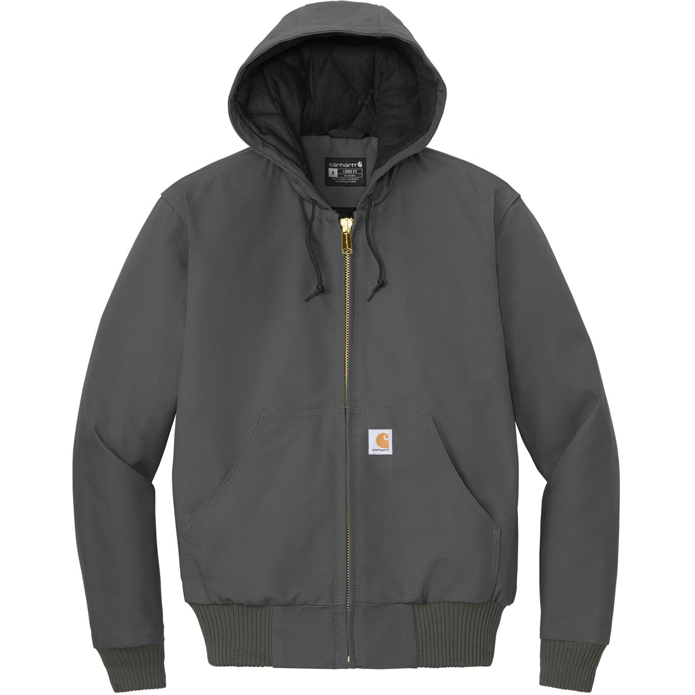 When Old Man Winter and Mother Nature get all riled up, reach for the Duck Active Jac. It can handle what this fearsome twosome dishes out. It's warm, versatile and rugged. 12-ounce, firm hand, 100% ring spun cotton duck canvas 100% polyester filling Wind Fighter technology tames wind Quilted-flannel lining in body, quilted-nylon lining in sleeves Attached quilted-flannel-lined three-piece hood with drawcord closure Full-length brass front zipper Two interior pockets: one zippered, one hook and loop Two large hand pockets Locker loop Rib knit cuffs and waistband Carhartt-strong, triple-stitched main seams Carhartt label sewn on left pocket Loose fit