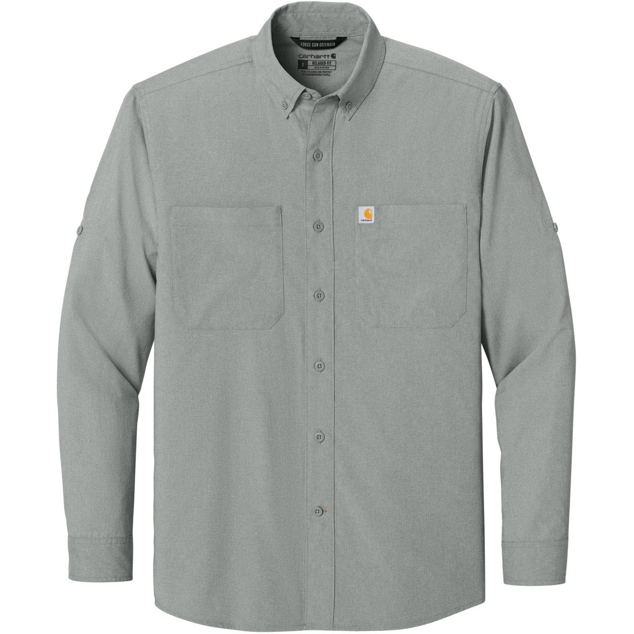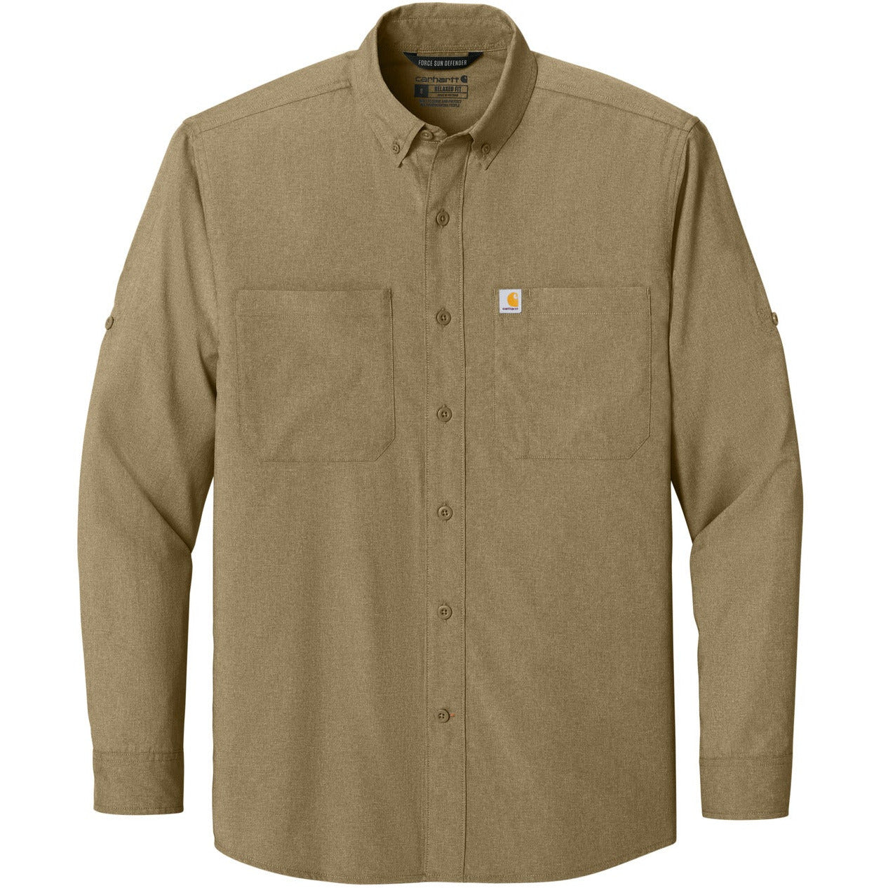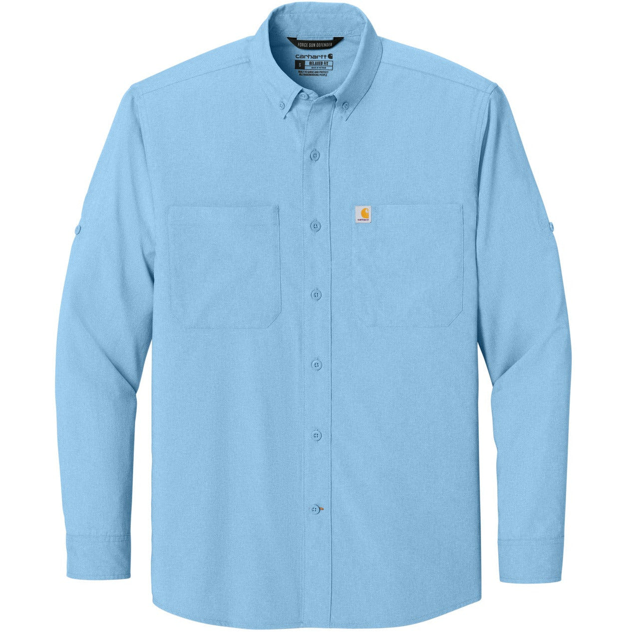 Outwork everything under the sun. Engineered with an emphasis on sweat-fighting and sun protection, this work shirt is ideal for the warmest days. 2.9-ounce, 71/29 polyester/nylon chambray Sun Defender UPF 50+ UV protection Carhartt Force works harder to fight sweat, dry fast and stop odor FastDry technology wicks away sweat to keep you cool Rugged Flex technology for ease of movement Button-down collar Mesh-lined vent at center back for flow-through ventilation Two chest pockets with a pen stall Carhartt label sewn on left chest pocket Roll sleeves with button tabs Two-button adjustable cuffs with extended plackets Relaxed fit