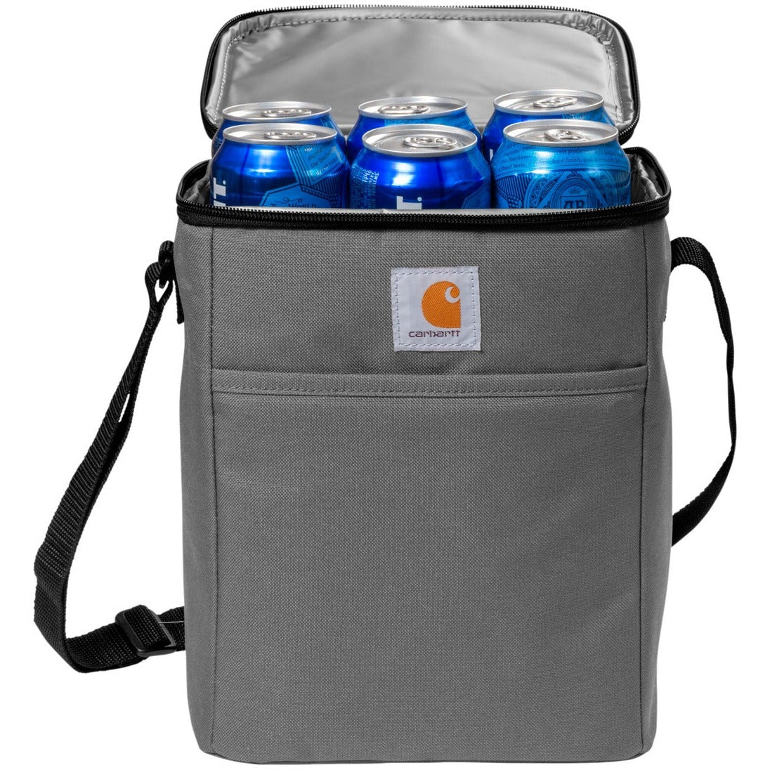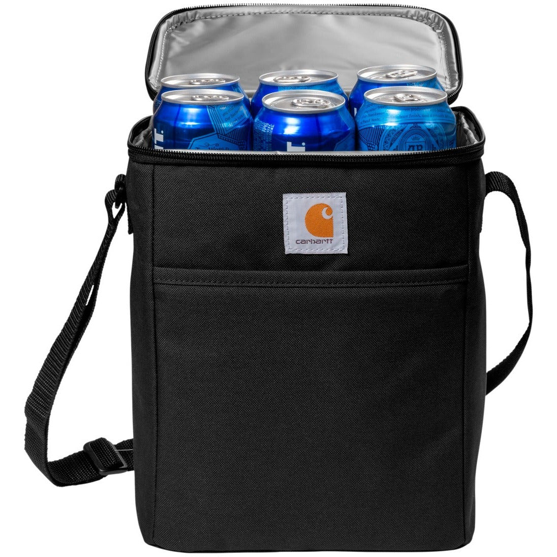 Designed with a vertical shape to fit in any worker's or student's locker, this seam-sealed cooler delivers by keeping your favorite beverages chilled and handy. 600D rugged polyester Rain Defender durable water repellent (DWR) Seam-sealed to prevent ice from leaking as it melts Fully insulated main compartment can hold up to twelve 12-ounce cans Front zippered pocket Adjustable shoulder strap Carhartt label sewn on front Capacity: 8L Dimensions: 11'h x 8'w x 5.75'l; Approx. 488 cubic inches Note: Bags not intended for use by children 12 and under.