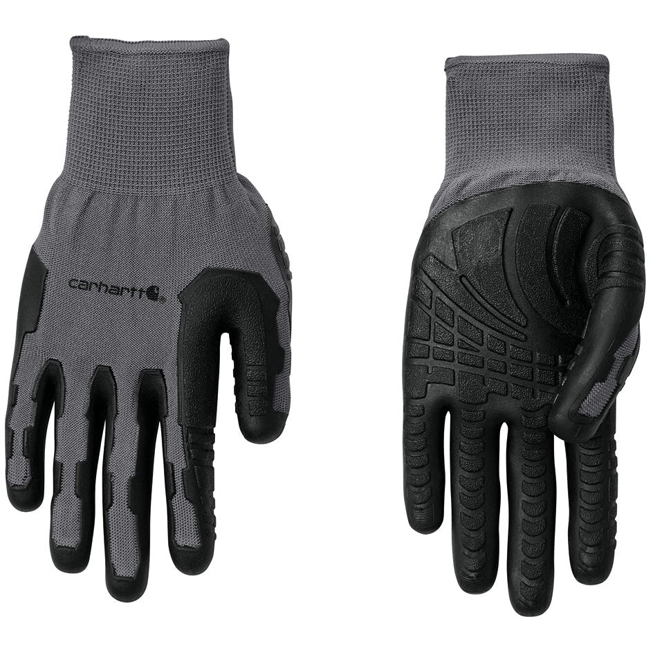 Durable gloves for dependable grip. These knit gloves have an injection-molded TPR coating on the palm for great grip, reduced vibration and added protection. 97/3 polyester/elastane C-Grip TPR-coated palm C-Grip high-dexterity coating for extreme grip Reinforced, seamless overlay from palm to fingertips for durability Knit cuffs Vibration dampening Ergonomic grip Wrap-cap coverage Carhartt heat transfer logo on top of glove Medium: 8.5-inch hand circumference Large: 9 to 9.5-inch hand circumference X-Large: 10 to 10.5-inch hand circumference