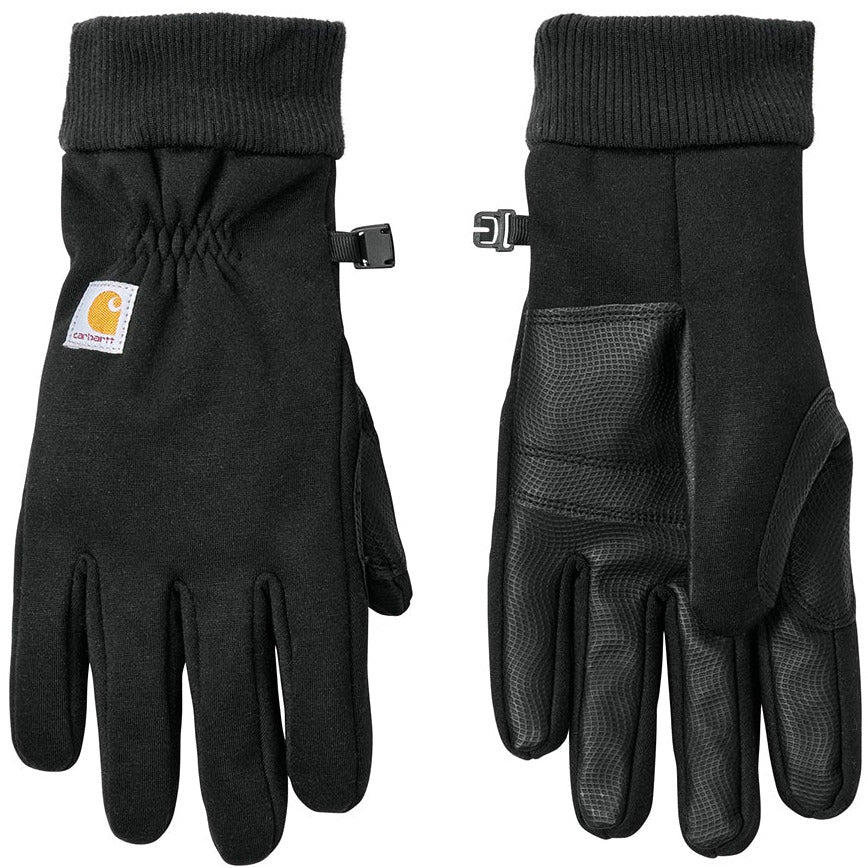 Howling winds won't keep you from getting the job done. Highly wind-resistant, these gloves help protect your hands in bad weather, while the touchscreen-compatible palm and thumb allow you to use electronics without taking them off. 100% polyester face Wind-resistant, one-sided fleece shell, synthetic palm Wind Fighter technology tames wind FastDry lining wicks sweat Touchscreen-compatible Knit cuff with wrist elastic Reinforced thumb saddle Digital grip Carhartt patch logo on top of glove Medium: 8.5-inch hand circumference Large: 9 to 9.5-inch hand circumference X-Large: 10 to 10.5-inch hand circumference