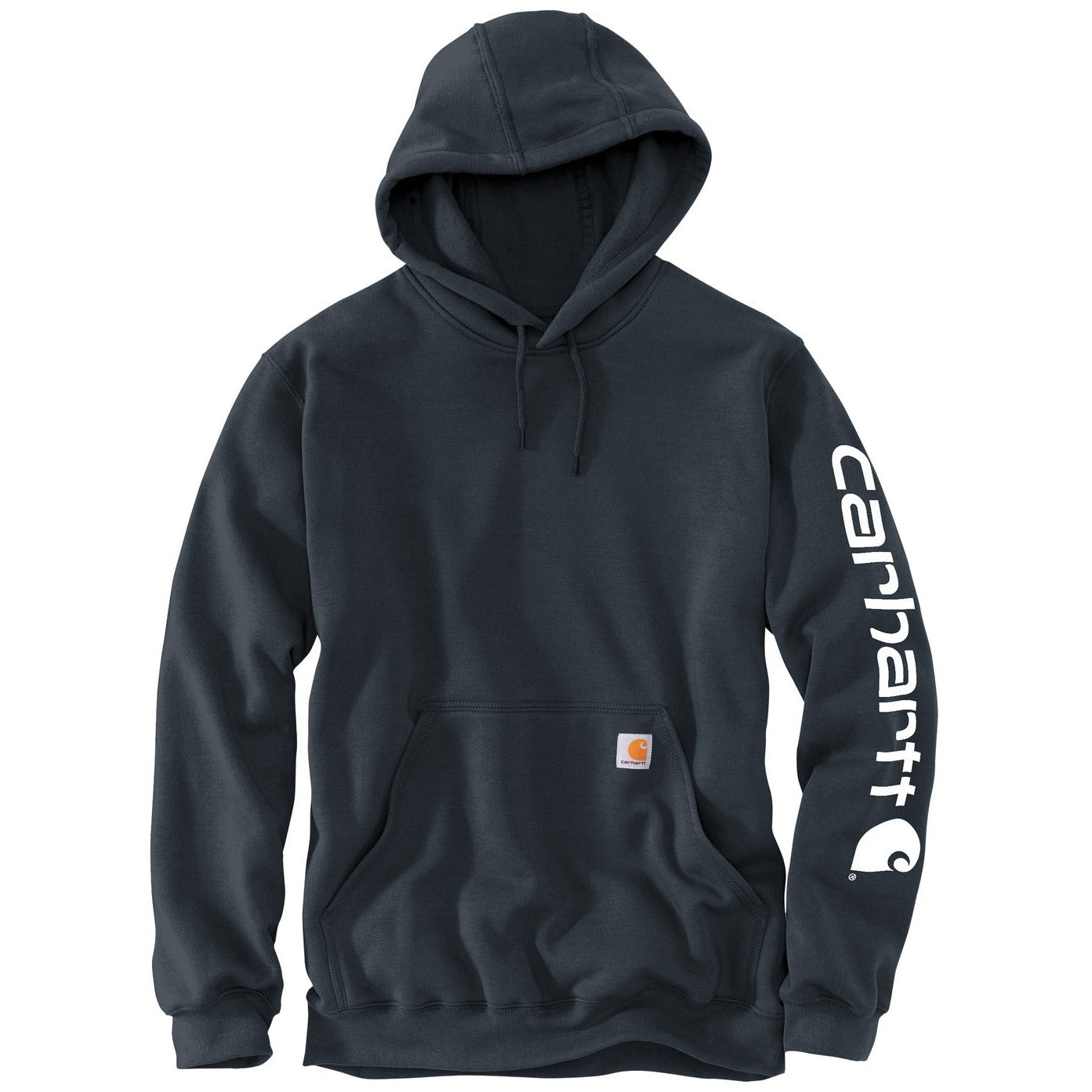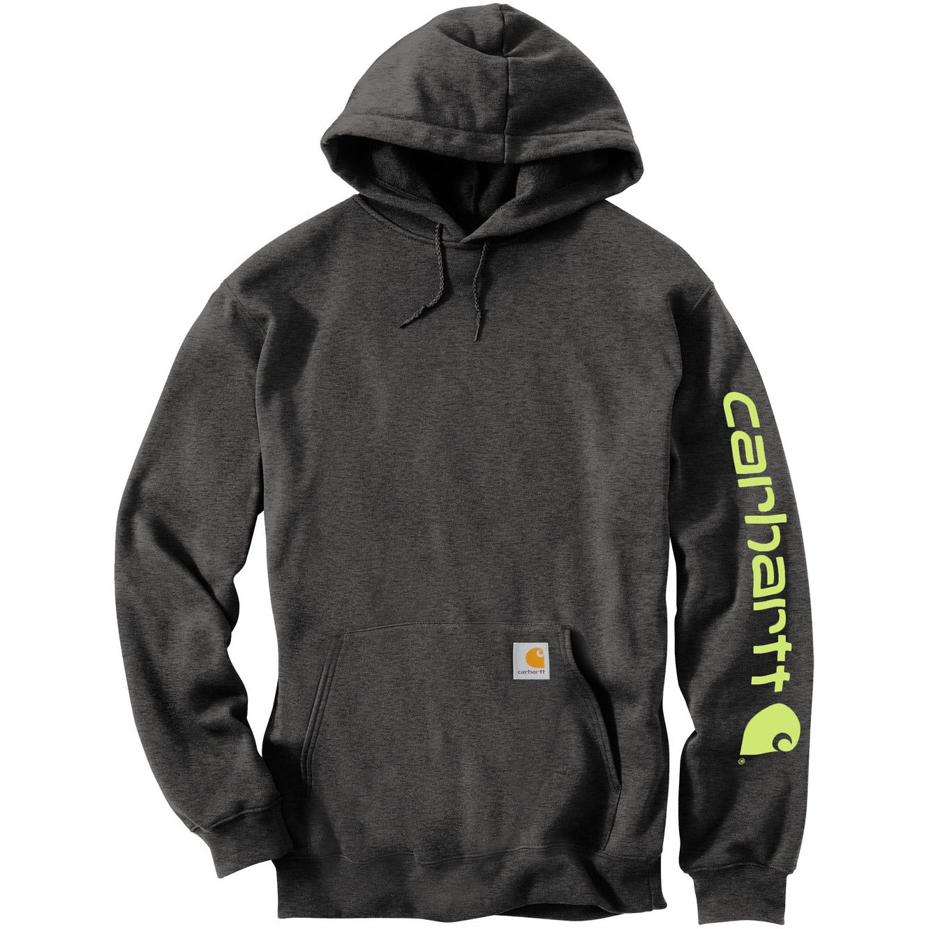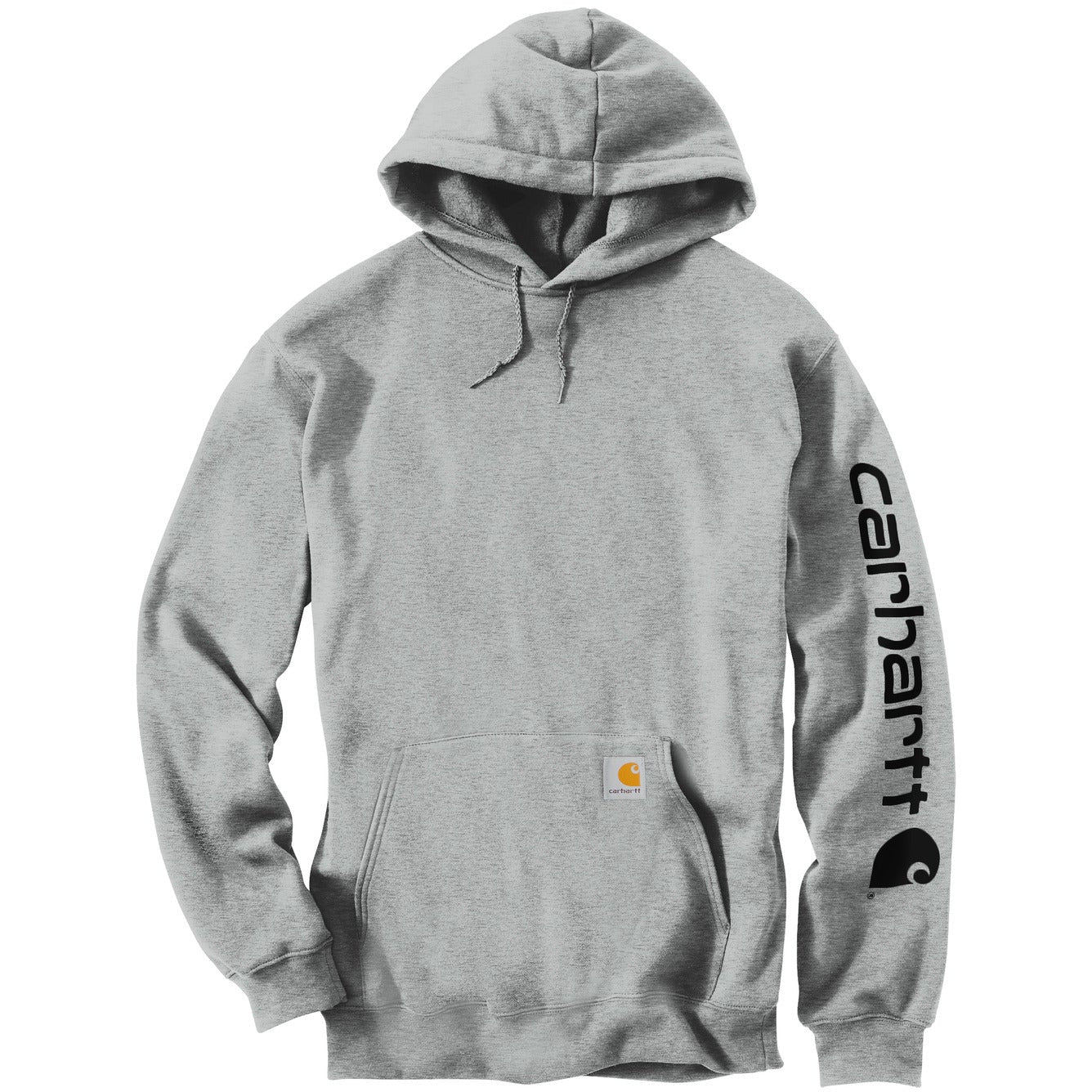 Show your Carhartt pride in this versatile, layerable sweatshirt that features a bold Carhartt signature logo down the left sleeve. 10.5-ounce, 50/50 cotton/poly blend or 59/41 cotton/poly blend (Black, Carbon Heather, Carhartt Brown, New Navy)* 70/30 cotton/poly blend (Heather Grey) Attached three-piece hood with drawcord closure Carhartt signature logo down left sleeve Front hand warmer pocket Stretchable, spandex-reinforced, rib knit cuffs and waistband Carhartt-strong, triple-stitched main seams for added durability Carhartt patch sewn on handwarmer pocket Loose fit *Please note: Select colors in Carhartt fleece are currently transitioning from a 50/50 cotton/poly blend to a 59/41 cotton/poly blend. Weight and fabric properties remain the same. Your order may contain a combination of both fabrics.