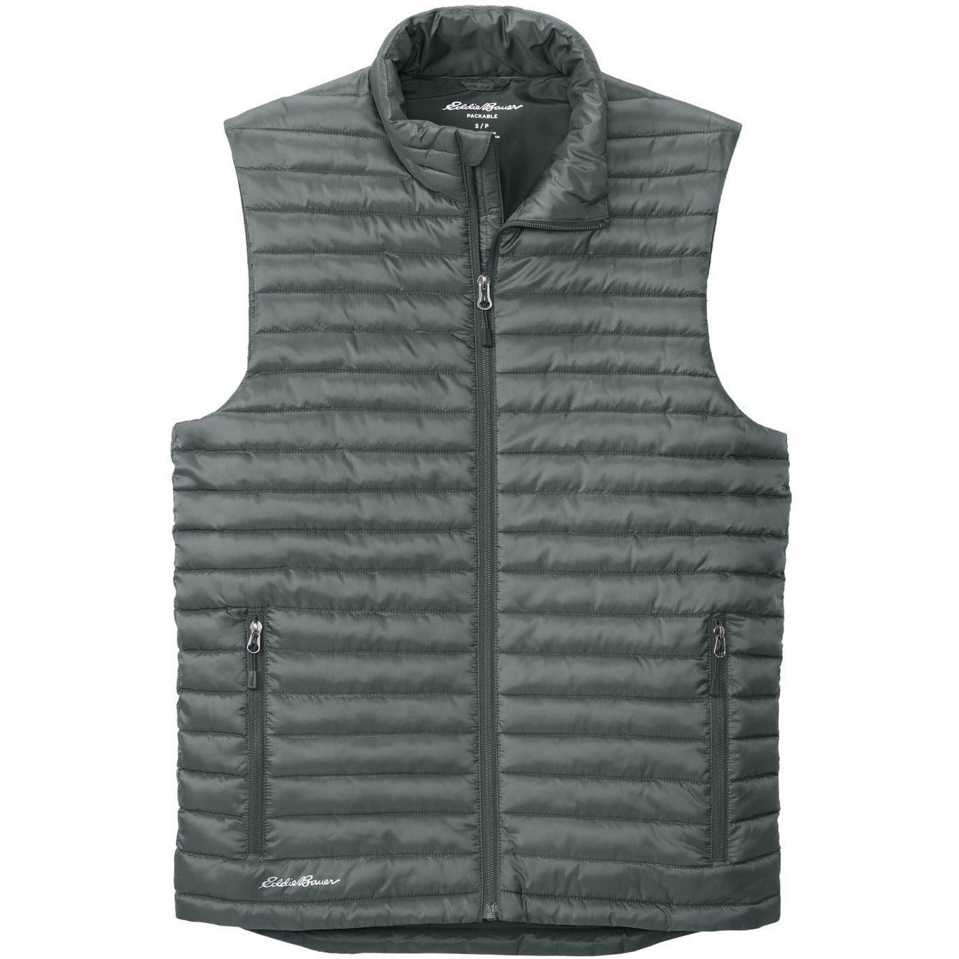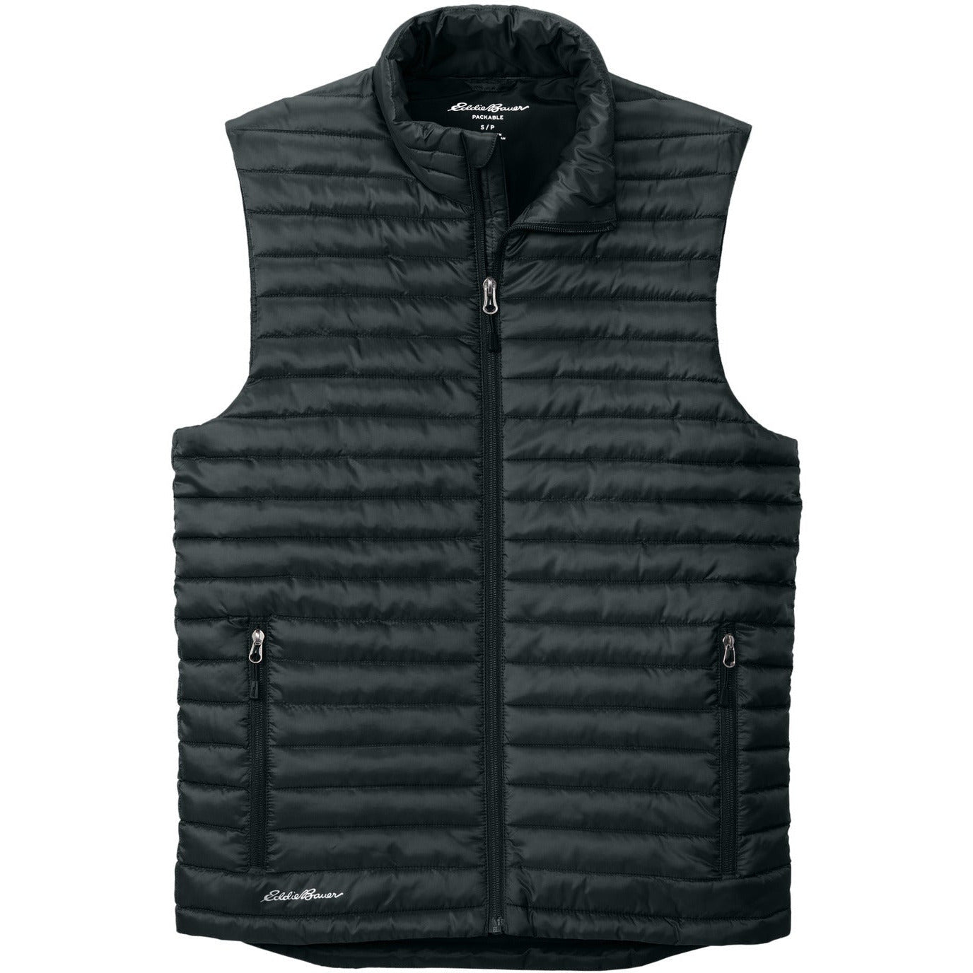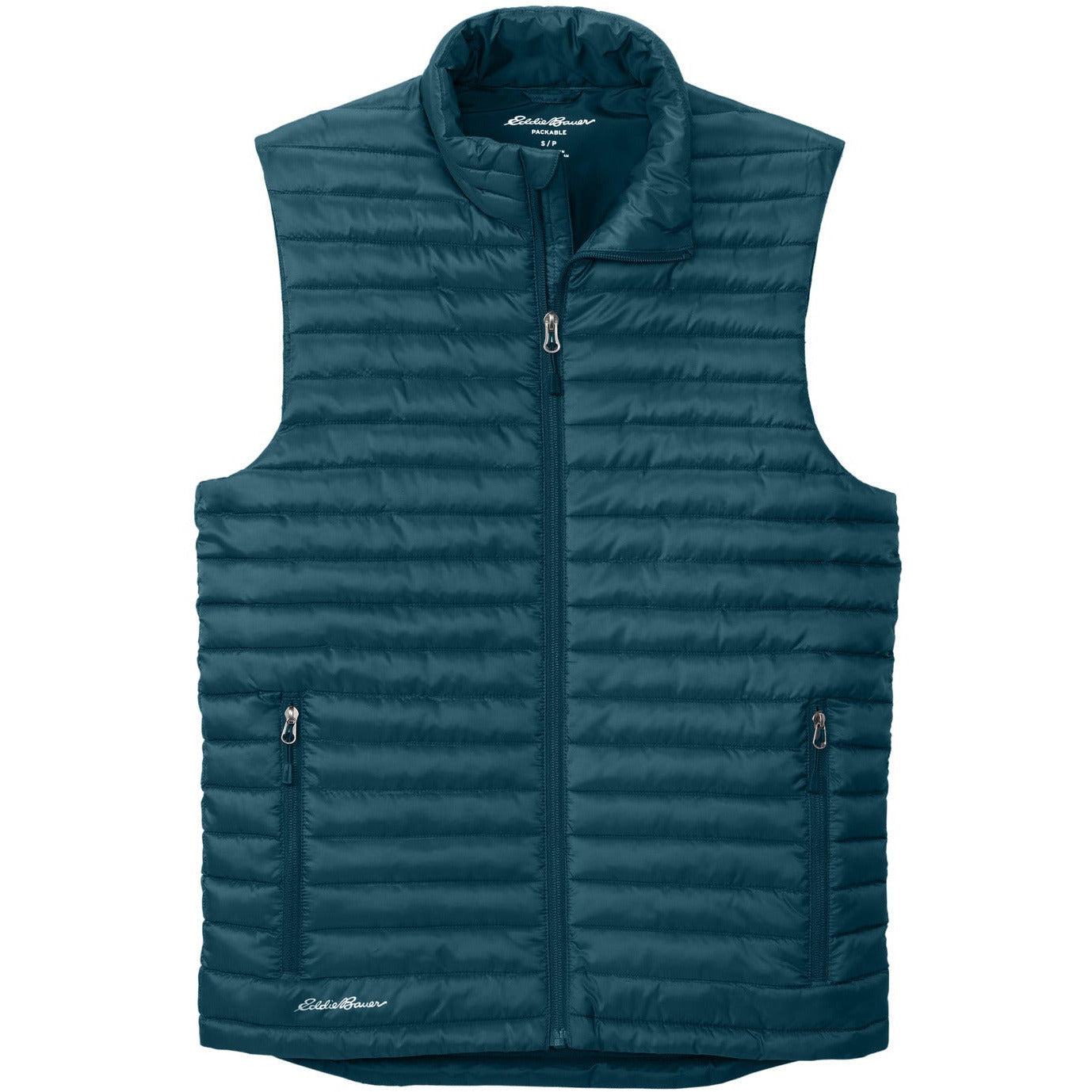 Designed with traditional quilt lines, this insulated vest is built for warmth and weather-resistant performance. Features include full-length interior storm flap with chin guard, exposed, molded zippers with Eddie Bauer logo pulls, zippered hand pockets and a slight drop tail hem. Includes a decoration access pocket. Packs into zippered left hand pocket. Contrast Eddie Bauer heat transfer logo on right hem. Made of 100% polyester ripstop and 3.8-ounce, 100% polyester blown fill. PU coating on back of shell. Durable water-repellent (DWR) finish.