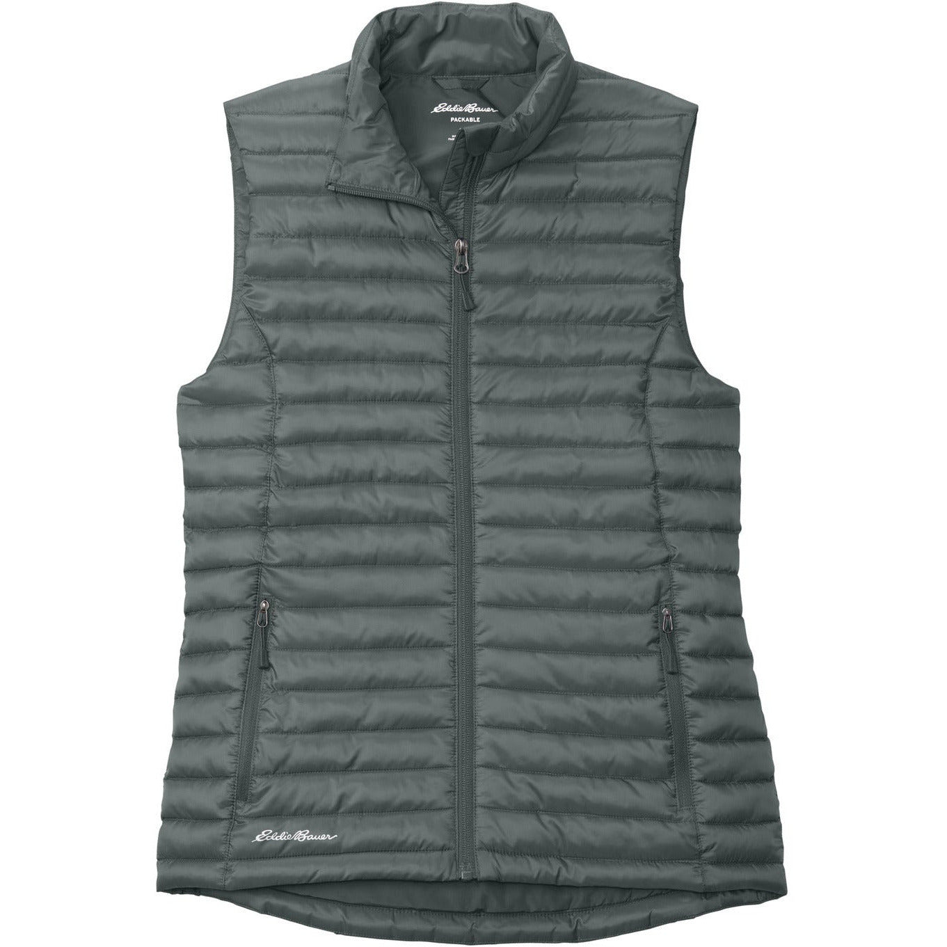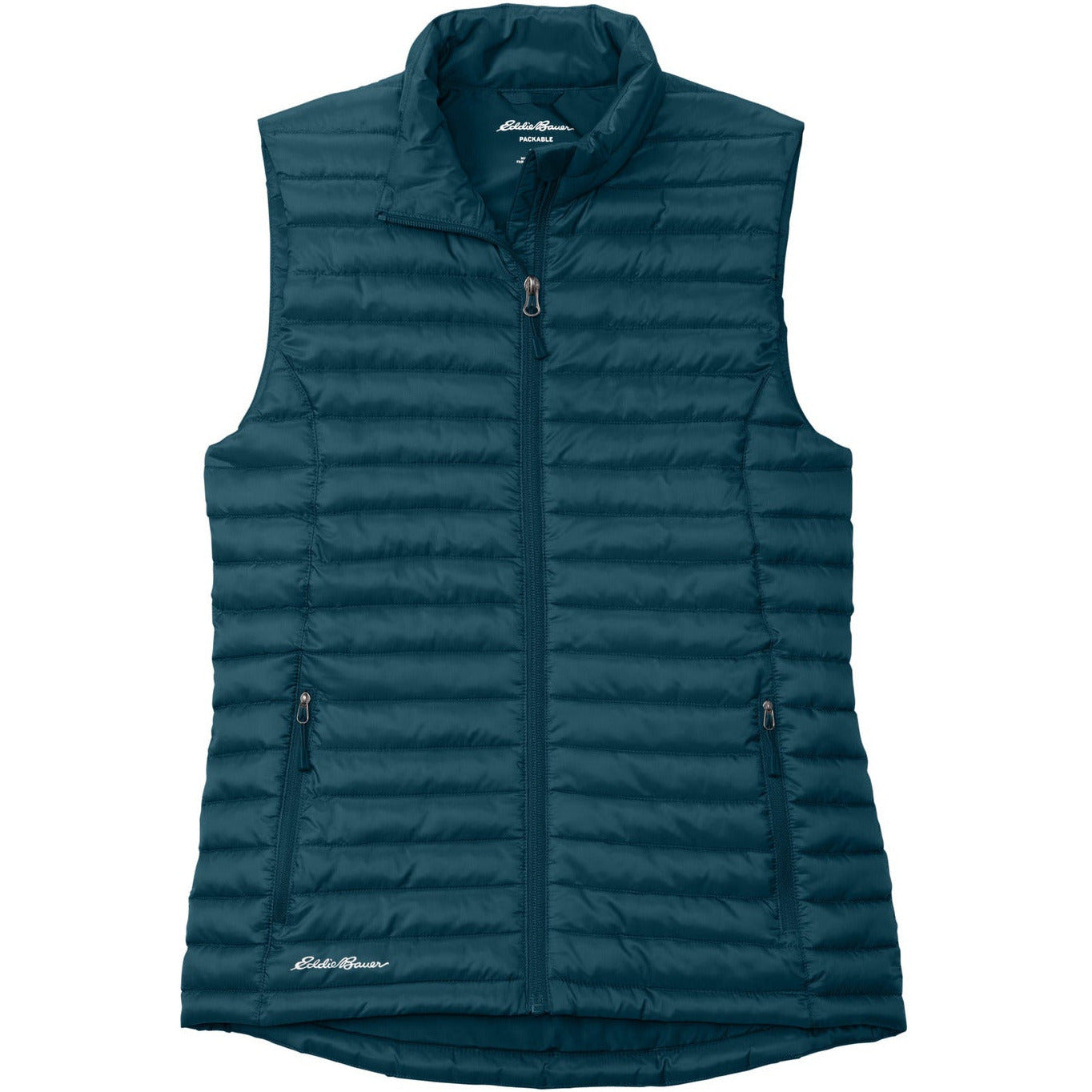 Designed with traditional quilt lines, this insulated vest is built for warmth and weather-resistant performance. Features include full-length interior storm flap with chin guard, exposed, molded zippers with Eddie Bauer logo pulls, zippered hand pockets and a slight drop tail hem. Includes a decoration access pocket. Packs into zippered left hand pocket. Contrast Eddie Bauer heat transfer logo on right hem. Made of 100% polyester ripstop and 3-ounce, 100% polyester blown fill. PU coating on back of shell. Durable water-repellent (DWR) finish.