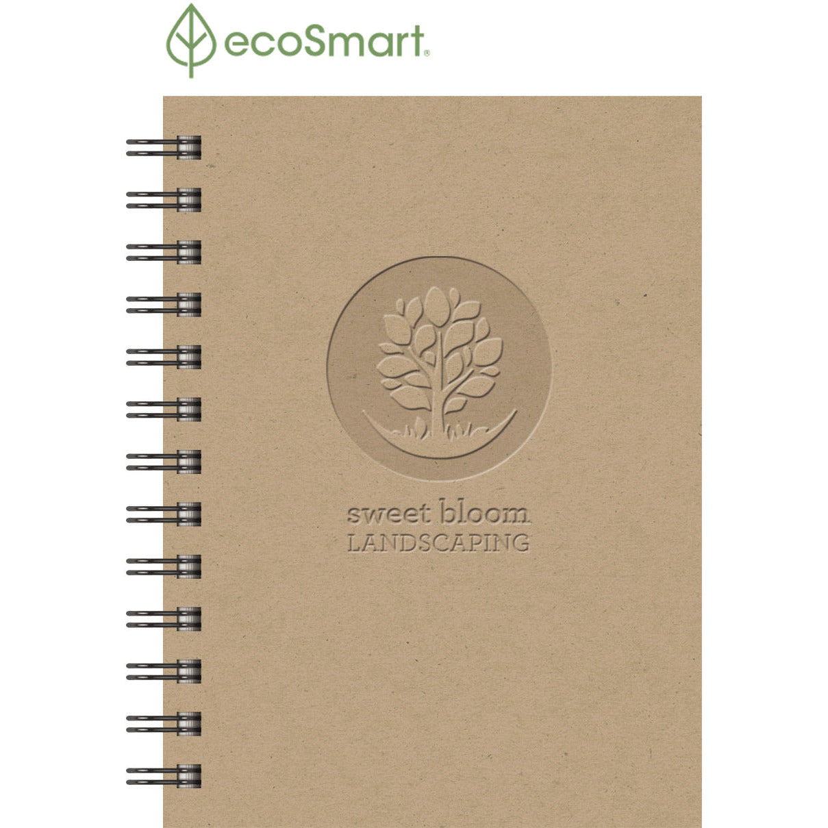Choose from our 100% recycled paperboards - Natural, EcoBlack, and Gray - for front and back cover. Includes 1-color foil or blind deboss imprint up to 16 square inches, 100 sheets of lined EcoFiller, or blank. Graph or dot grid available for an upcharge (contact sales for pricing). Black wire binding is standard; also available in white, bronze and pewter.