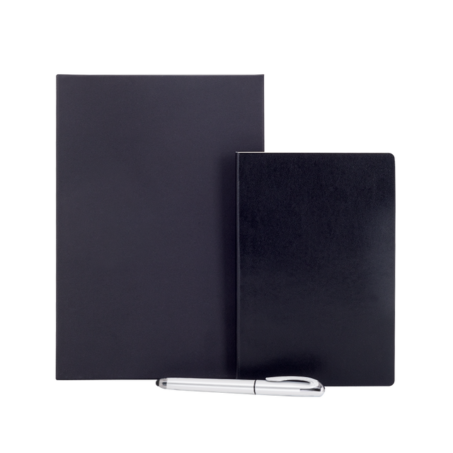 Meet the Basecamp® Atlas Notebook & Pen Set – a perfect blend of style and sustainability! This set includes a notebook with a soft recycled vegan leather cover and 100 lined pages, complete with the debossed Basecamp® logo. Paired with a sleek metallic recycled pen, featuring black hybrid ink and a stylus tip, it's designed for smooth writing and quick transitions between paper and screen.