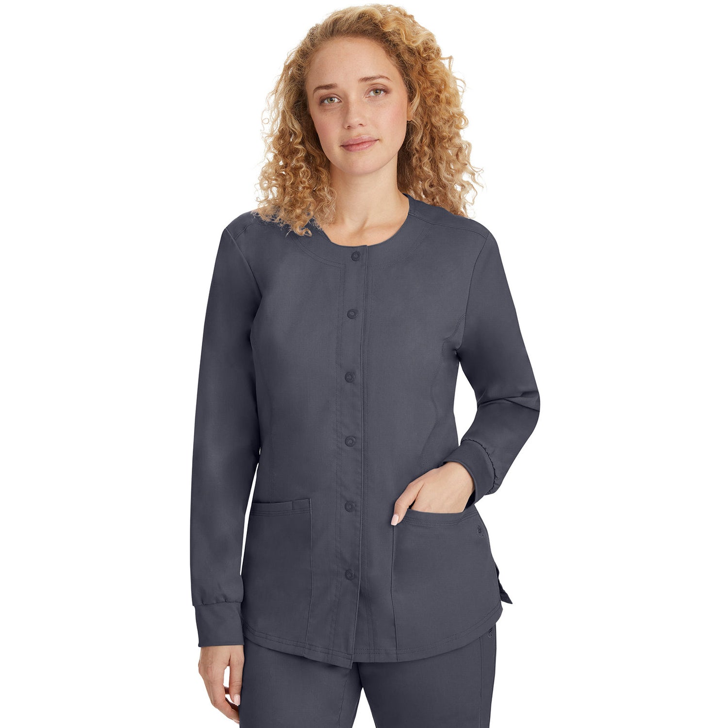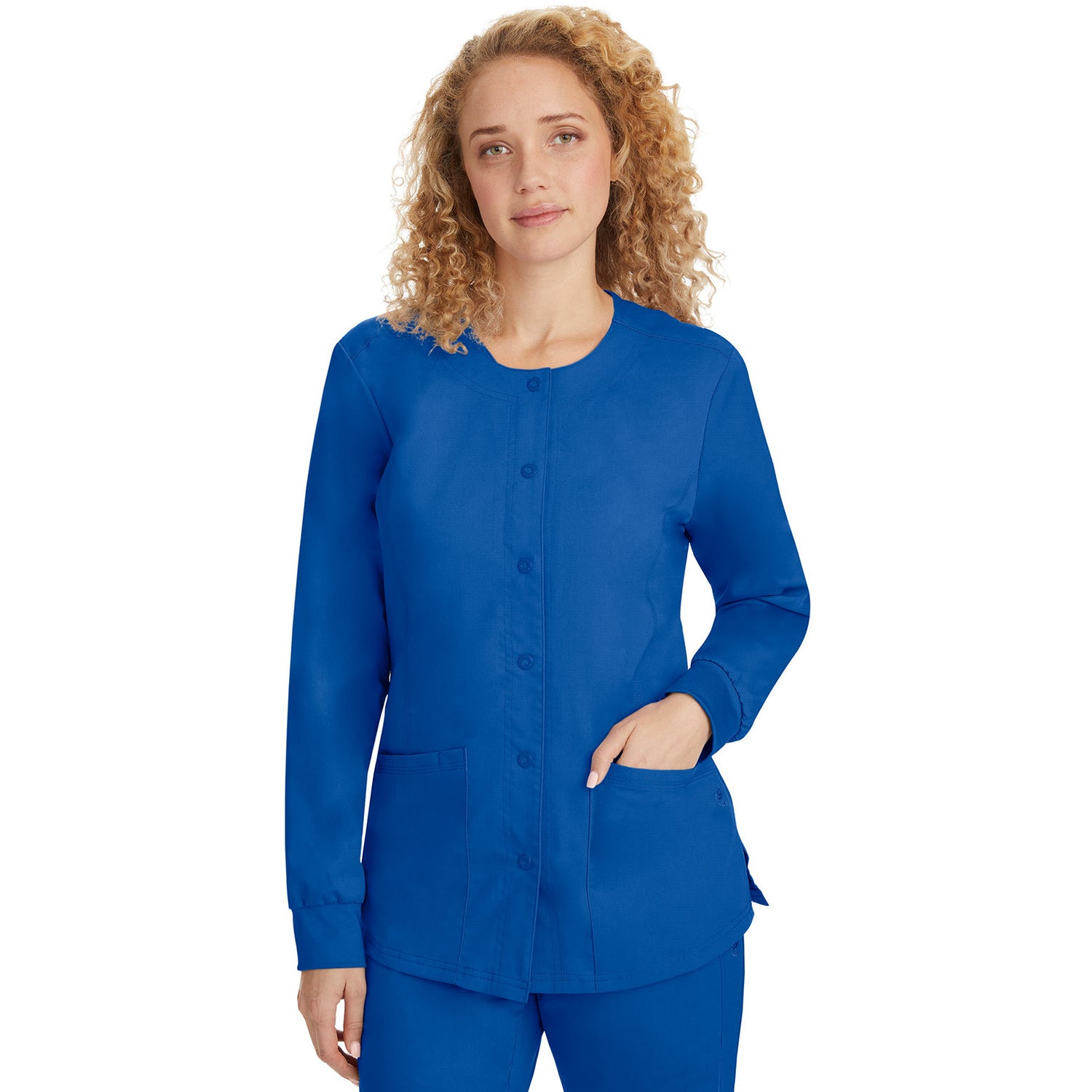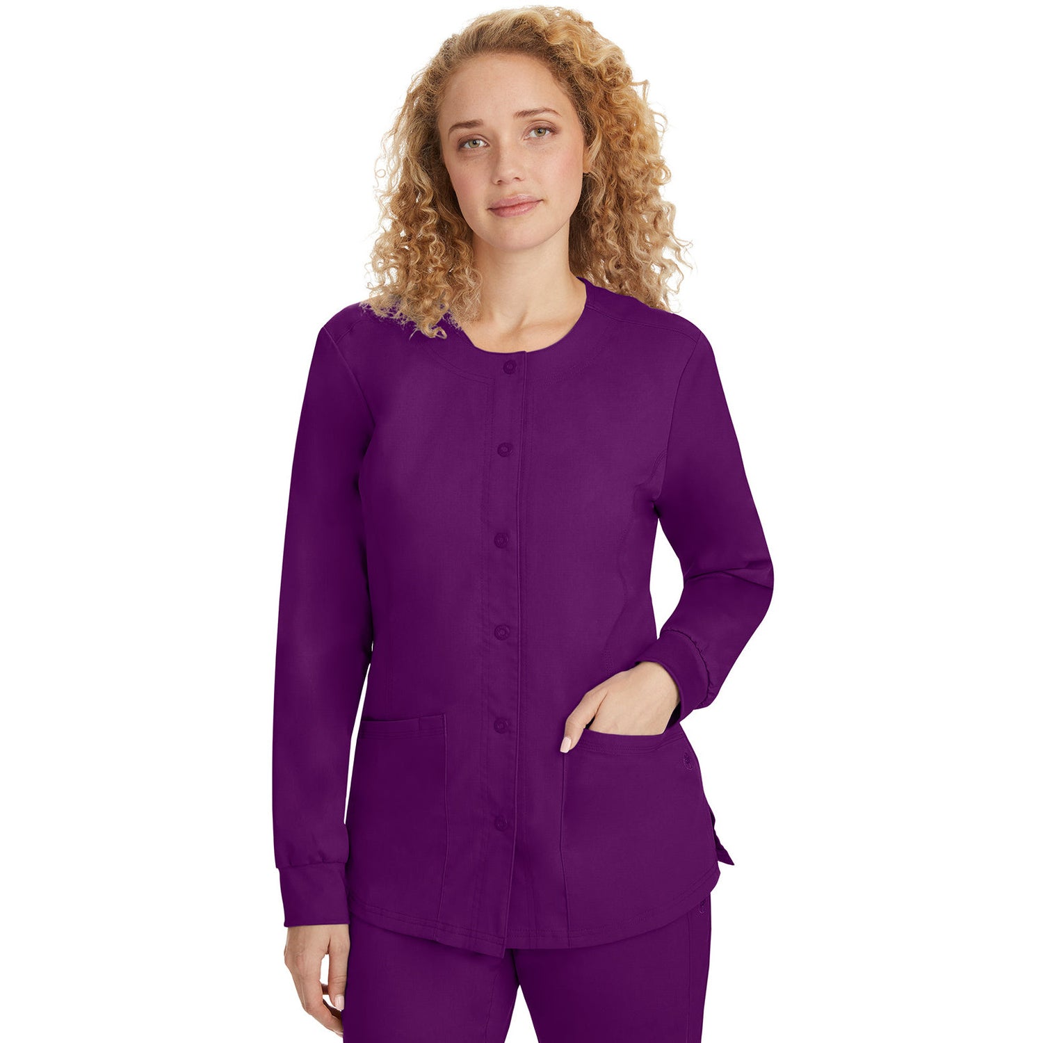 The Purple Label line by Healing Hands Scrubs was designed for performance and comfort. The easy care Poly/Rayon blend is durable while still feeling luxurious on the skin. With just the right amount of stretch, Purple Label scrubs are made to move with you through even the longest shift. The "Daisy" jacket features Healing Hands logo snap front closure, princess seams for superior fit, soft knit cuffs, round neck, 2 patch pockets, and one cellphone pocket.77% Polyester/20% Rayon/3% Spandex. Modern fit. Center back length: 26".