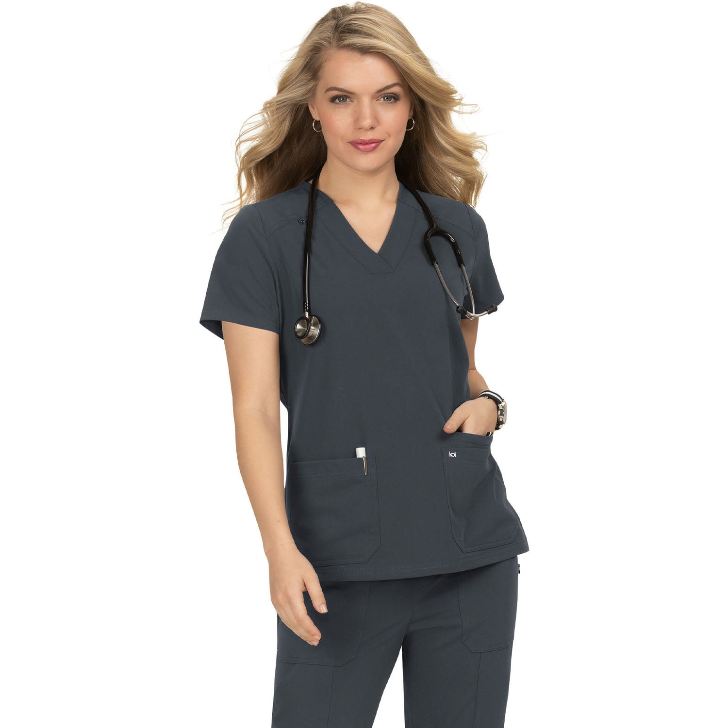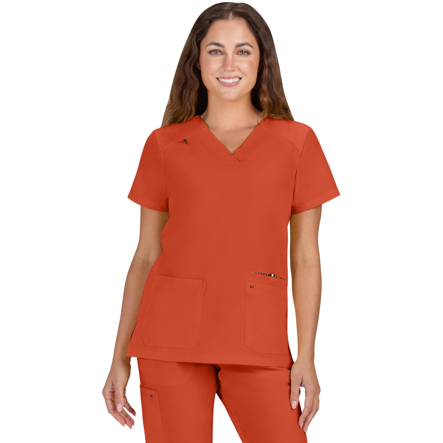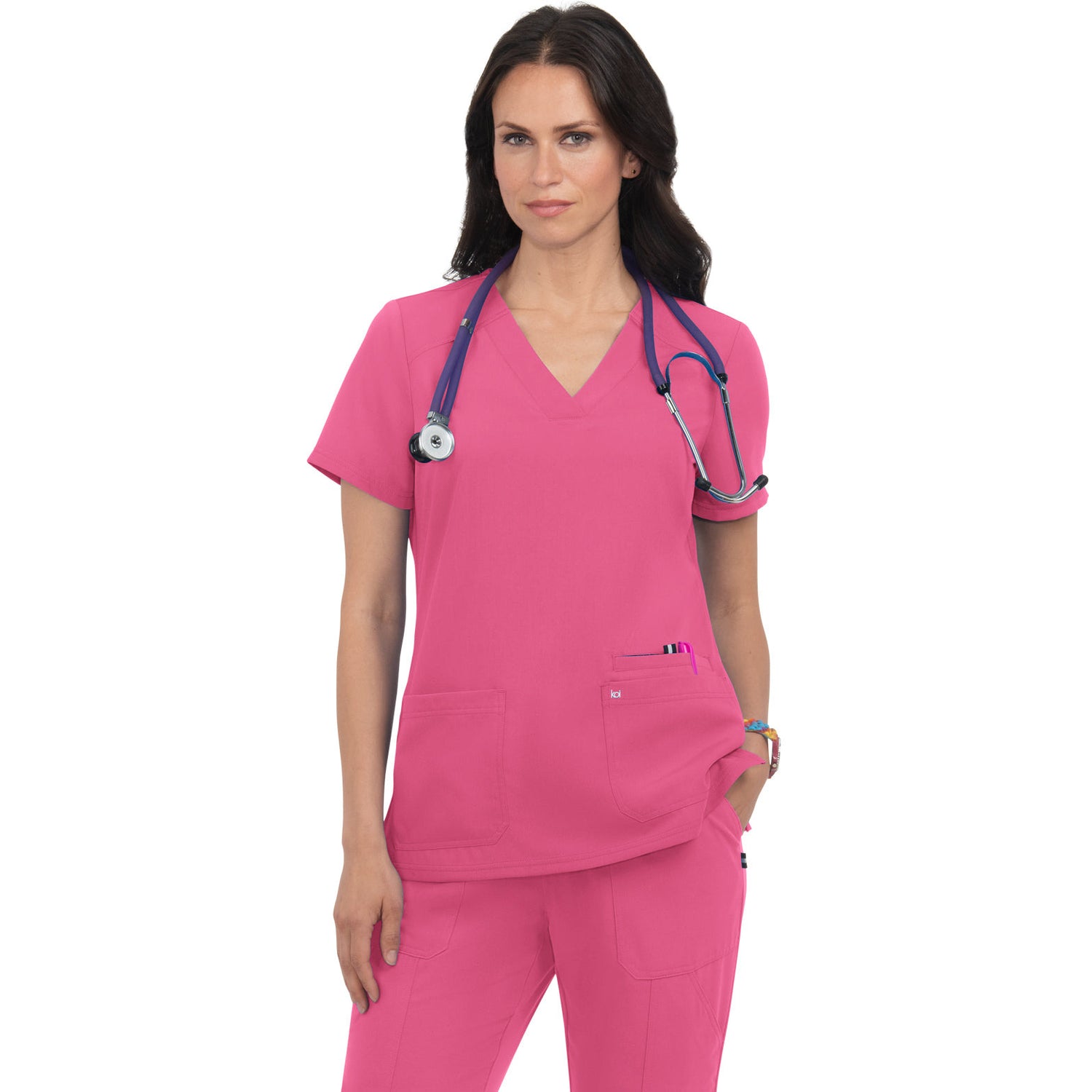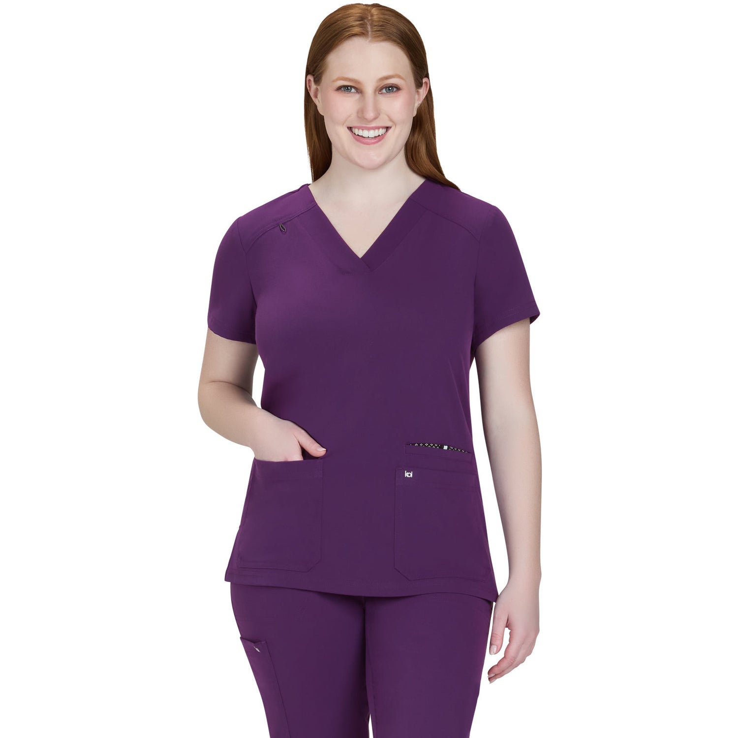 Transform your workday with a scrub top you'll truly love. This stylish top combines a flattering wide v-neck with a modern classic fit and comfortable 4-way stretch fabric, ensuring you look and feel your best throughout your shift. Practical details like a badge loop and three pockets keep your essentials organized and within reach. The signature back tab adds a touch of sophistication, while side slits enhance breathability and movement. With a length of 27 inches (size Small), this top offers a flattering silhouette. Please note that this style tends to run slightly large, so consider sizing down for the perfect fit. Say goodbye to drab scrubs and embrace a top that brings both comfort and style to your workday!