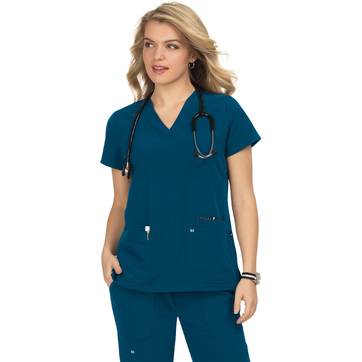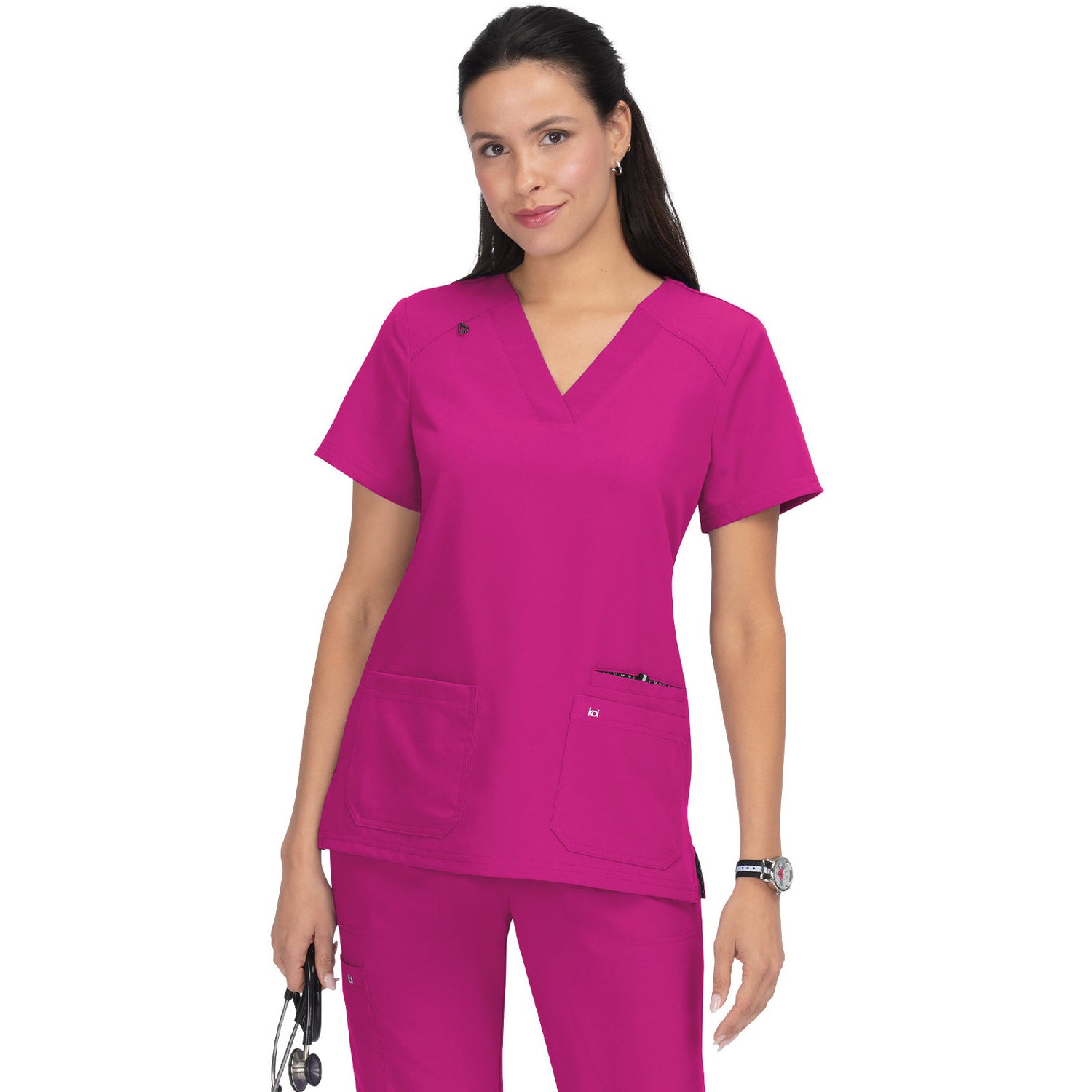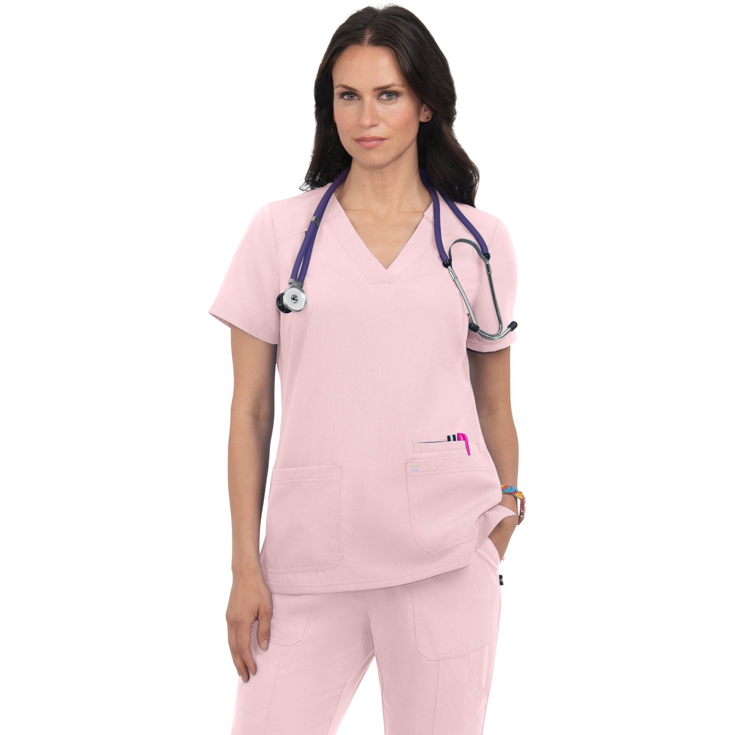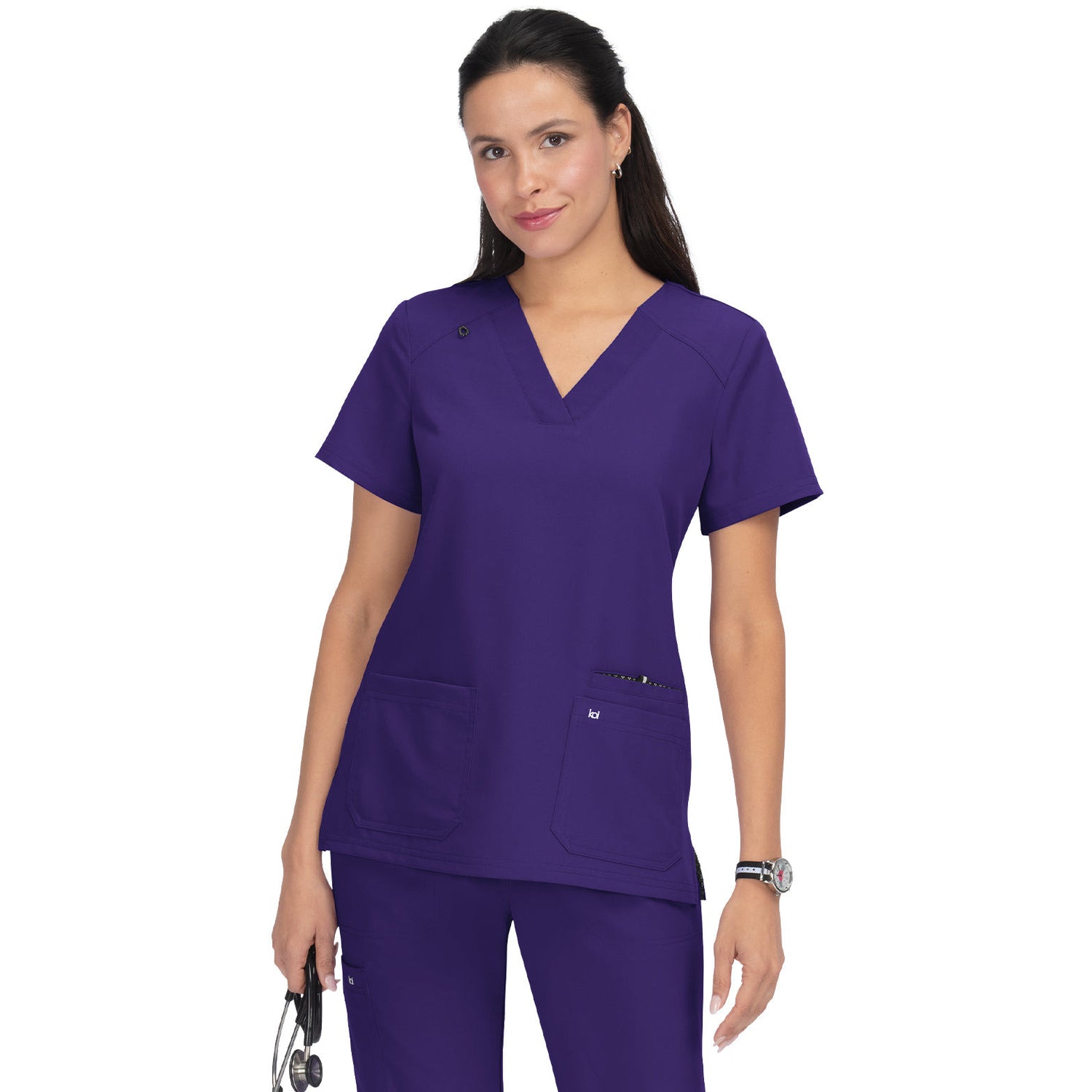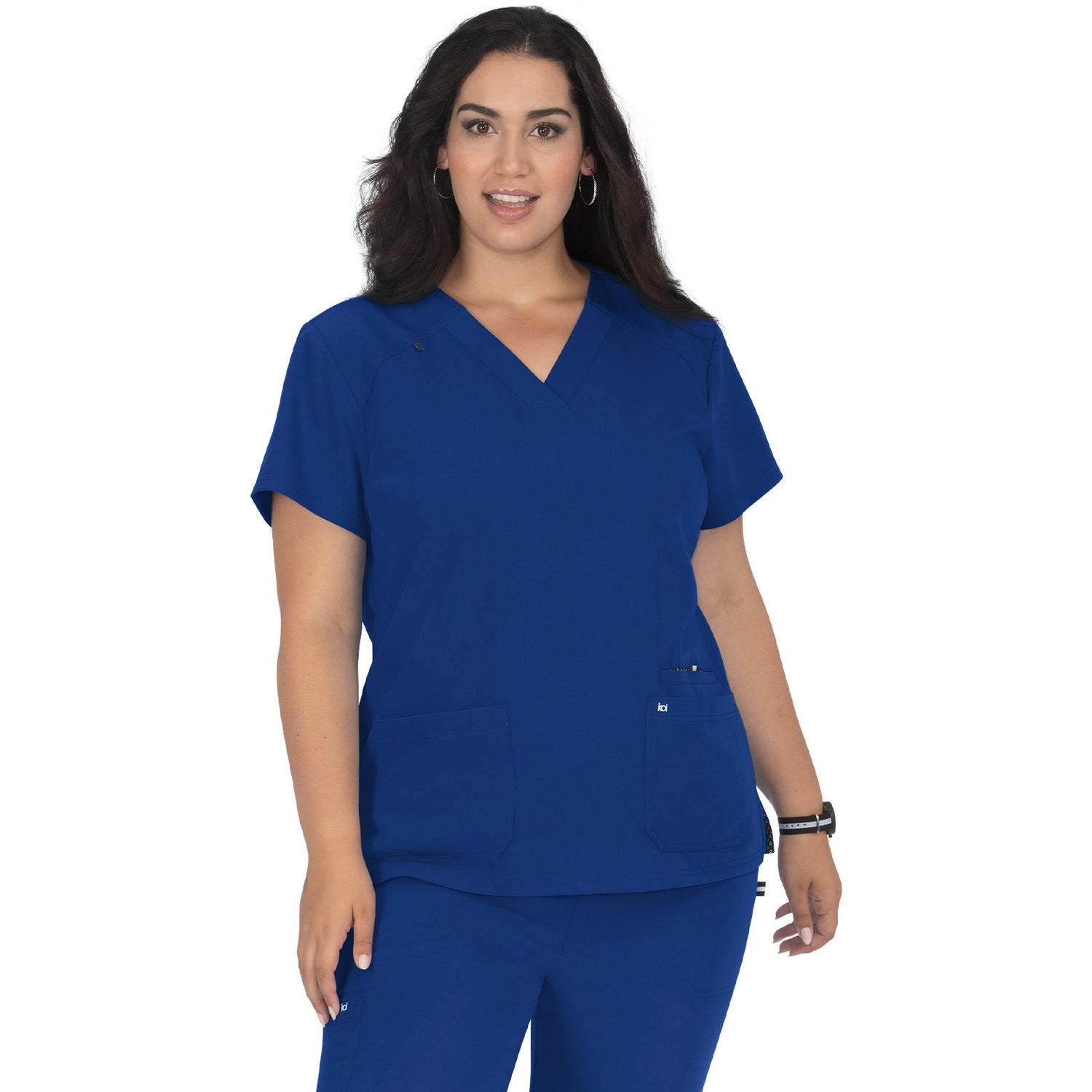 Transform your workday with a scrub top you'll truly love. This stylish top combines a flattering wide v-neck with a modern classic fit and comfortable 4-way stretch fabric, ensuring you look and feel your best throughout your shift. Practical details like a badge loop and three pockets keep your essentials organized and within reach. The signature back tab adds a touch of sophistication, while side slits enhance breathability and movement. With a length of 27 inches (size Small), this top offers a flattering silhouette. Please note that this style tends to run slightly large, so consider sizing down for the perfect fit. Say goodbye to drab scrubs and embrace a top that brings both comfort and style to your workday!