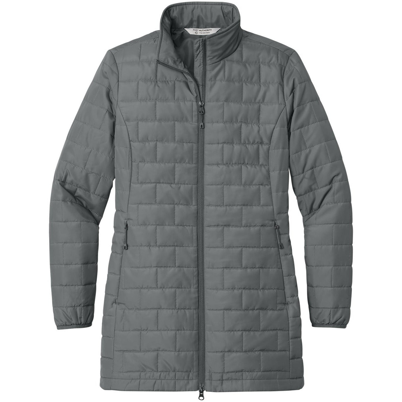 A beautiful brick pattern, water-resistance and recycled materials come together in this sustainable jacket. 100% recycled ripstop shell 3.5-ounce, 100% recycled polyester polyfill insulation This product's carbon footprint has been measured and reduced through a combination of preferred materials and investing in carbon offset projects though the ClimeCo Certified Product Program Zip-through cadet collar Full-length interior storm flap Hidden zippered hand pockets Elastic binding at cuffs Longer length Port Pocket for decoration access Water protection method: Durable water-repellent (DWR) finish A C-FREE Product