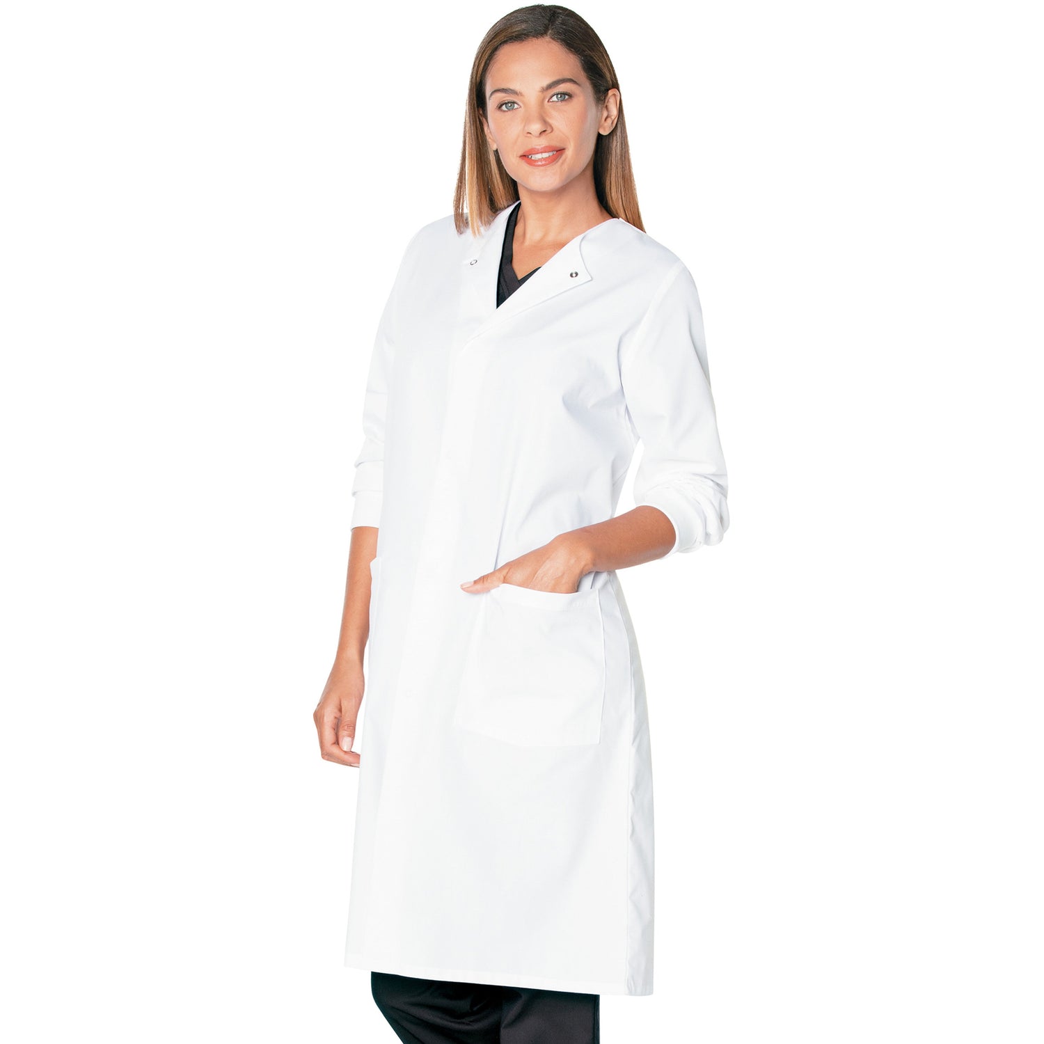 Cover yourself in style with this Landau unisex full-length lab coat. Fade-resistant, breathable material is brushed for a soft comfortable feel with a clean professional appearance. Featuring two patch pockets, a crew neck, stockinette sleeve cuffs, and five-snap closure, this coat provides all the storage and convenience you need for your day. 65% Polyester/35% Combed Cotton. Medium Length: 41 3/4".