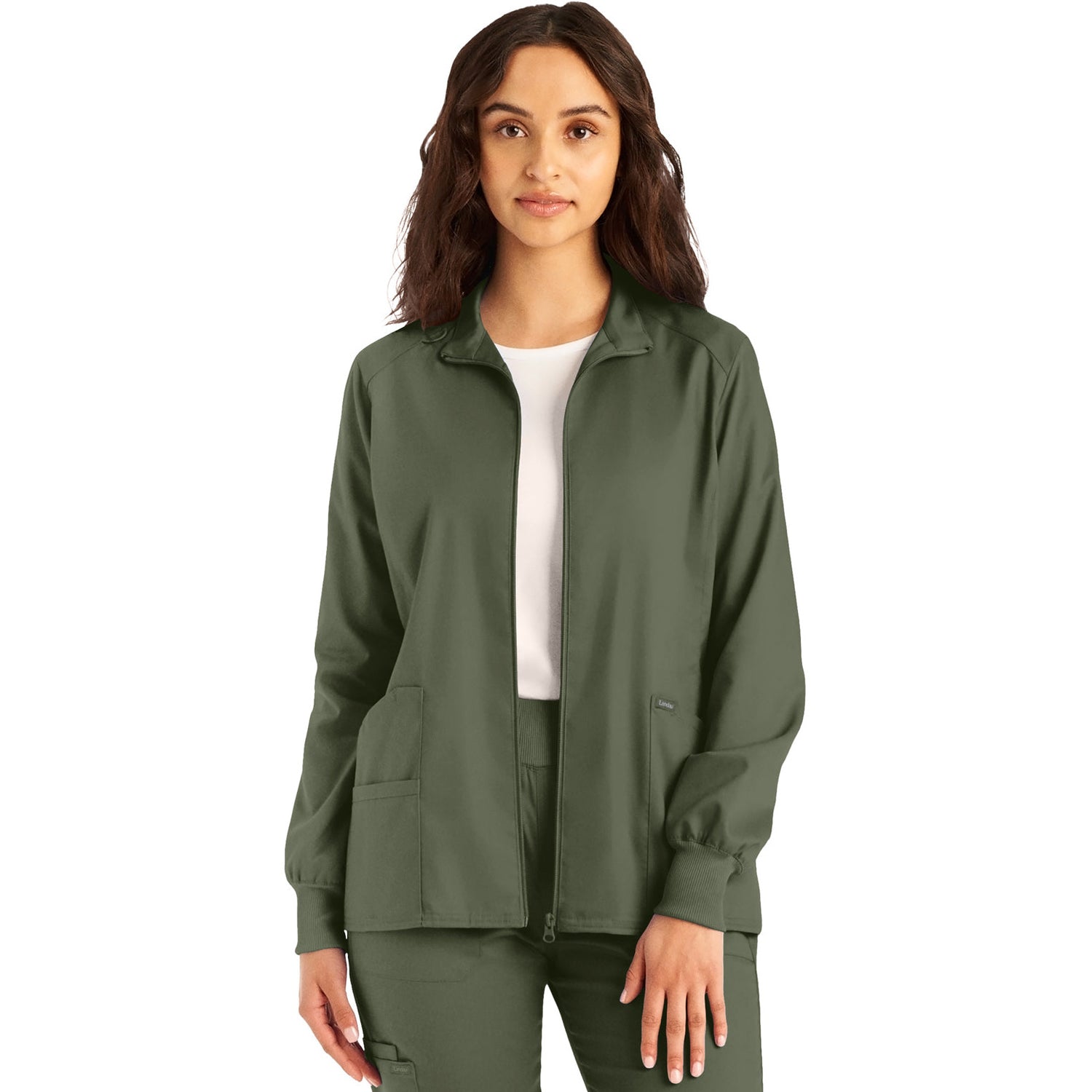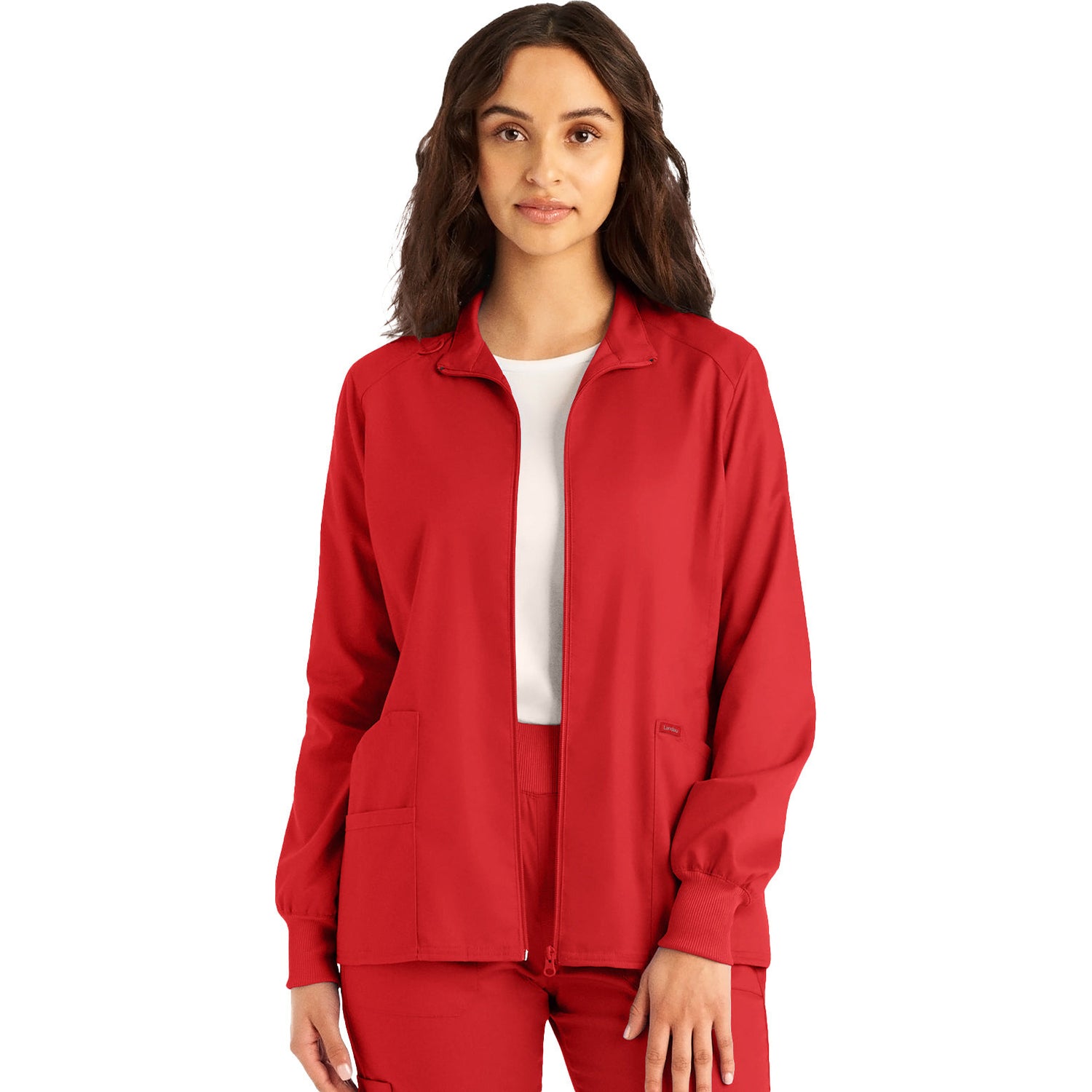 Stay warm and comfortable with this sporty, Modern Fit jacket! With front and back princess seams, rib knit cuff sleeves, mock neck collar, ID badge loop, 2 large pockets and 1 Small pocket with a hidden elastic loop to keep your accessories organized. This jacket can go from home to office any day. Size Small length: 26.5"