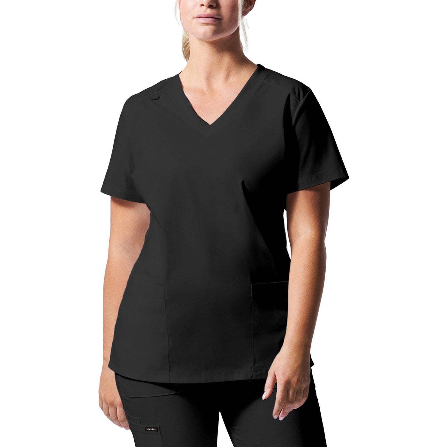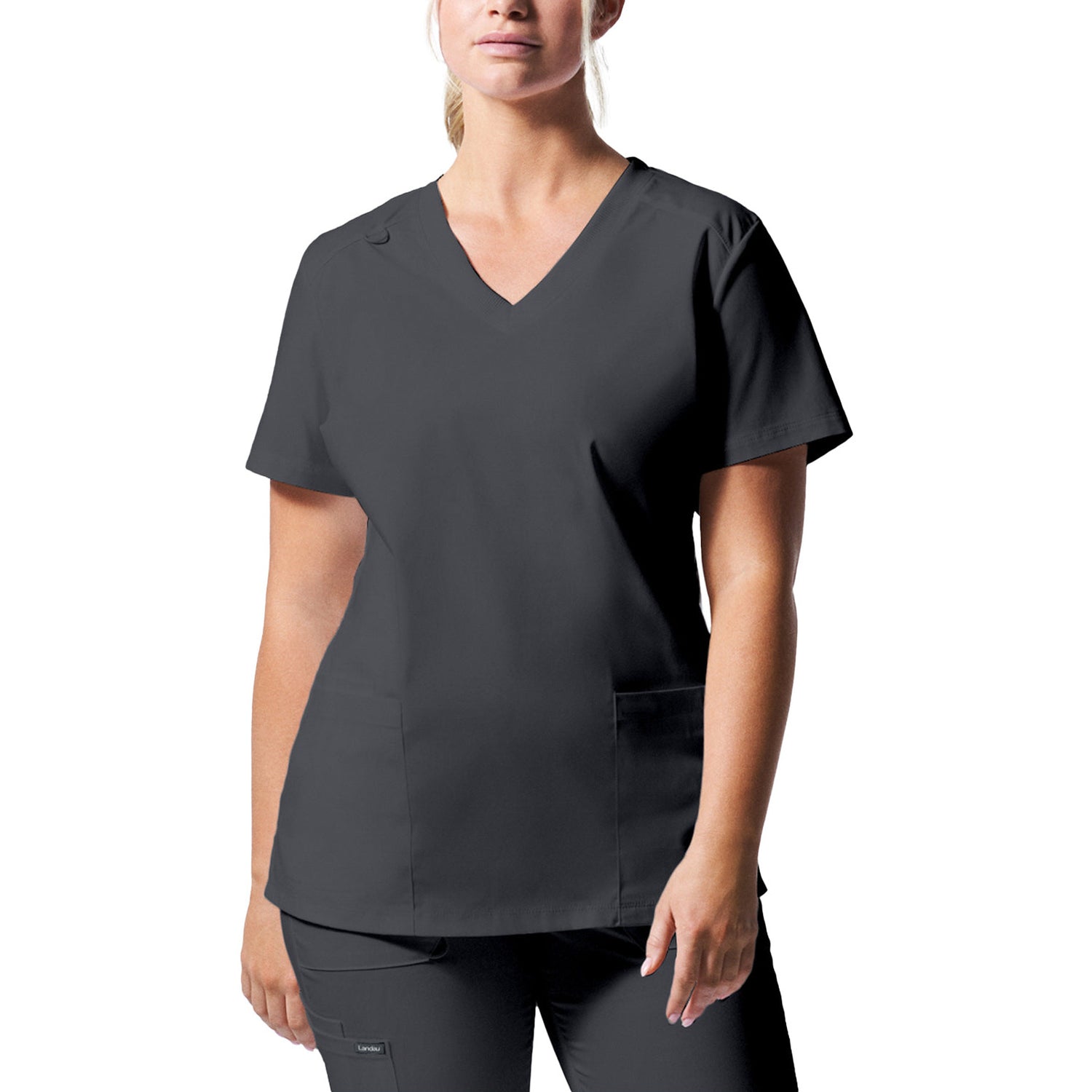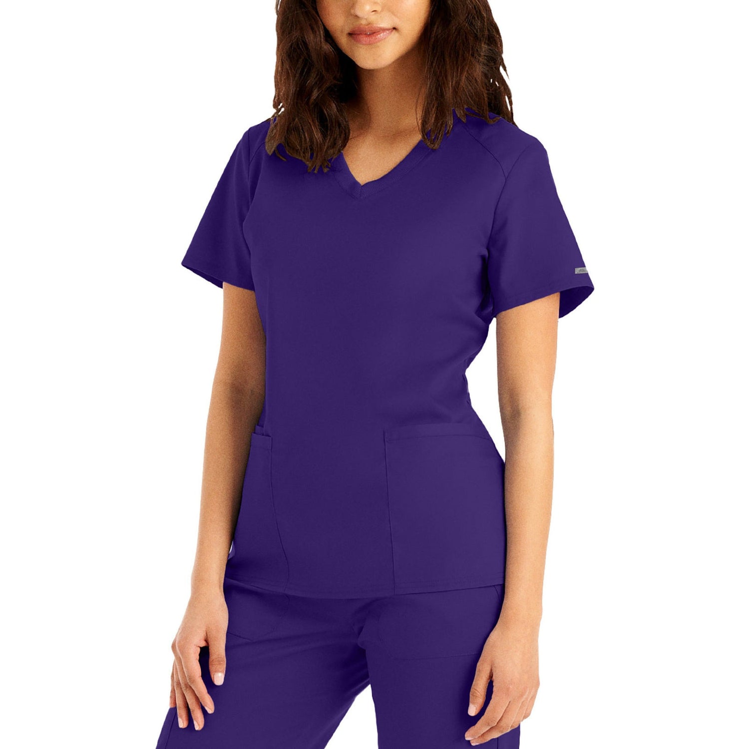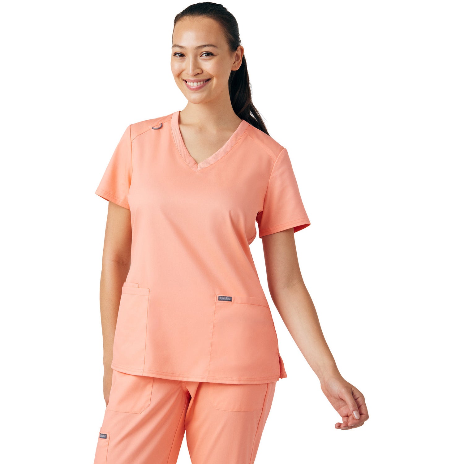 This Modern Fit, V-neck top not only is comfortable and high functioning. It features a rib knit neckband and back panels for extra comfort and movement. 2 Large pockets with a hidden elastic to hold stationary items close at hand an additional small pocket and side vents makes it perfect for your busy workday. Size Small length: 26"
