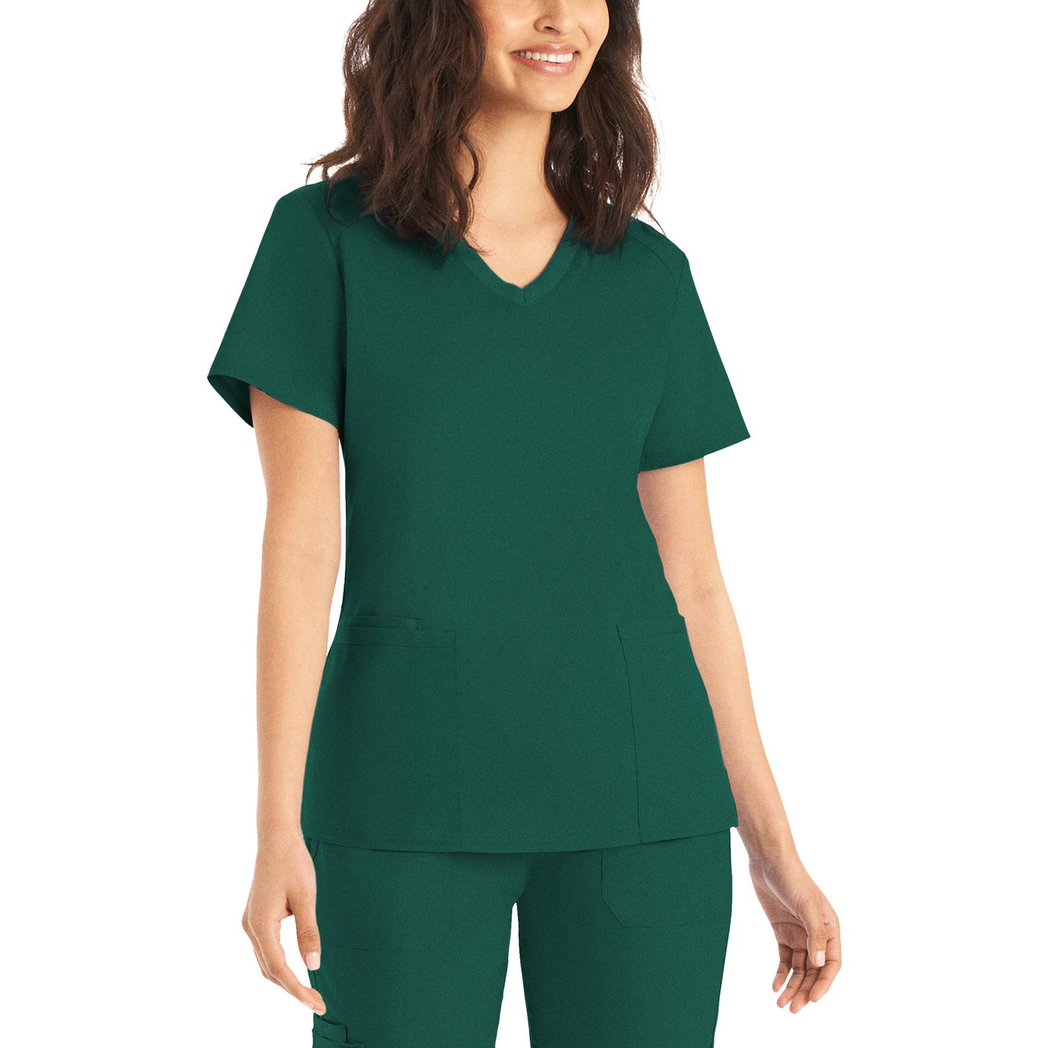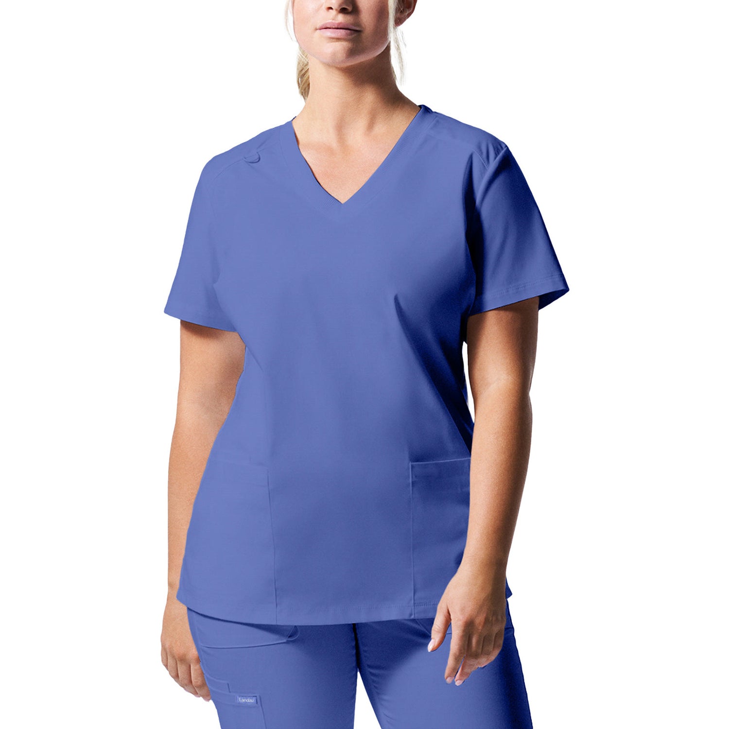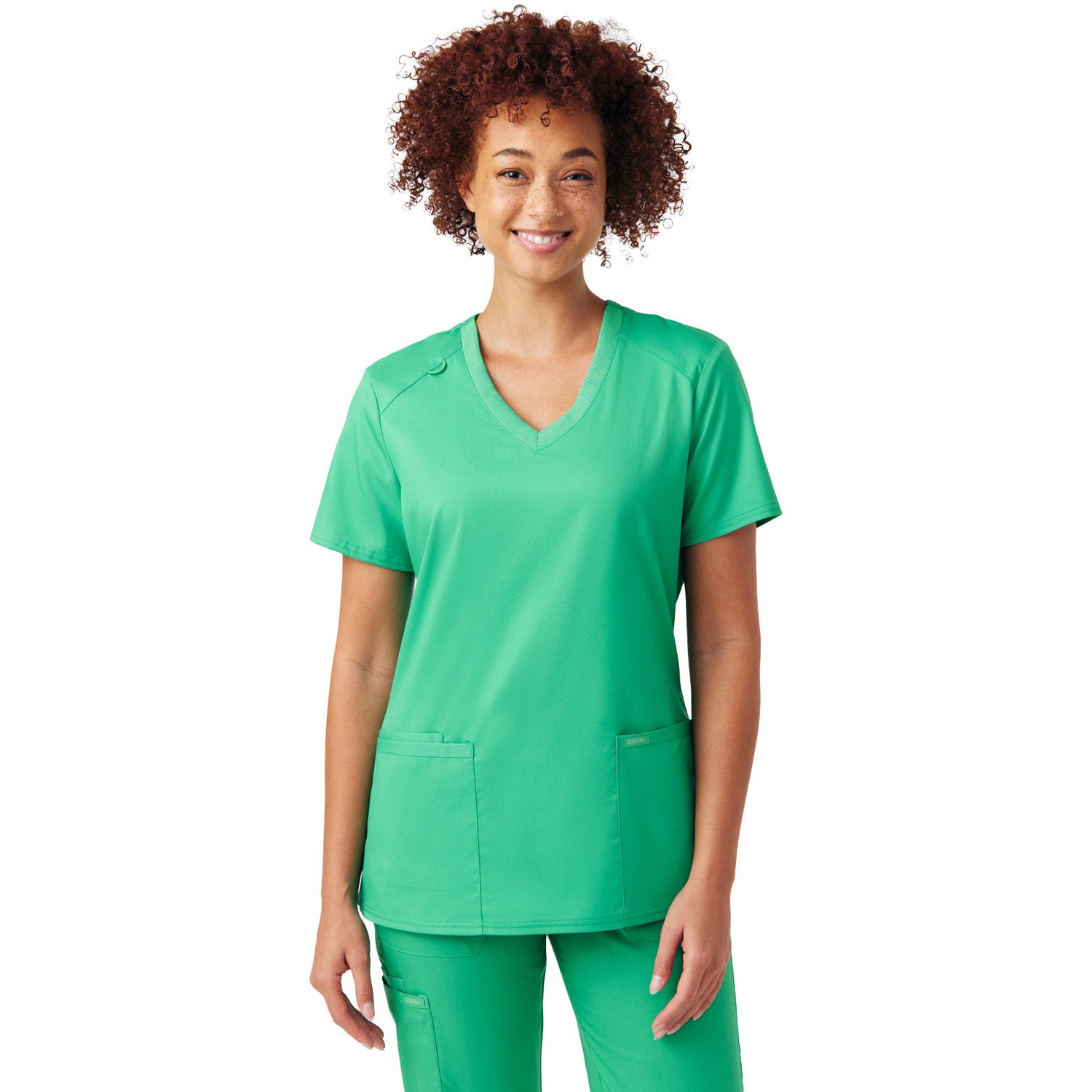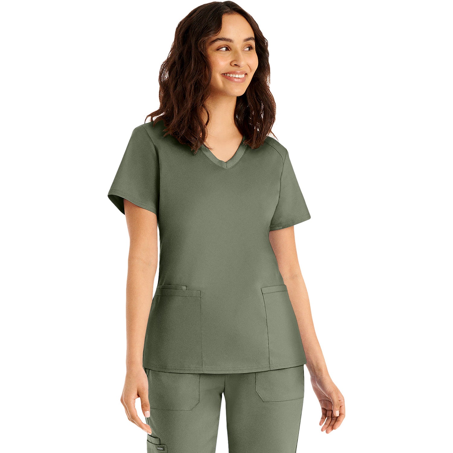 This Modern Fit, V-neck top not only is comfortable and high functioning. It features a rib knit neckband and back panels for extra comfort and movement. 2 Large pockets with a hidden elastic to hold stationary items close at hand an additional small pocket and side vents makes it perfect for your busy workday. Size Small length: 26"