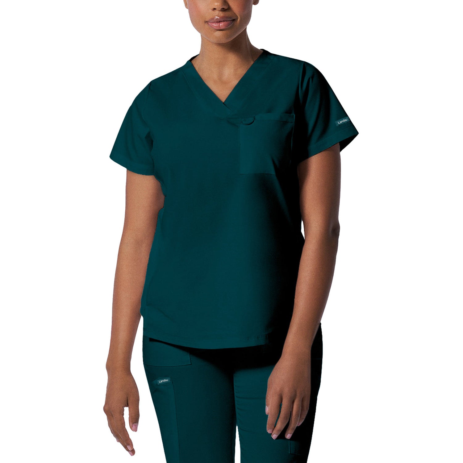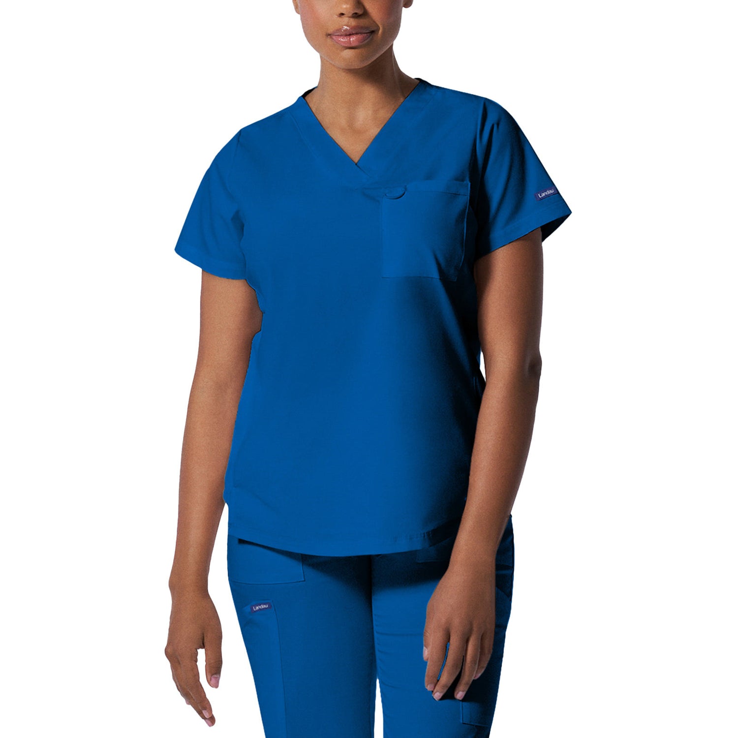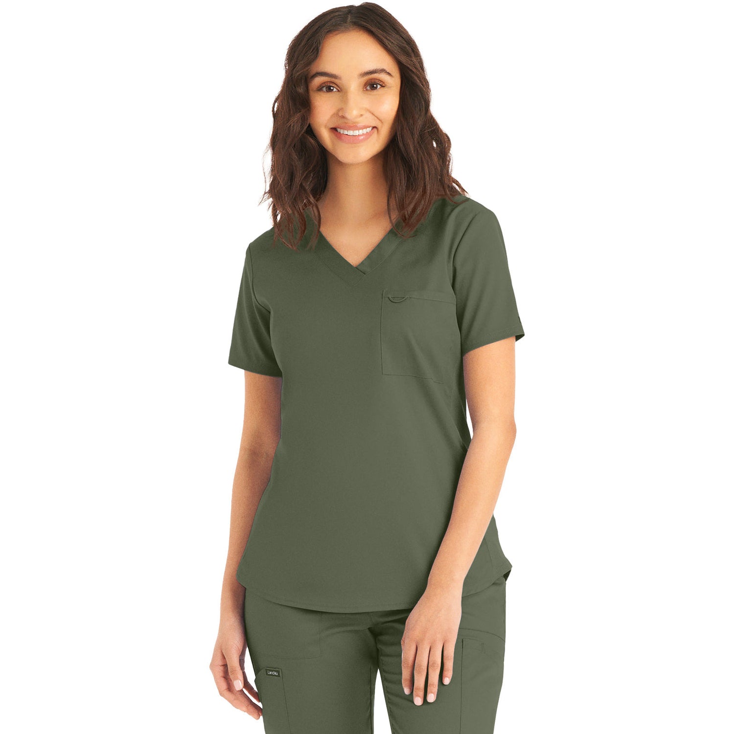 A Modern Fit, V-neck top with princess seams, and features rib knit side panels to provide comfort as you move through out your day. With a front chest pocket and a additional back side pocket to hold additional items, it can be worn untucked, half tucked, or fully tucked. Size Small length: 25.5"