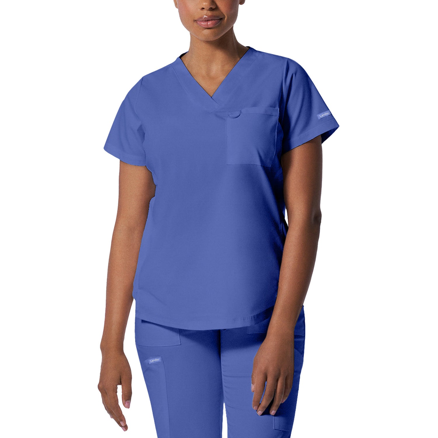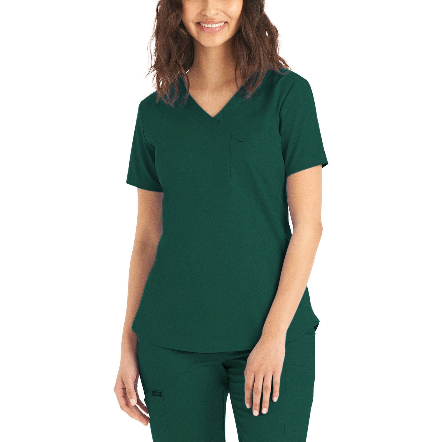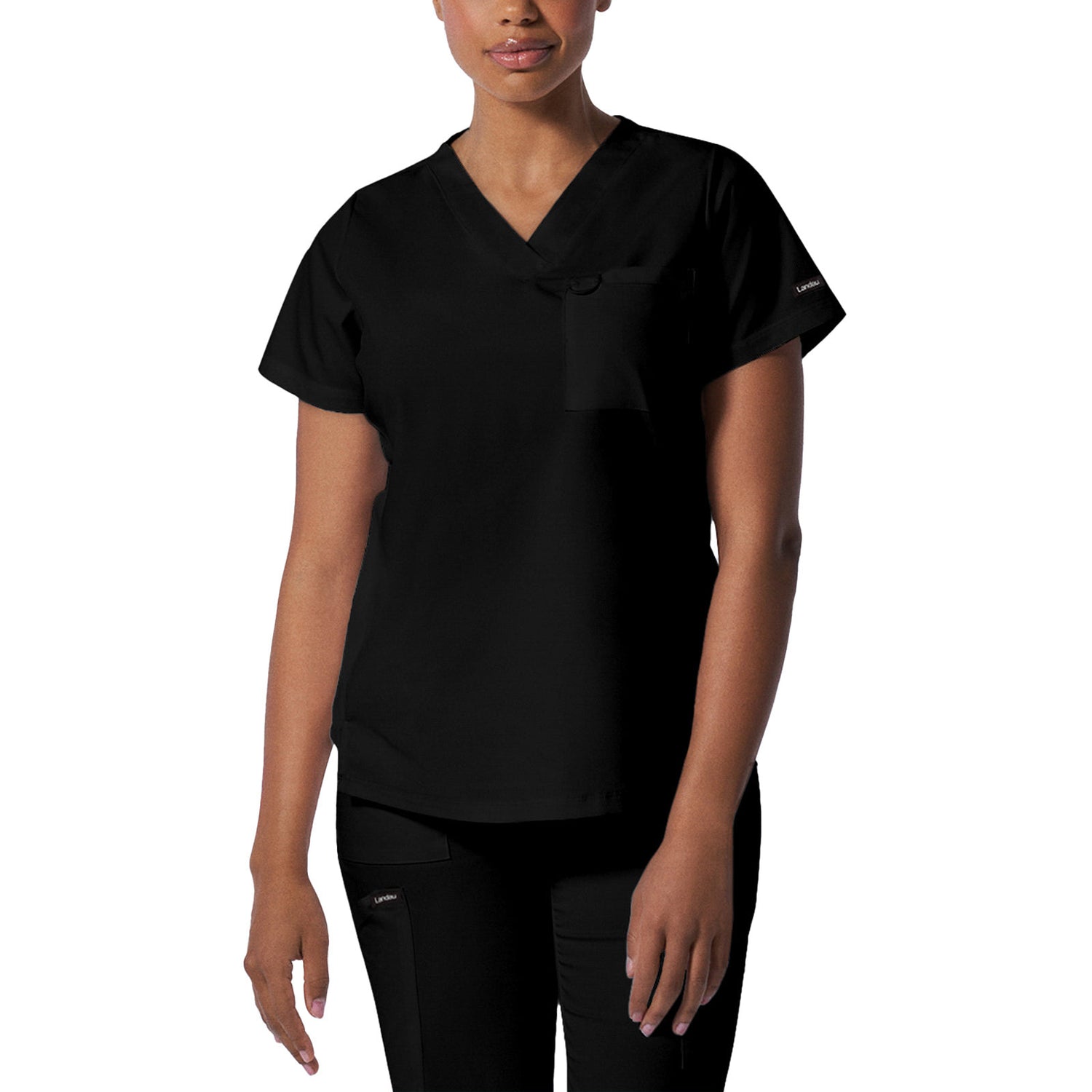 A Modern Fit, V-neck top with princess seams, and features rib knit side panels to provide comfort as you move through out your day. With a front chest pocket and a additional back side pocket to hold additional items, it can be worn untucked, half tucked, or fully tucked. Size Small length: 25.5"