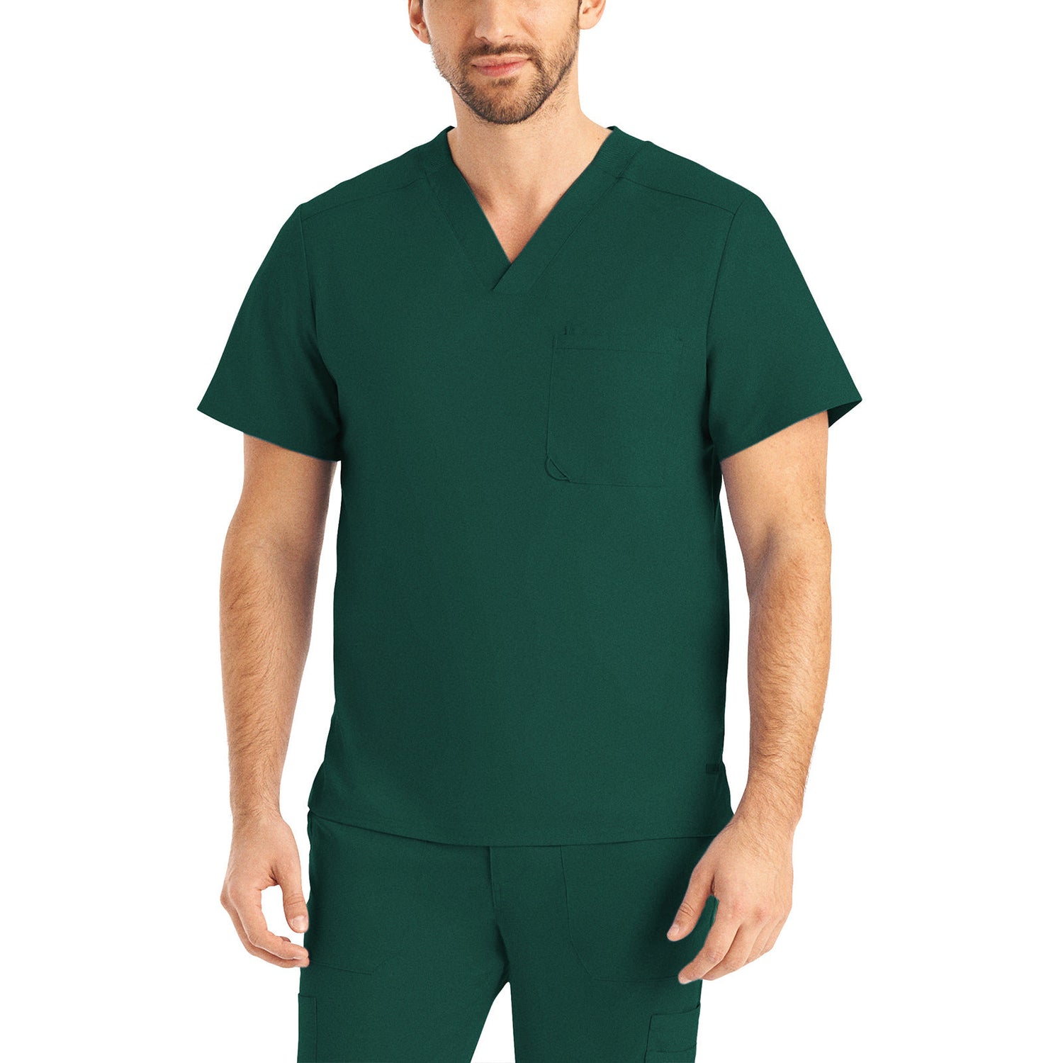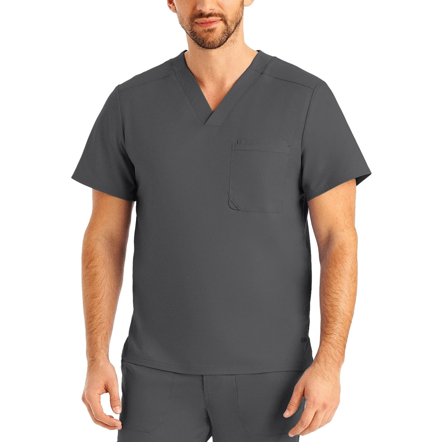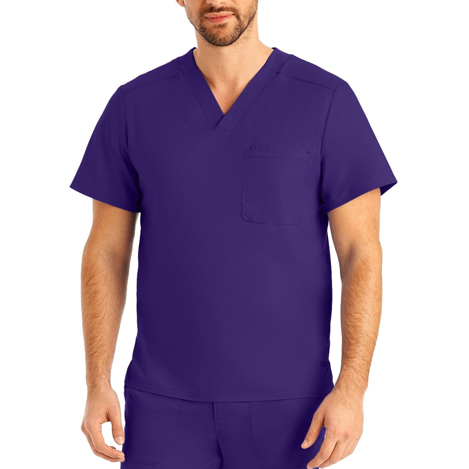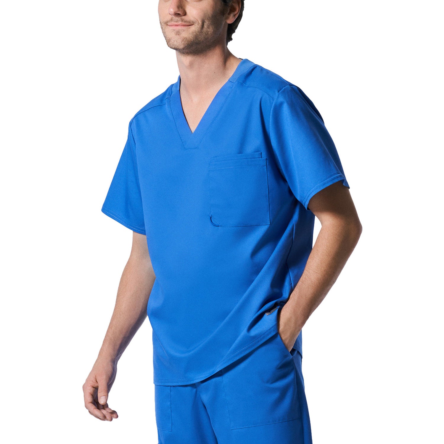 Upgrade your workwear with this versatile men's fit v-neck scrub top, designed for both style and comfort. The modern, tapered fit flatters your shape while allowing for unrestricted movement, thanks to the 2-way stretch fabric. A rib-knit neckline adds a touch of sophistication and enhances mobility, while side vents ensure breathability throughout your shift. The double chest pocket with a bungee loop keeps your essentials secure and easily accessible. Whether you prefer it untucked, half-tucked, or fully tucked, this top offers a polished and professional look. Experience the perfect blend of fashion and function with this fade-resistant and wrinkle-resistant scrub top.