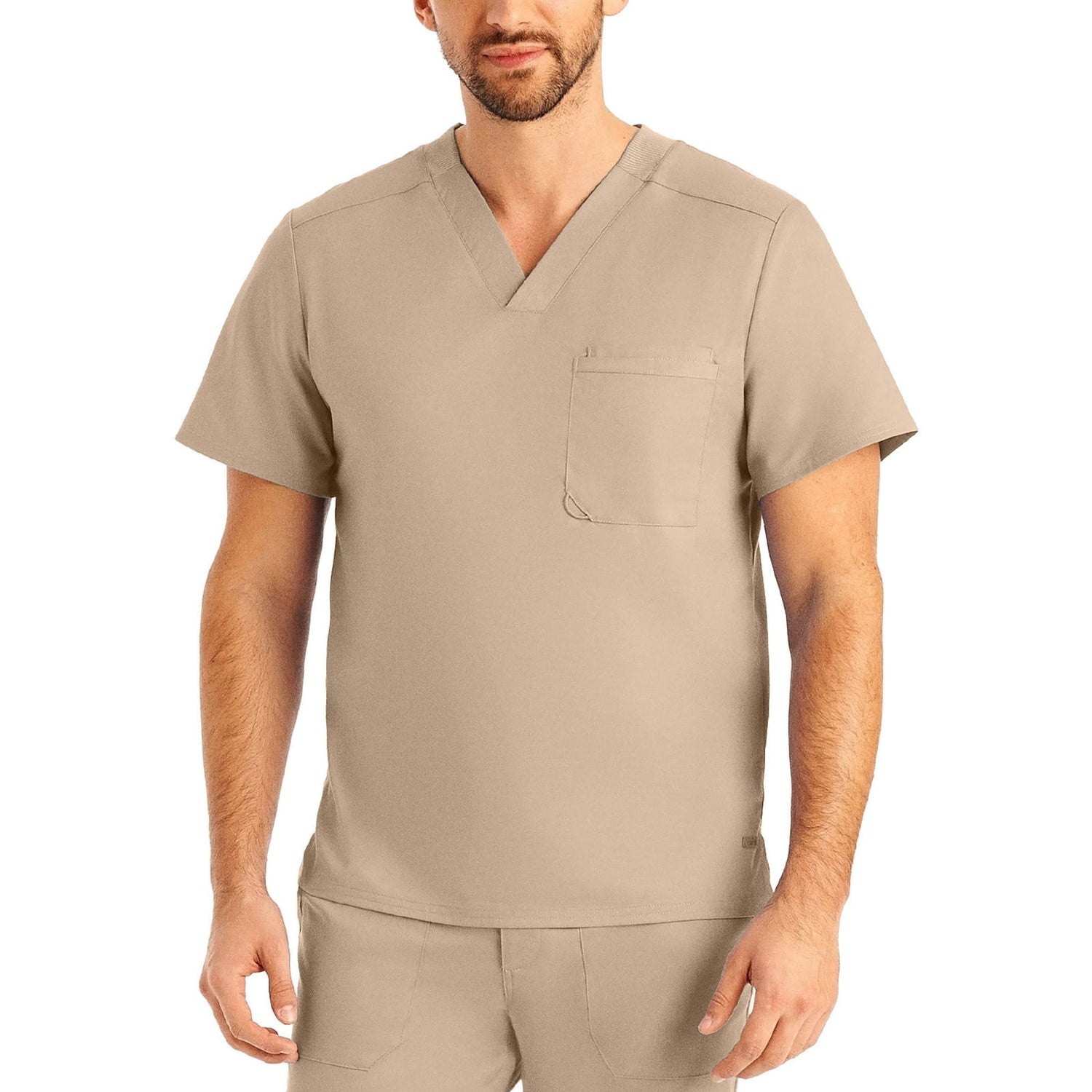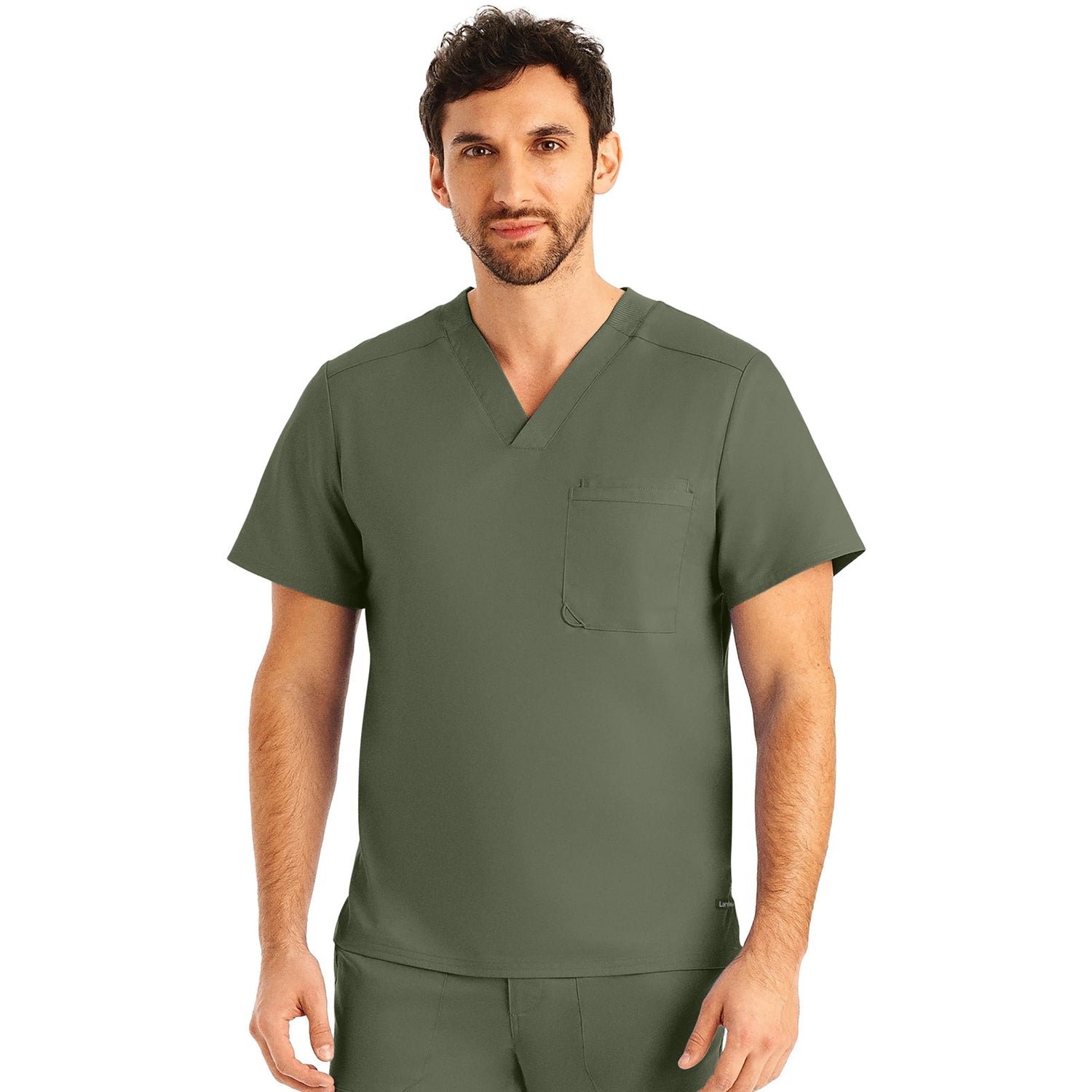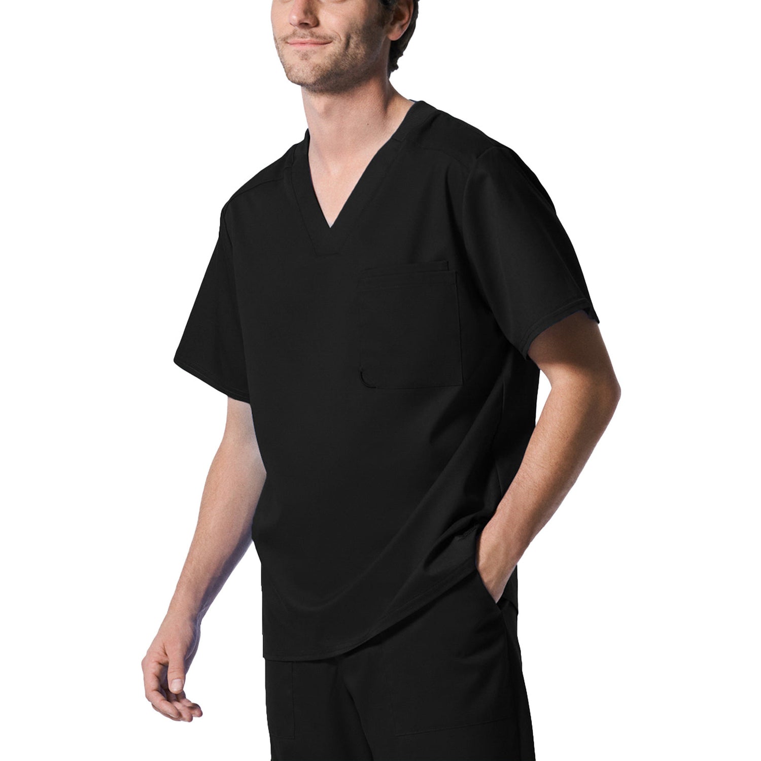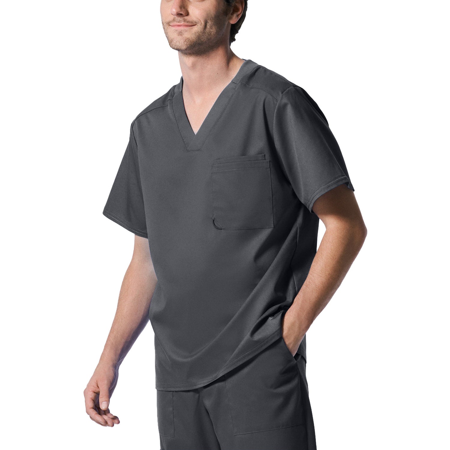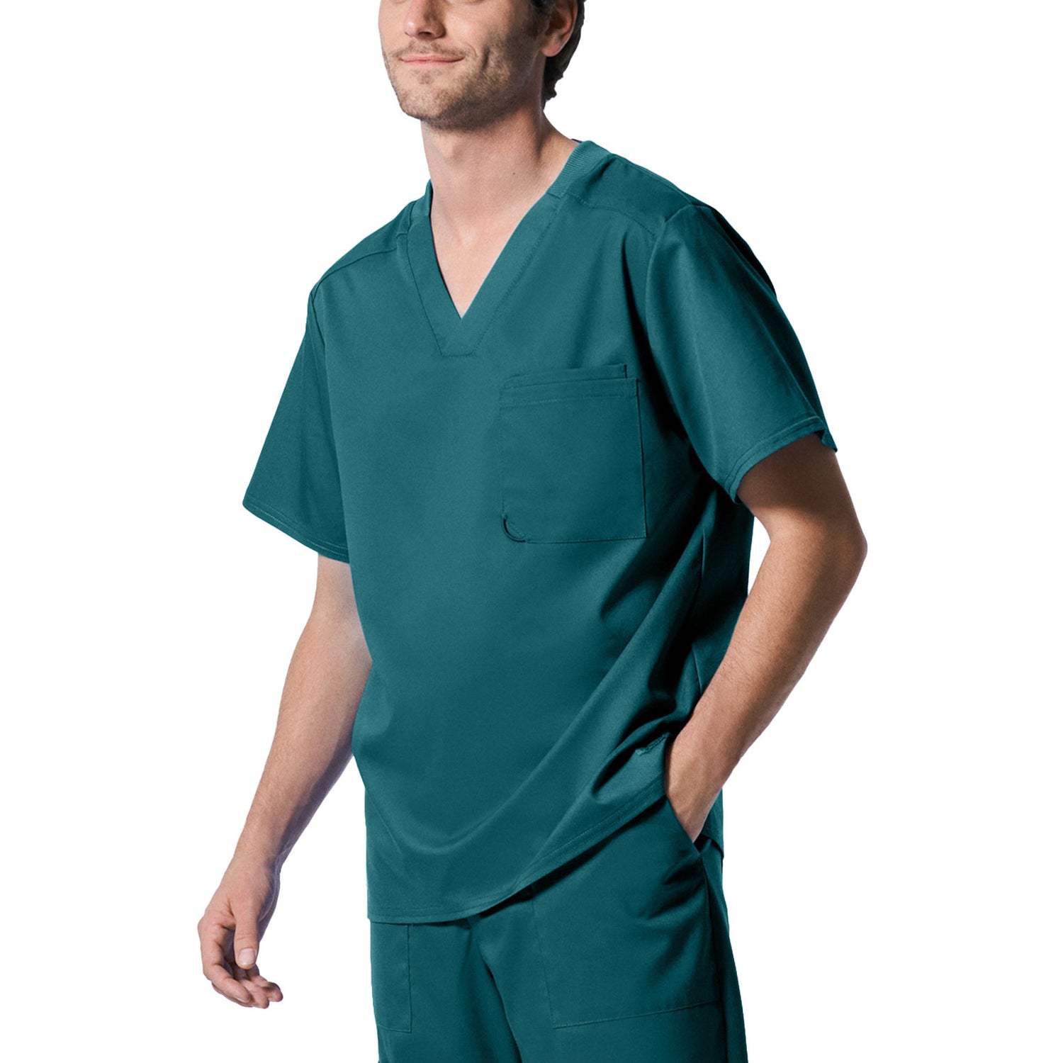 Upgrade your workwear with this versatile men's fit v-neck scrub top, designed for both style and comfort. The modern, tapered fit flatters your shape while allowing for unrestricted movement, thanks to the 2-way stretch fabric. A rib-knit neckline adds a touch of sophistication and enhances mobility, while side vents ensure breathability throughout your shift. The double chest pocket with a bungee loop keeps your essentials secure and easily accessible. Whether you prefer it untucked, half-tucked, or fully tucked, this top offers a polished and professional look. Experience the perfect blend of fashion and function with this fade-resistant and wrinkle-resistant scrub top.