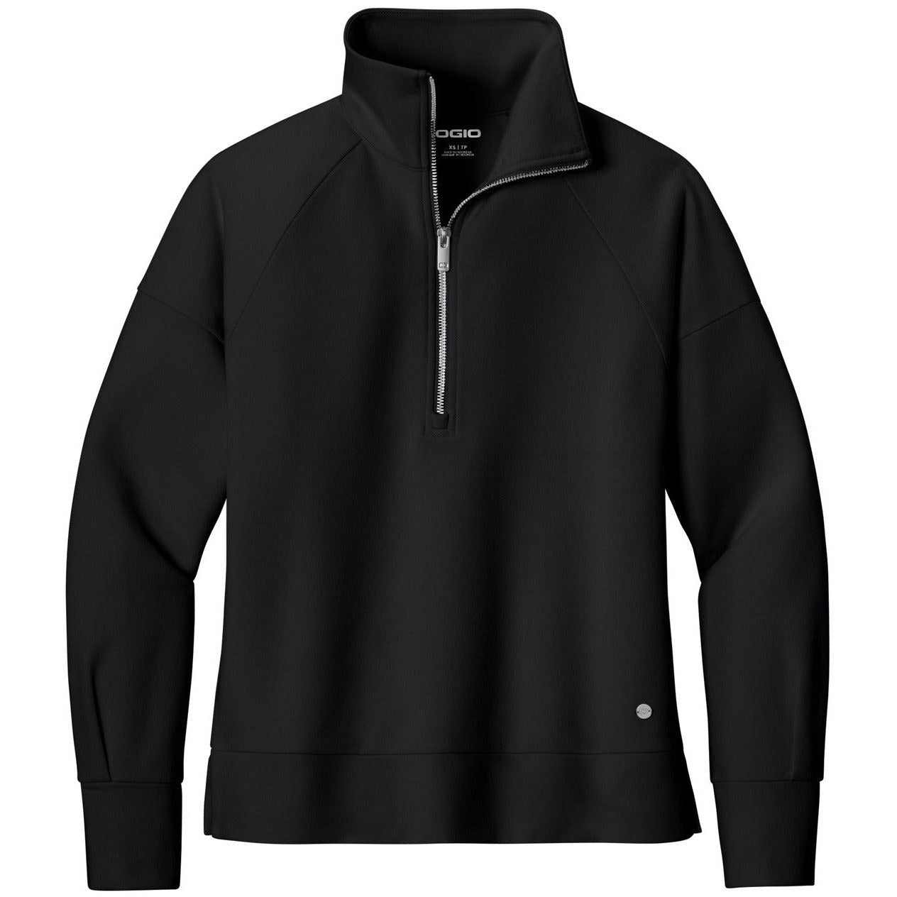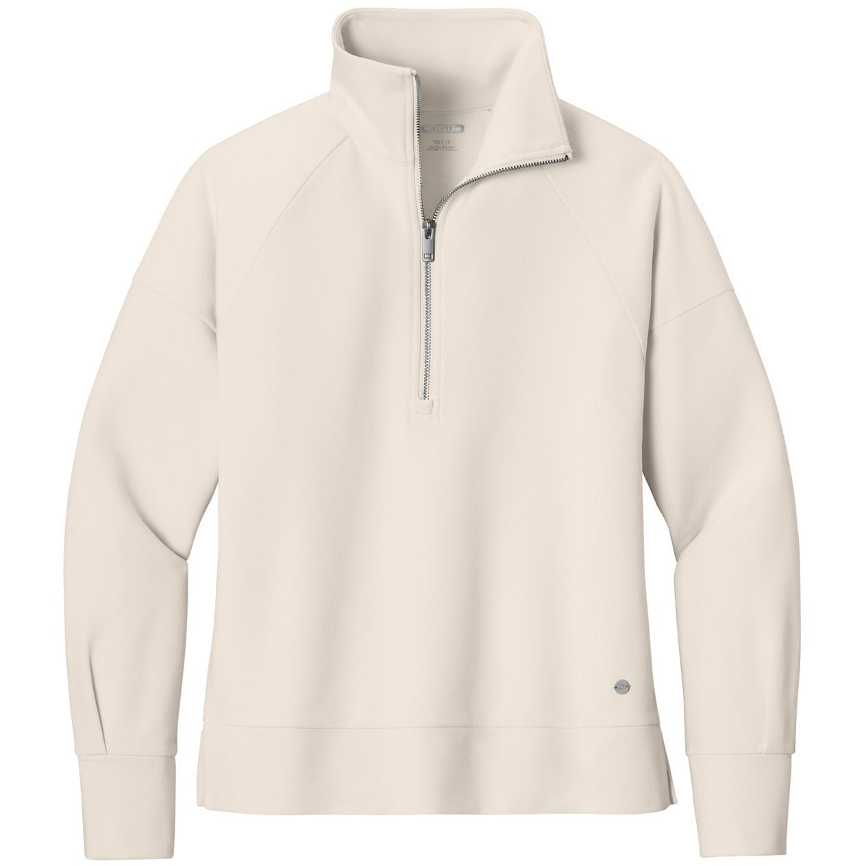 Whether worn after training or as a corporate layer, this 1/2-zip offers casual-comfort perfection. 7.1-ounce, 57/38/5 modal/polyester/spandex Metal zipper and O icon metal pull Drop shoulder Blouson sleeves Banded hem with side vents Metal die-cut O icon at hem