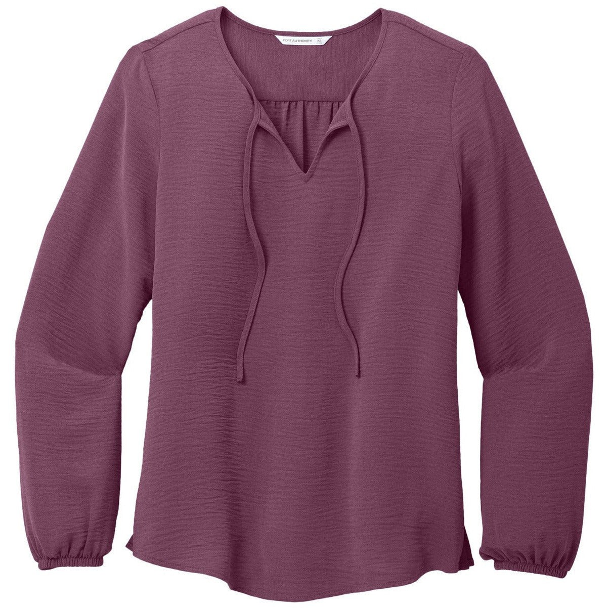 A fresh neckline with tie gives this comfortably flowy blouse a sophisticated look. 4.5-ounce, 100% polyester textured crepe Open neck with self-fabric tie Elastic cuffs Side slits